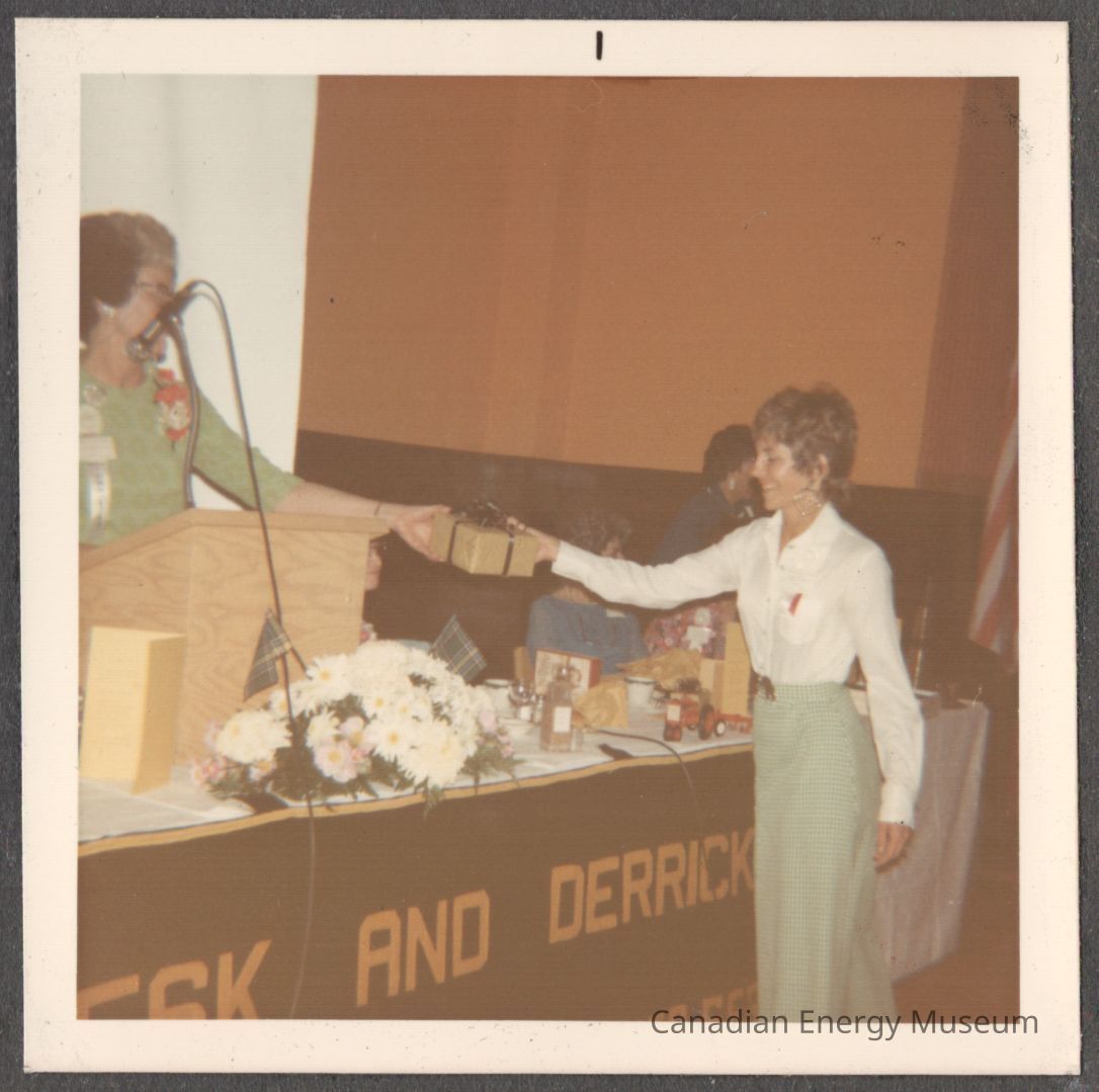 [Photo] Lady Receiving a Gift from Lady at Podium, Association of Desk and Derrick Clubs, Square, White Border, c.1972Entry/Object ID