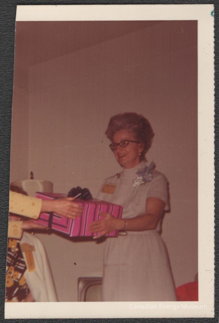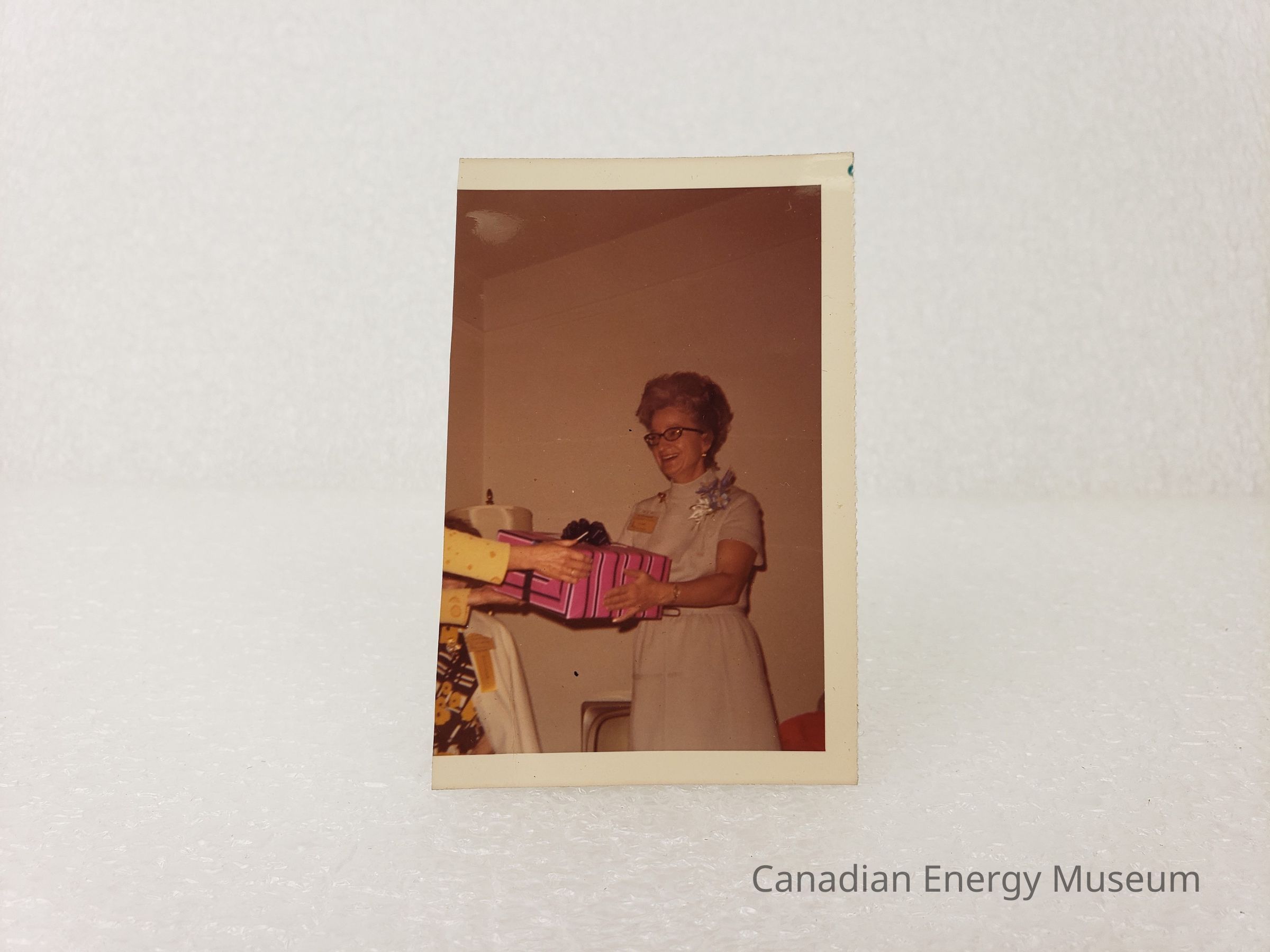 [Photo] Lady Receiving Pink and Blue Wrapped Gift, Cropped, Association of Desk and Derrick Clubs, Square, White Border, c.1972Entry/Object ID