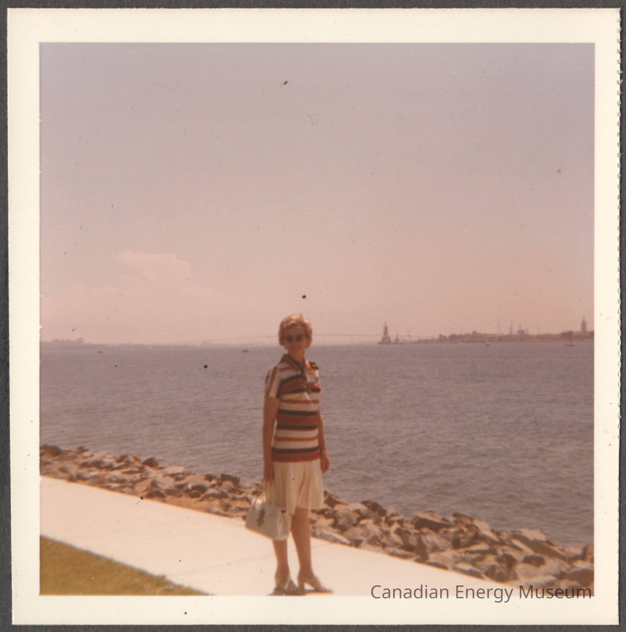 Description: The lady is dressed in a red, black, and white striped polo shirt and white skits, and is holding a white handbag. The path she is standing on is against a large rock bank on the right, separating it from the body of water (likely San Diego Bay). In the background is the skyline of a city, with the silhouette of a bridge in the centre directly behind the lady. Taken during the 1971 Association of Desk and Derrick Clubs of North America's 20th Annual Convention in San Diego.