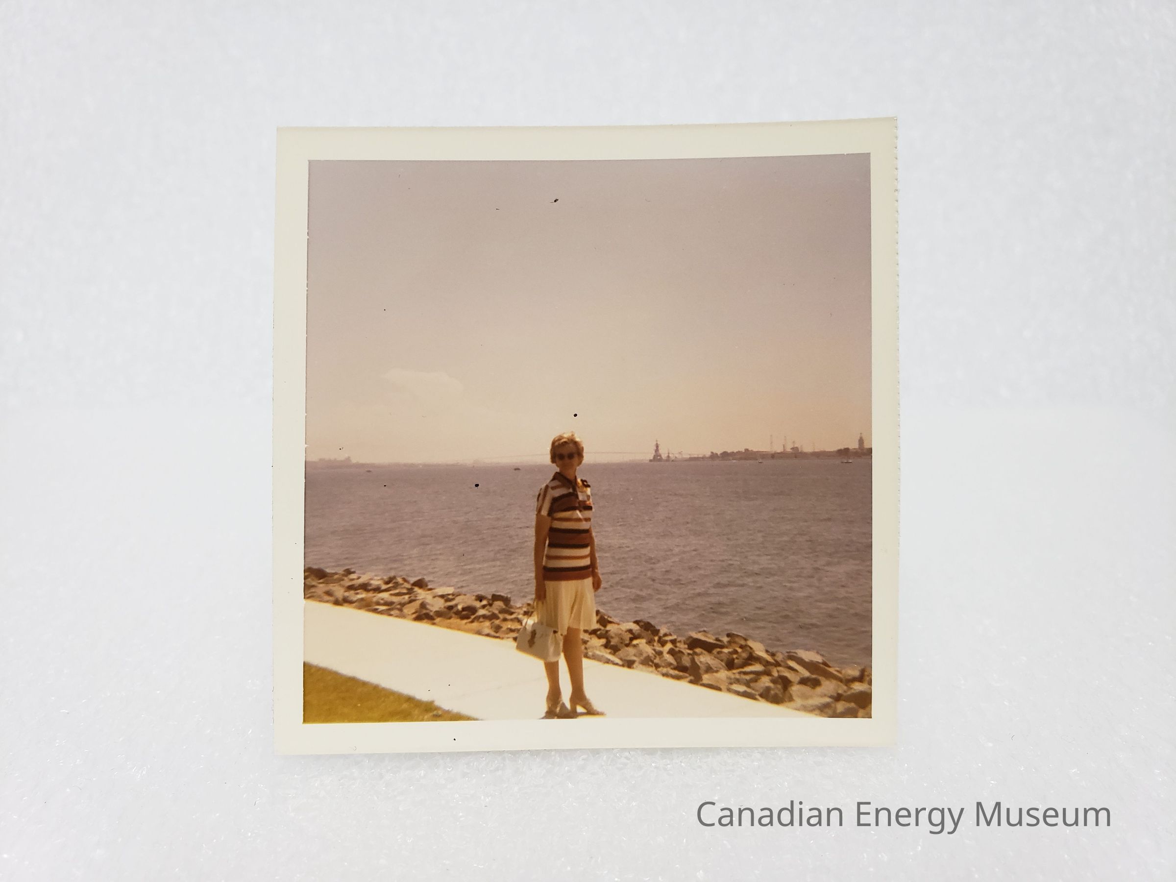 [Photo] Lady Standing on Waterfront Path with Bridge in Background, Instant Film, Square, c.1971Entry/Object ID