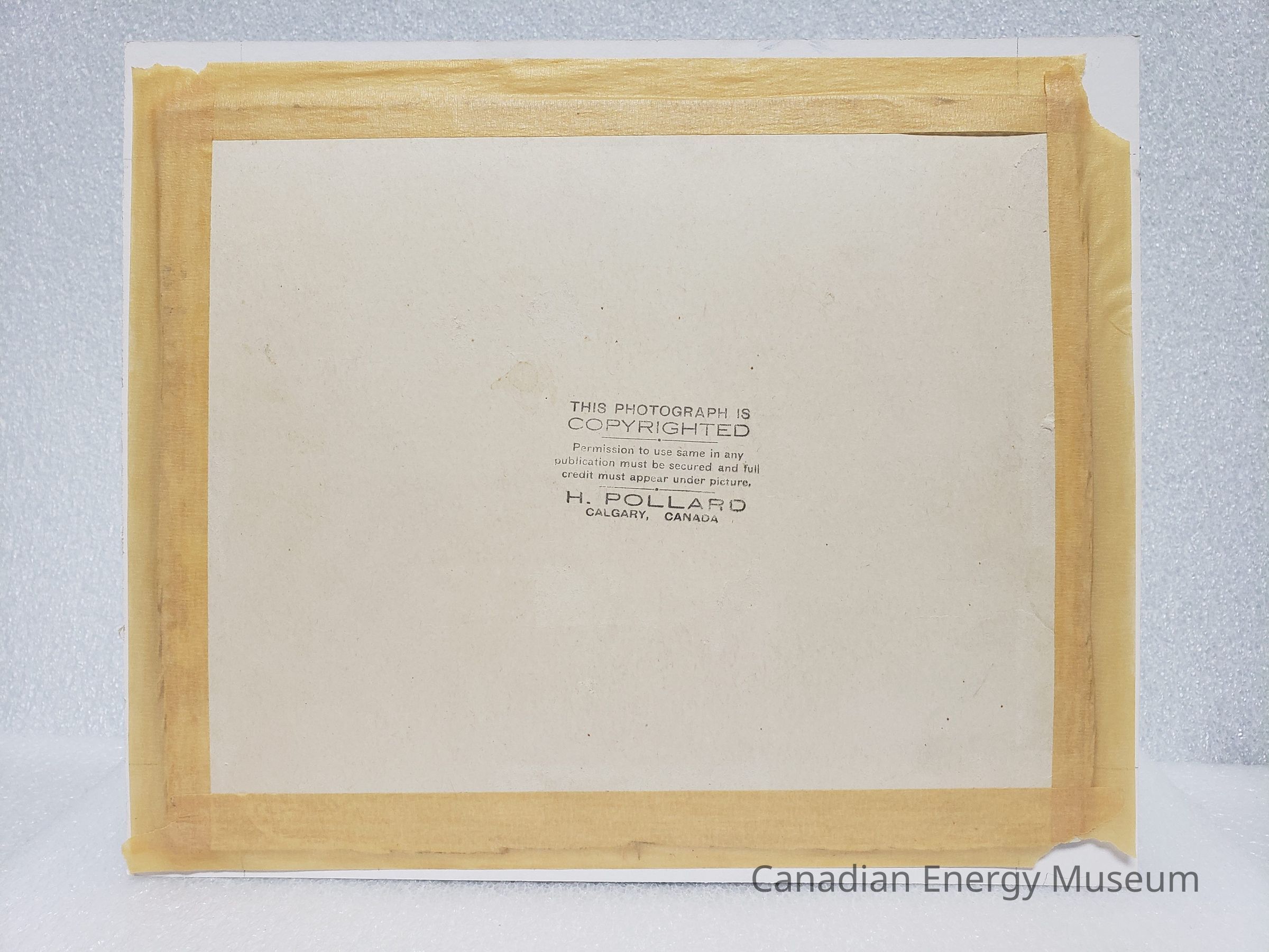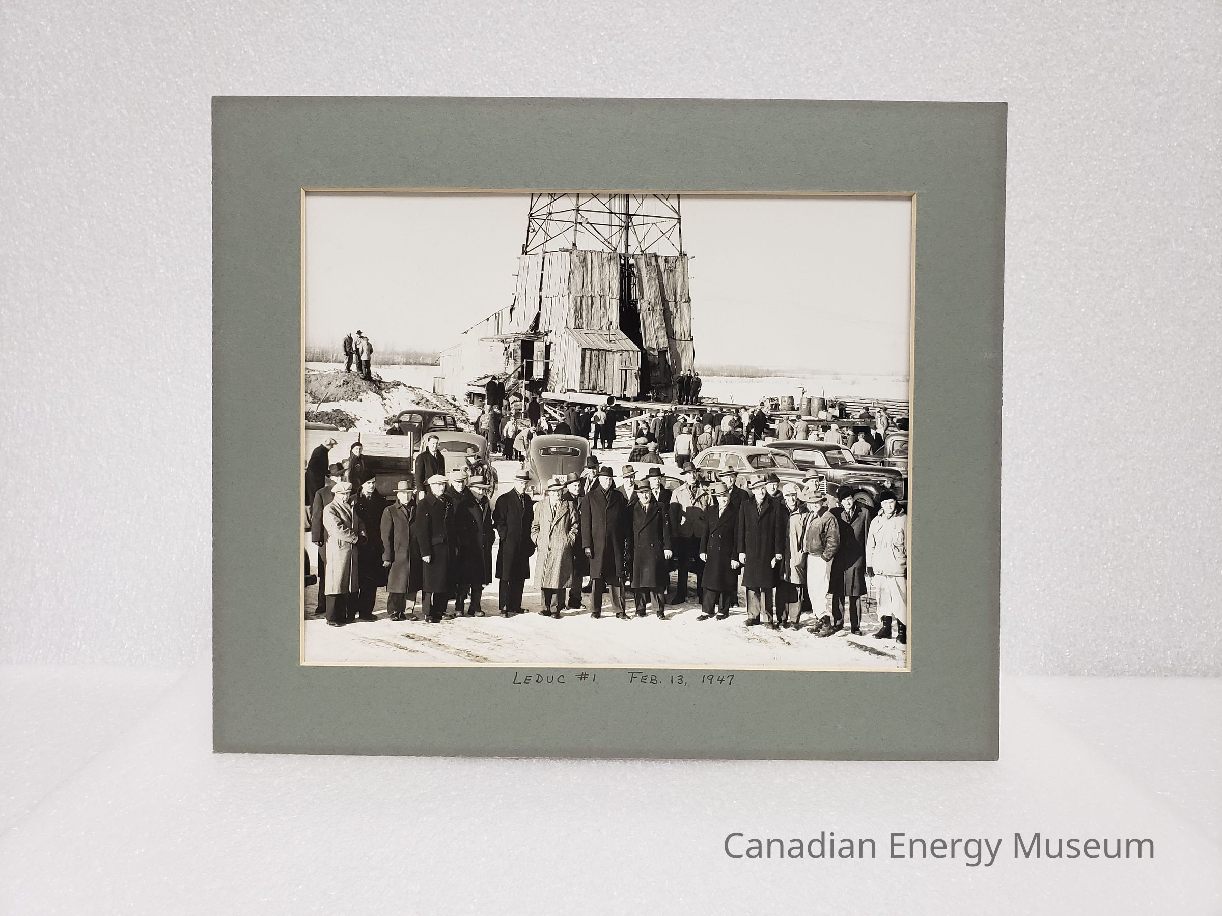 The print is mounted within a grey matte frame, and handwritten in black ink on the bottom of the frame is "LEDUC #1 FEB. 13, 1947". On the reverse of the frame is a studio stamp reading "THIS PHOTOGRAPH IS COPYRIGHTED; Permission to use in any publication must be secured and full credit appear under picture.; H. POLLARD; CALGARY, CANADA".Collection