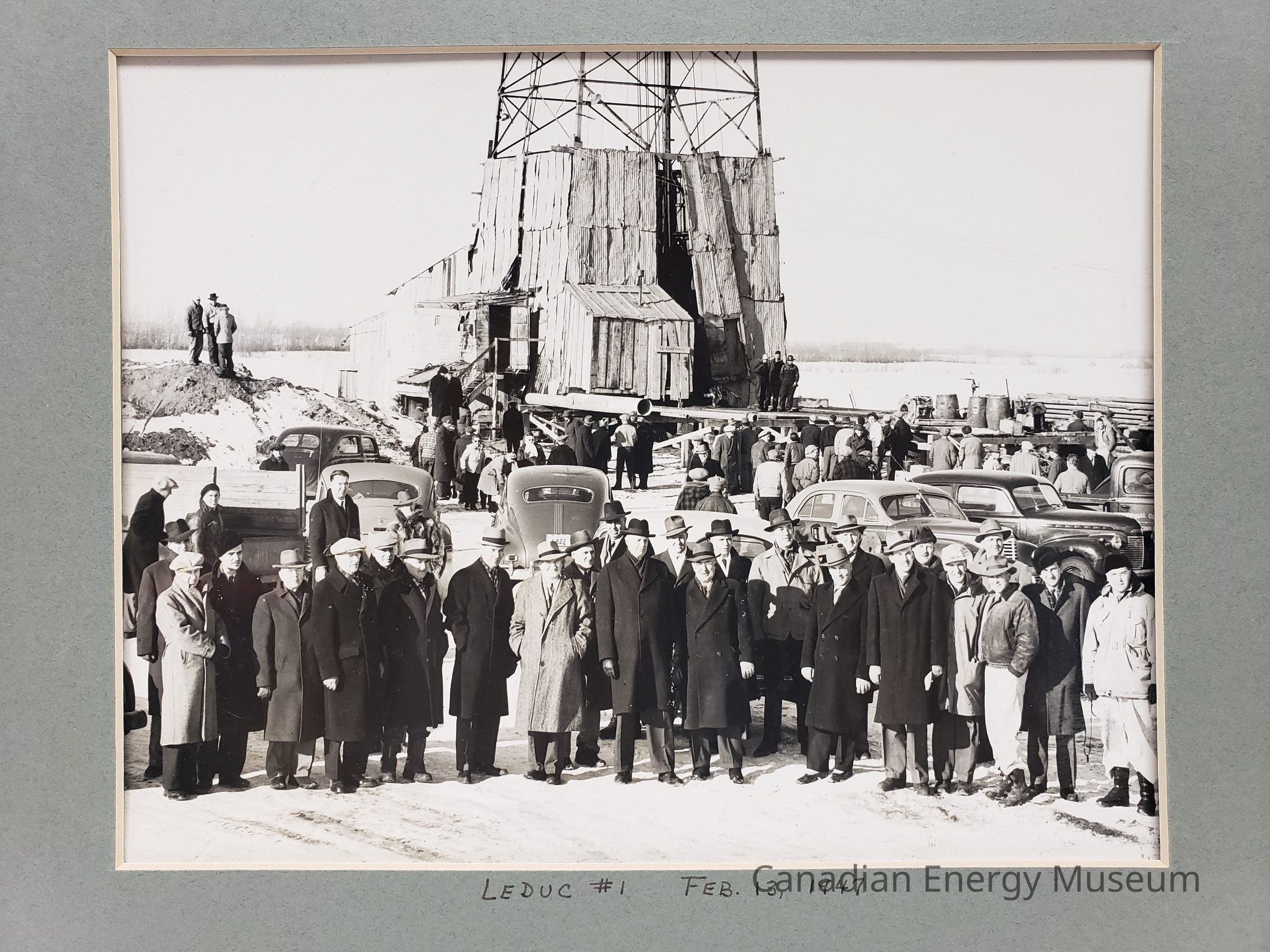 A large black and white photographic print, featuring a large group of well-dressed men (TWENTY-FIVE) in long winter coats and hats, facing the camera; with another crowd in the midground facing away from the camera towards the ledic #1 rig (of note: a group of three men standing on a small dirt pile to the left of the image; two men in black coats standing slightly higher than the rest to the left at the base of Leduc #1; and three workers standing on a raised platform to the right of Leduc #1's base). Between the two groups are parked SIX cars and TWO trucks. Behind both groups is the base of the Leduc #1 rig. The ground is covered in snow/ice, and in the background is snow/ice covered field and lines of trees.