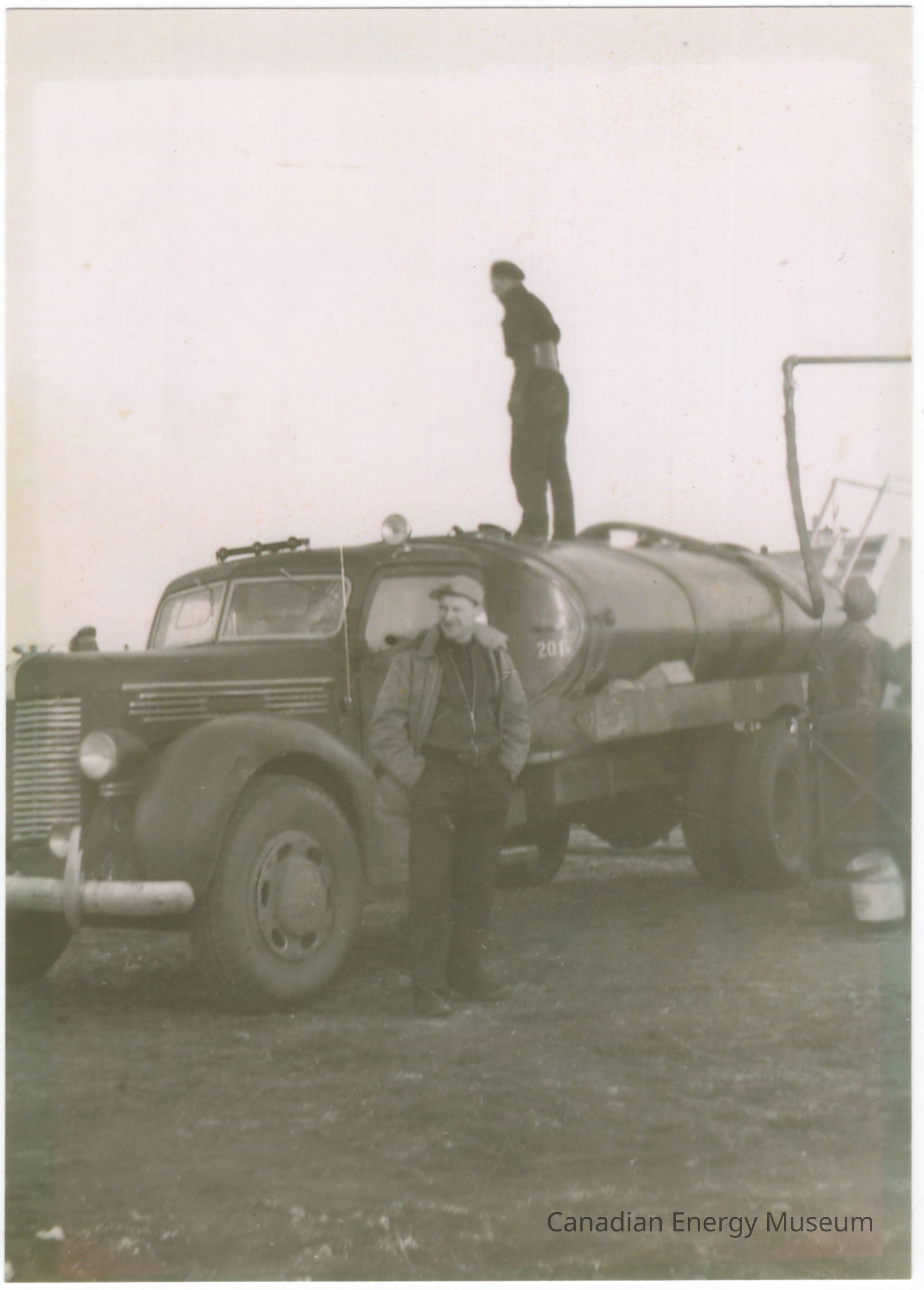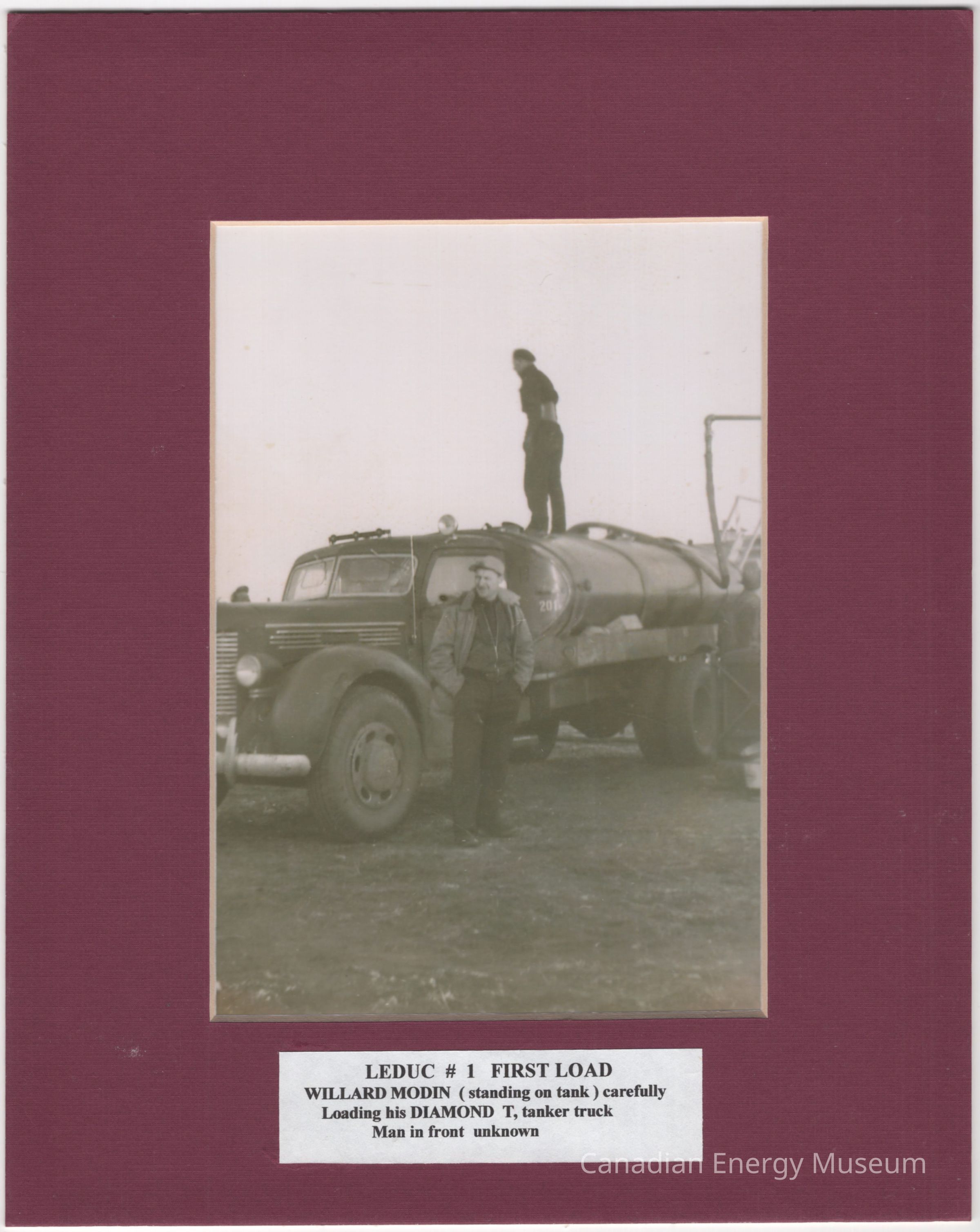 Photograph Description: Two men with an oil tanker truck holding the first load of oil from Leduc #1. The first man (Willard Modin) is seen standing on top of his Diamond T tanker truck, facing away from the camera. The second man is unnamed and stand in front of the tanker looking to the left of the camera. A third man stand off to the right of the photograph looking up, and the head of a fourth man is seen just over the hood of the tanker looking up at Modin.