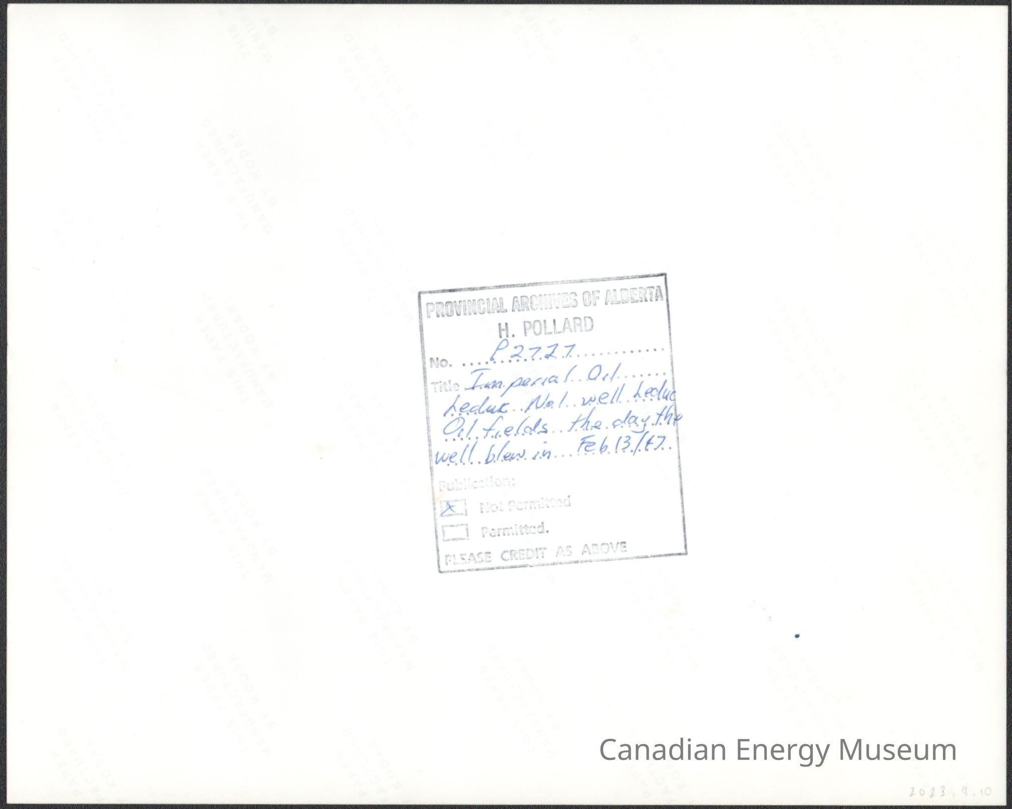 Image provided by the Provincial Archives of Alberta, No. P2727, with the title "Imperial Oil Leduc No I well Leduc Oil fields the Day the Well Blew In Feb 13 / 47".Cataloged By