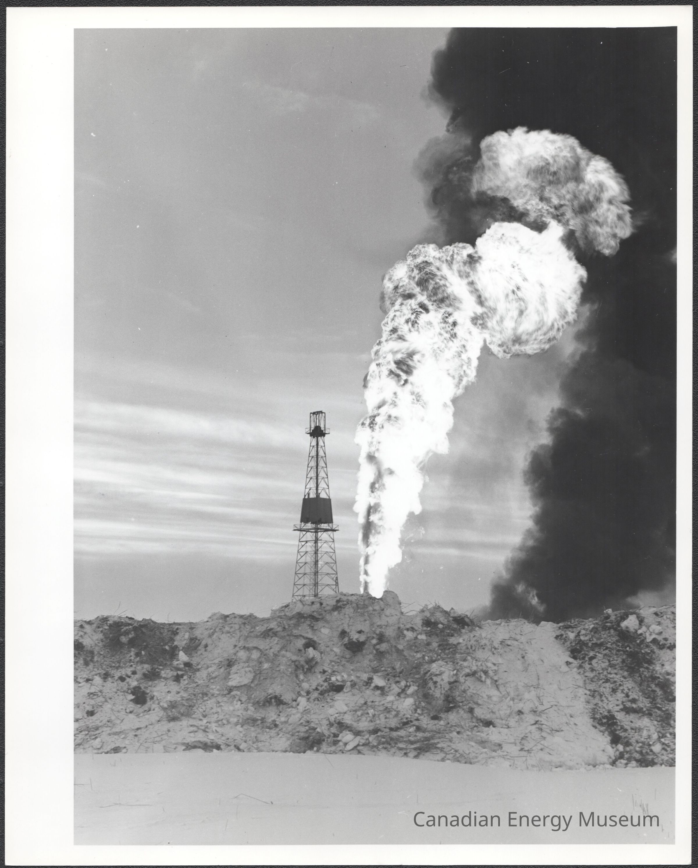 A large portrait-orientated photographic print of Leduc #1 with the fire flare and large black smoke cloud. Derrick is in the background, with a large rise of dirt obscuring the view of the base and a small sliver of snow-covered grass in the foreground. To the right of the derrick is a large flare reaching almost twice the height of the derrick, and to the right of that is a large black smoke cloud that takes up the right 1/3 of the image.