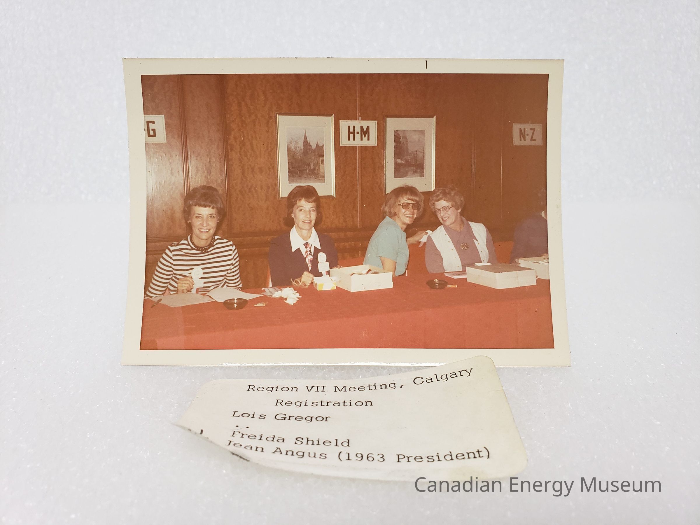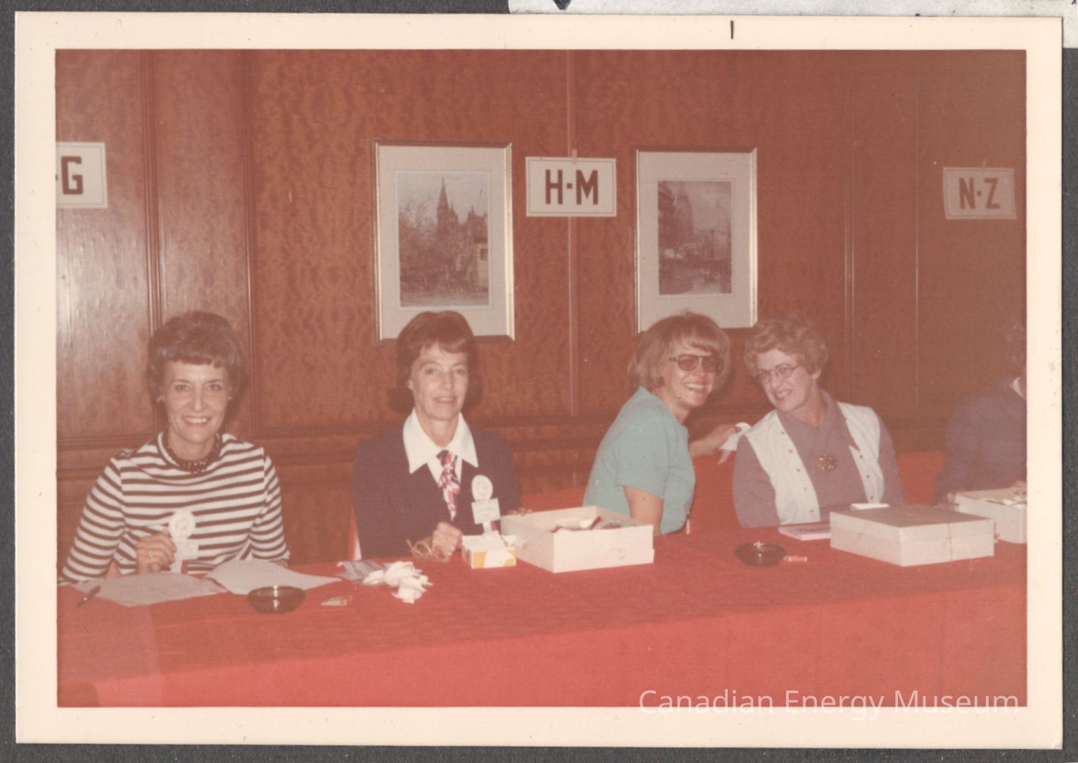Description: Seated at a long, panel table with a red tablecloth are four women, from left to right: A lady in a black and white striped long-sleeve top, black necklace, and white and red hat corsage/brooch (similar to one in our collection, 2004.2.206); a lady in a navy-blue v-nack sweater over a white collared shirt, red/white/blue necktie, and same corsage/brooch as previous; a lady turned to the right-of-frame in a turquoise short-sleeve top and tinted glasses; and a lady in an open white sweater-vest over a mauve long-sleeve collared shirt and large necklace/brooch. The fifth figure is wearing a dark-blue long-sleeve shirt/blazer. On the table in front of the ladies are three white boxes, two brown glass trays/ashtrays, and assorted paper items. Behind them is a wood-panelled wall (dark-wood raised/overlay panel wainscoting style), on which are two framed images and three letter cards ("-G", "H-N", and "N-Z").