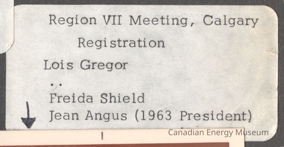 Accompanying the photograph (via proximity on the scrapbook page and context) is a white adhesive label with the typewritten text "Region VII Meeting, Calgary; Registration; Lois Gregor; ..; Freida Shield; Jean Angus (1963 President)".