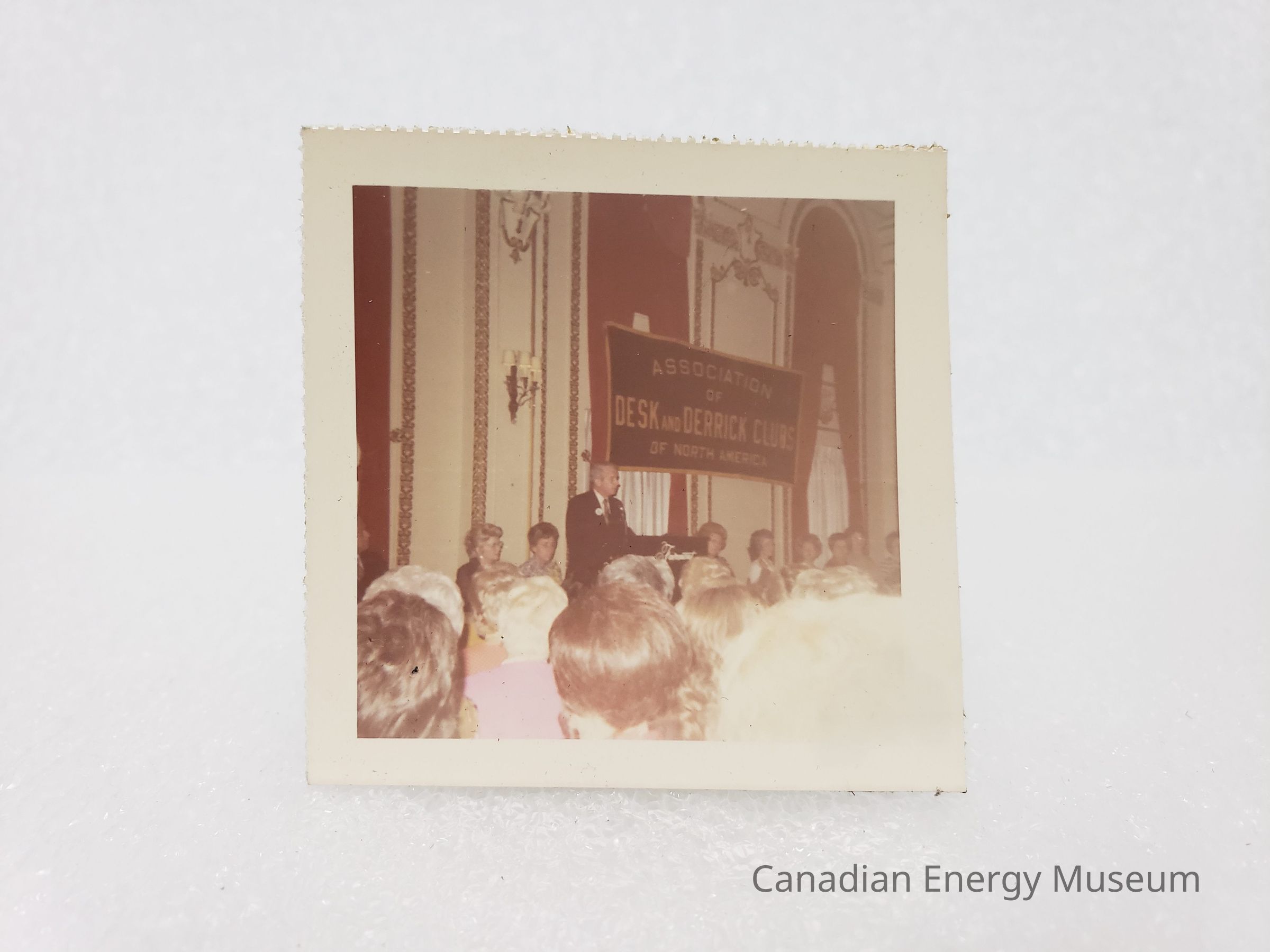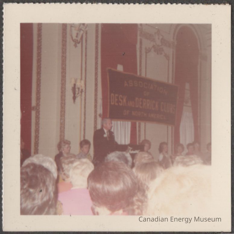 Description: A crowd of heads (approximately ten visible) facing away from the camera, towards a male speaker standing at a podium. The man is dressed in a black suite with a white shirt, tie, and a white corsage. Seated behind the man are a line of approximately nine women facing towards the audience. Behind them is a wall with three visible windows adorned with white curtains and heavy red drapes. The wall has a wall sconce and gold detailing. On the wall is also a large black and yellow banner reading "ASSOCIATION OF DESK AND DERRICK CLUBS OF NORTH AMERICA".
