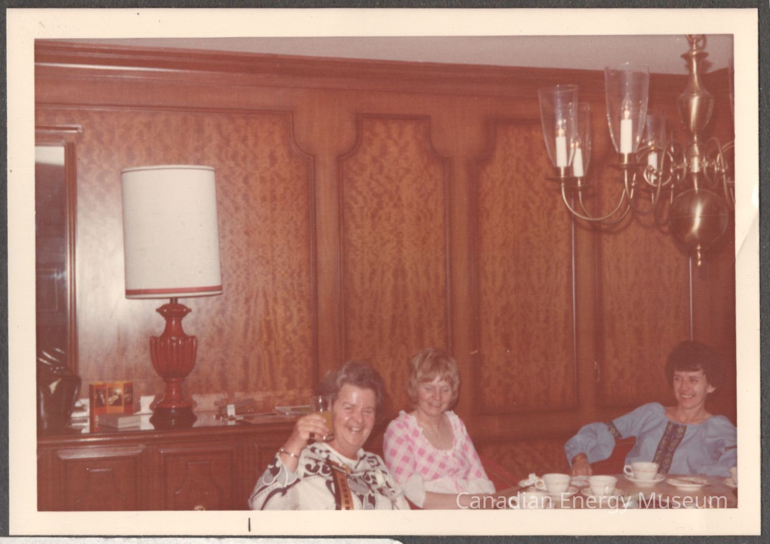 [Photo] Marie Anne White, Donna Barrett, and Nadia Korpus Seating in Dininf Room, Region VII Meeting Calgary, Association of Desk and Derrick Clubs, Landscape, White Border, c.1972Entry/Object ID