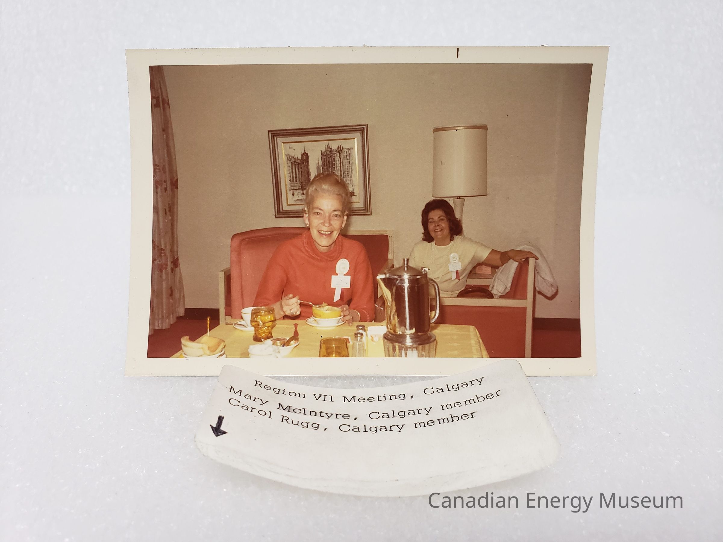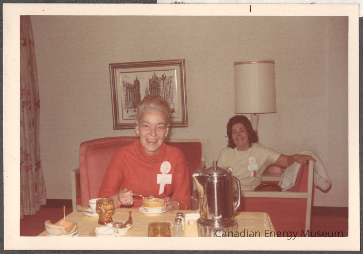Description: In the foreground is the first lady, dressed in a red long-sleeve top with a white and red hat corsage/brooch (similar to one in our collection, 2004.2.206). She is seated in a tall-back red chair, at a small square table, eating a grapefruit (or similar citrus fruit), and is looking at the camera. The table has a pale-yellow tablecloth, on which are a coffee/tea decanter, tea/coffee cup and saucer, two brown-glass cups, salt and pepper dispensers, a bowl with a cantaloupe in it, and a bowl of condiments. To the right-of-frame in the background is the second lady, dressed in a short-sleeve white/cream top, with a long, double-loop pearl necklace and a similar corsage/brooch to the first lady. She is seated on one of two red-orange couches with white/cream trim. Behind her is a tall table lamp. In the centre-background is the second couch, above which is a framed piece of artwork. To the left-of-frame is visible tan and red flower-patterned drapes. The walls are white/cream and the floor is red carpet.