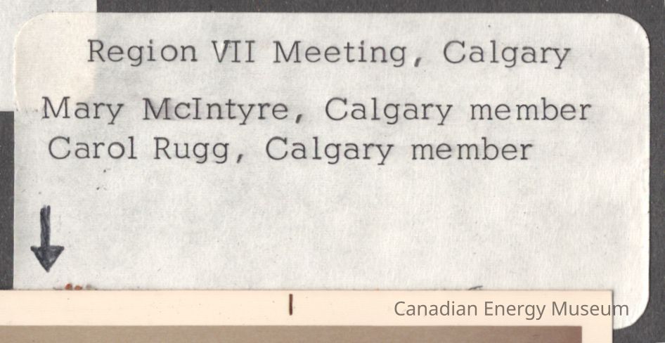 Accompanying the photograph (via proximity on the scrapbook page and context) is a white adhesive label with the typewritten text "Region VII Meeting, Calgary; Mary McIntyre, Calgary member; Carol Rugg, Calgary member".