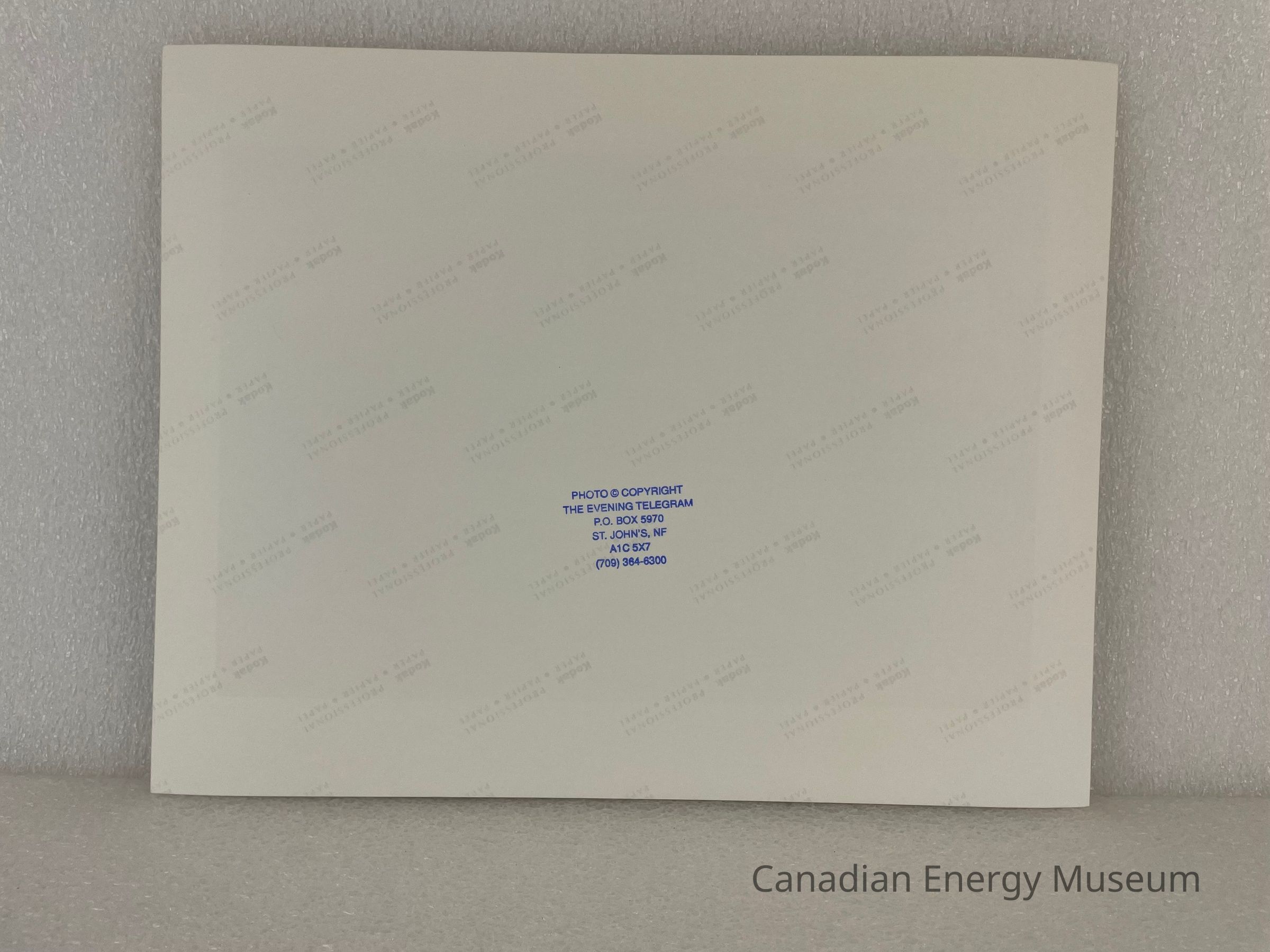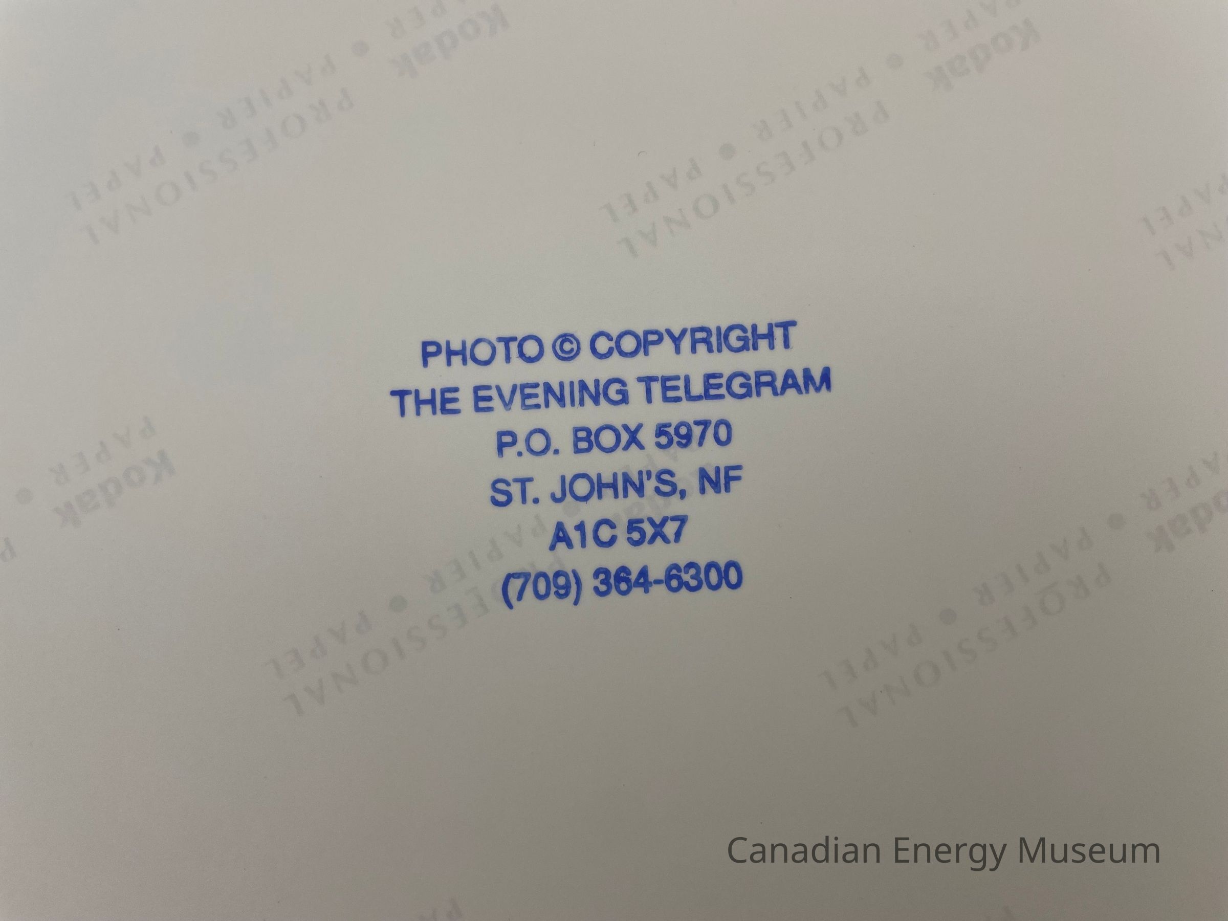 On the reverse is a blue ink stamp reading from top to bottom, "PHOTO © COPYRIGHT / THE EVENING TELEGRAM / P.O. BOX 5970 / ST. JOHN'S, NF / A1C 5X7 / (709) 364-6300". In light grey, a printed pattern runs across the back of the photograph reading, "Kodak Professional / PAPER . PAPIER . PAPEL".Collection