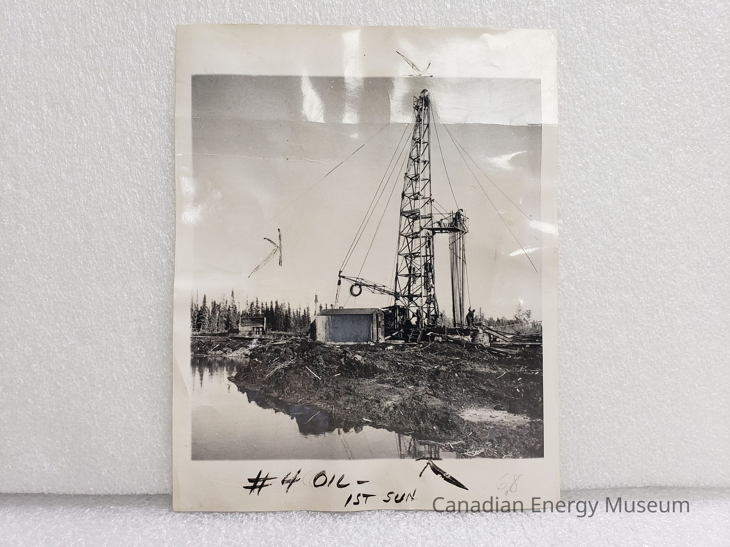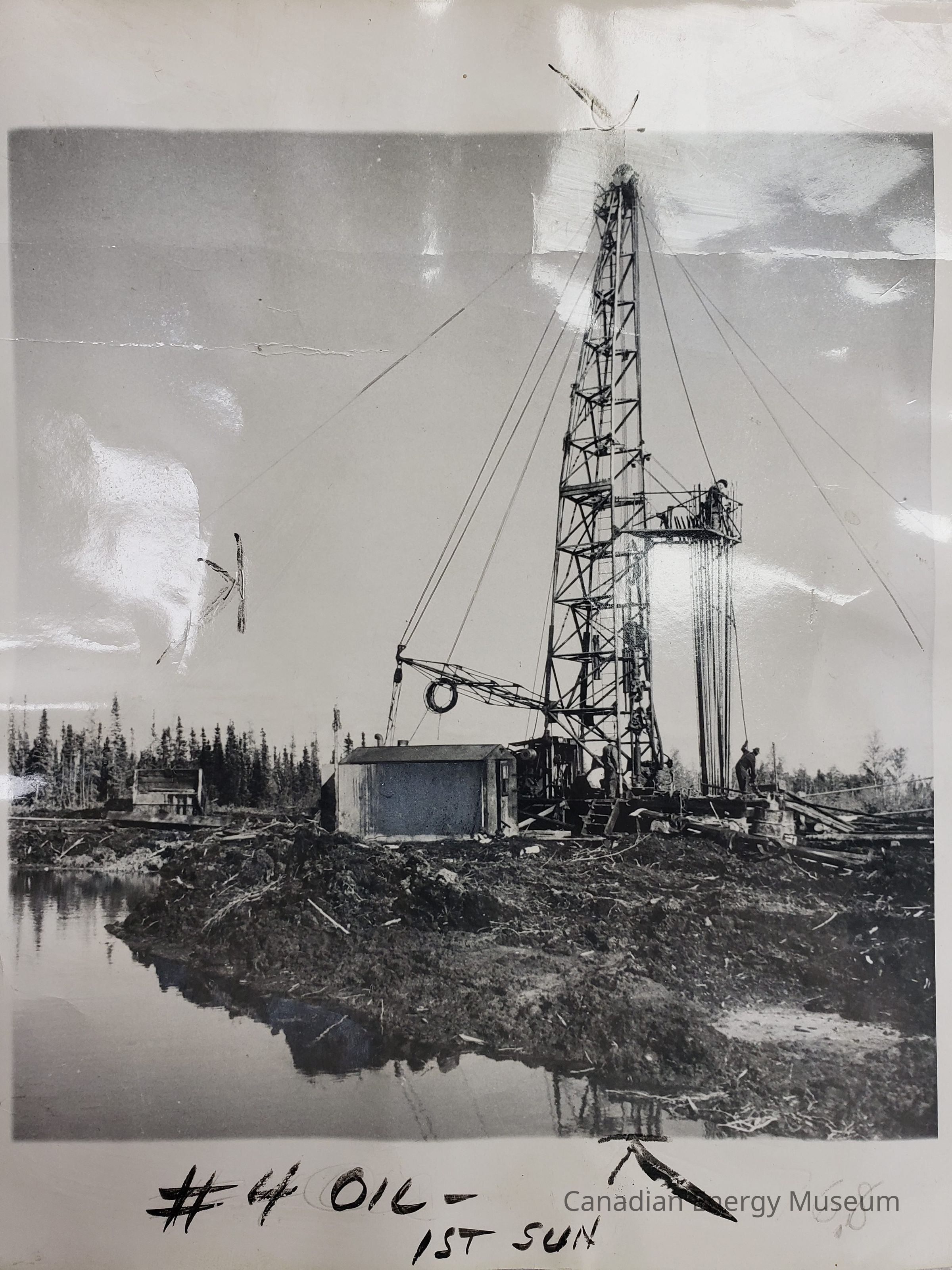 A medium-sized black and white photograph of a derrick at Normal Wells (according to text on back). Front reads "#4 OIL - 1ST SUN". Back reads "WIDE WORLD PHOTOS; PLEASE CREDIT; A-33334; (PART OF SERIES); OIL EPIC OF THE NORTHWEST; SET ORIGHT DOWN IN THE MIDDLE OF A SWAMP, AN OIL DERRICK AT NORMAN WELLS IS OPERATED BY A CANADIAN DRILLING CREW. SCORES OF NEW WELLS HAVE BEEN DUG IN THIS AREA, TO FEED OIL TO ALASKA.; 9908-w-9/22/43; CNFB (FS)(38) 11A; (SEE A-33329 FOR MAIN CAPTION); FOR RELEASE SATURDAY, SEPT. 25".Collection