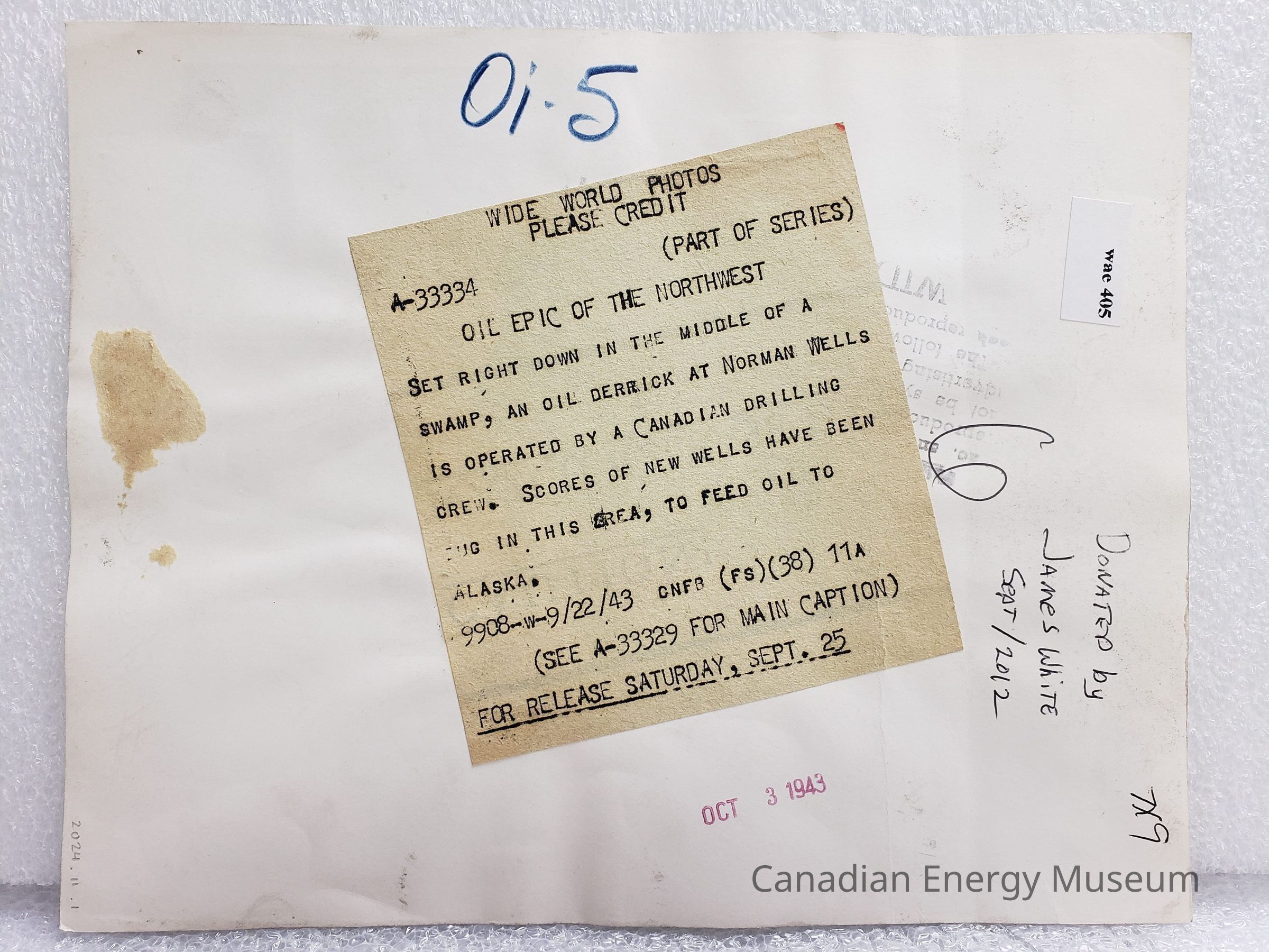 [Photo] "Oil Epic of the North", Norman Wells "#4 OIL - 1ST SUN", Wide World Photos, BW, 22 September, 1943Entry/Object ID