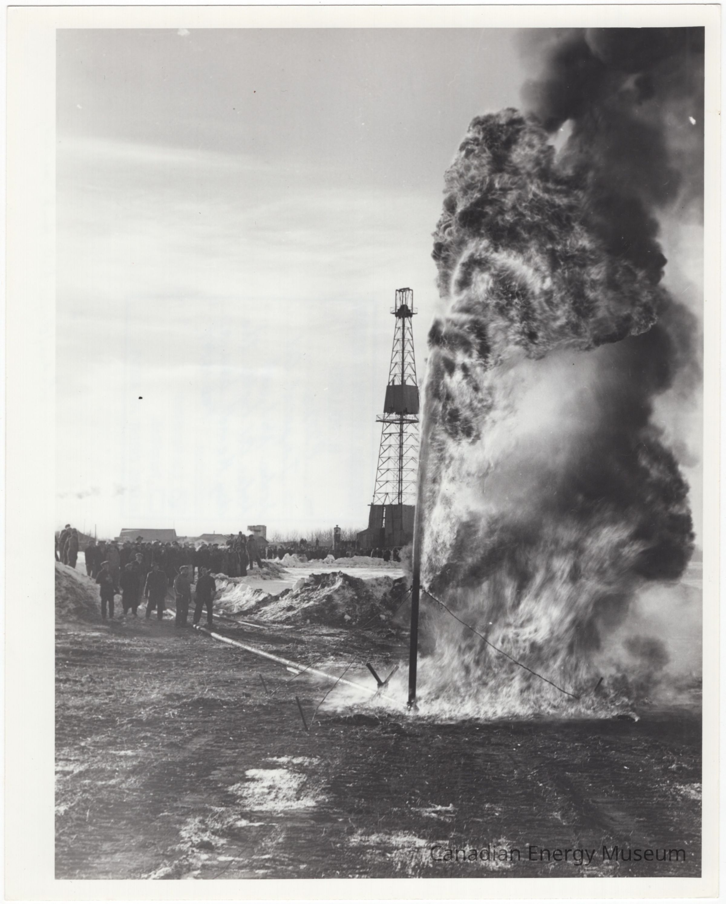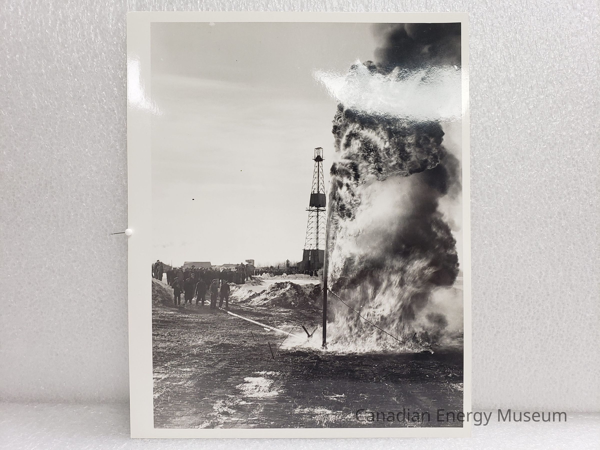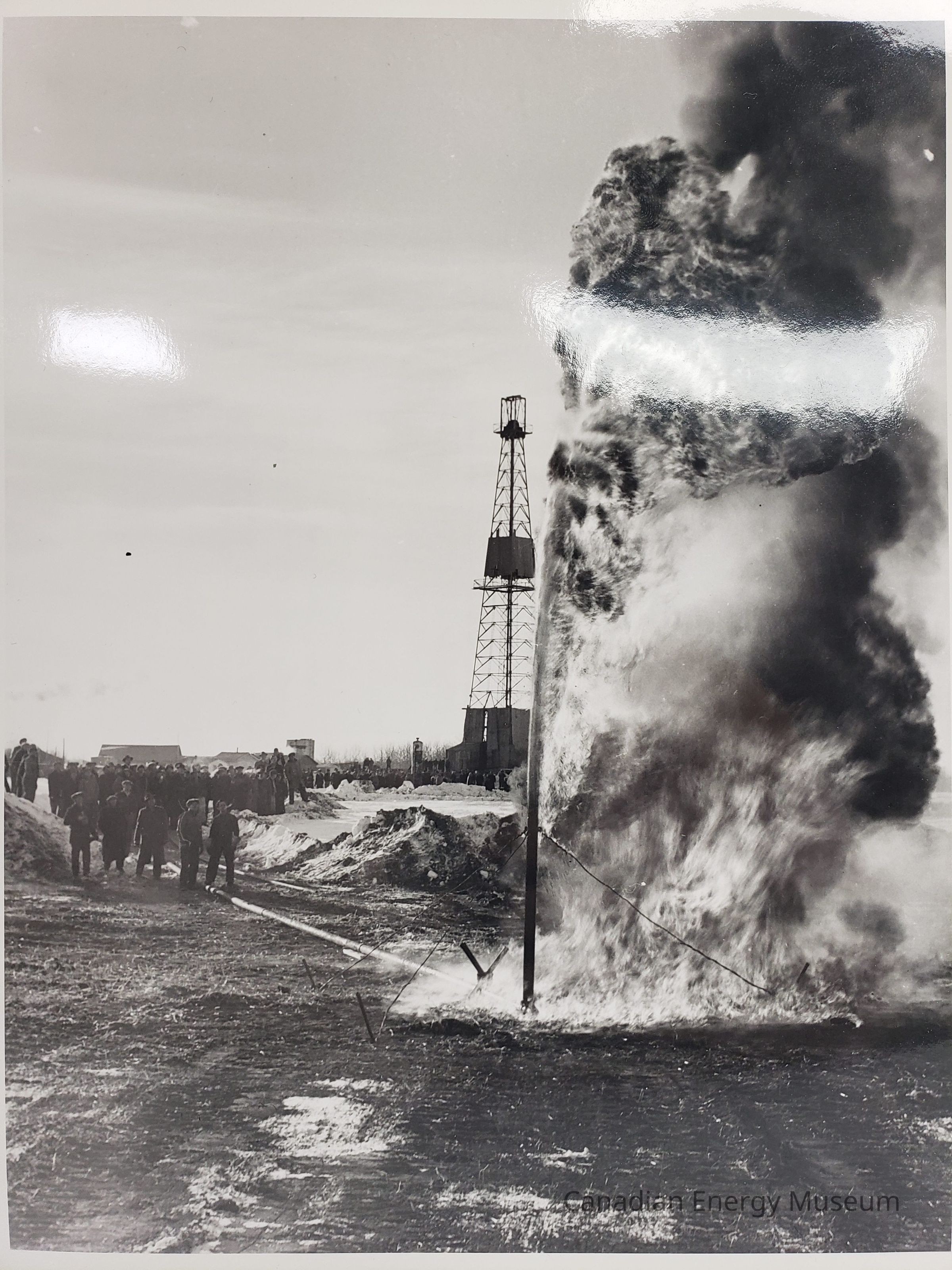 A large black and white (gloss) photograph of an active oil flare at Leduc #1, 13 February 1947. In the right section of the midground is the flames and smoke for the oil flare, filling the 3/4 of the right side of the image. In the centre background is the Leduc #1 oil derrick. To the centre-left of the midground through to the background are a crowd of figures facing the flare.
