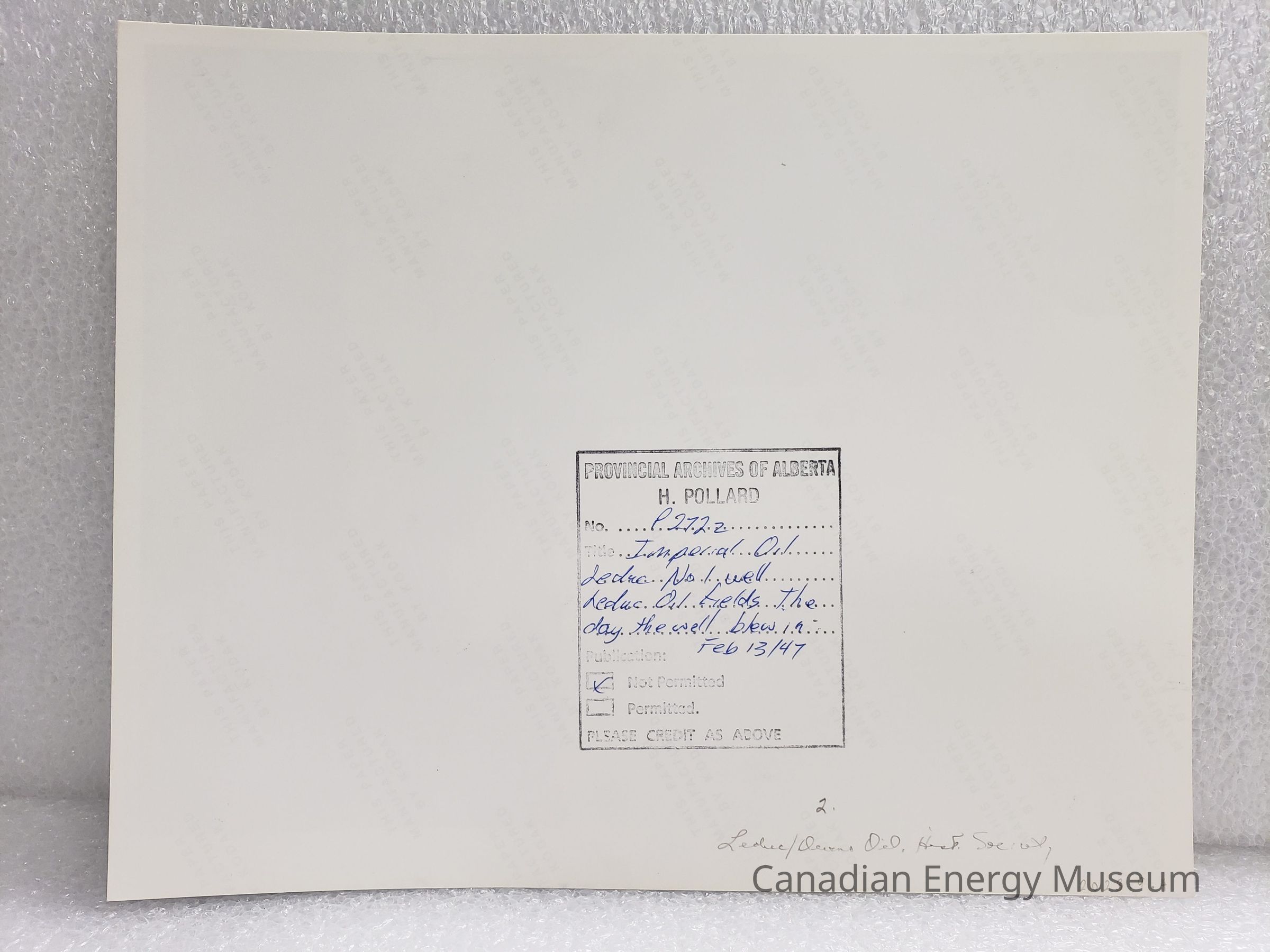 On the reverse is a black-ink stamp reading "PROVINCIAL ARCHIVES OF ALBERTA; H.POLLARD; No....; Title....; Publication:; Not Permitted; Permitted; PLEASE CREDIT AS ABOVE", all in a rectangular border. In blue ballpoint is the following text in the stamp's fields: "[No.] P272z; [Title] Imperial Oil Leduc No 1 well Leduc Oil fields The day the well blew in; Feb 13/47; x [Not Permitted]". Along the bottom-right edge is written in pencil "2.; Leduc/Devon Oil. Hist. Society".Collection