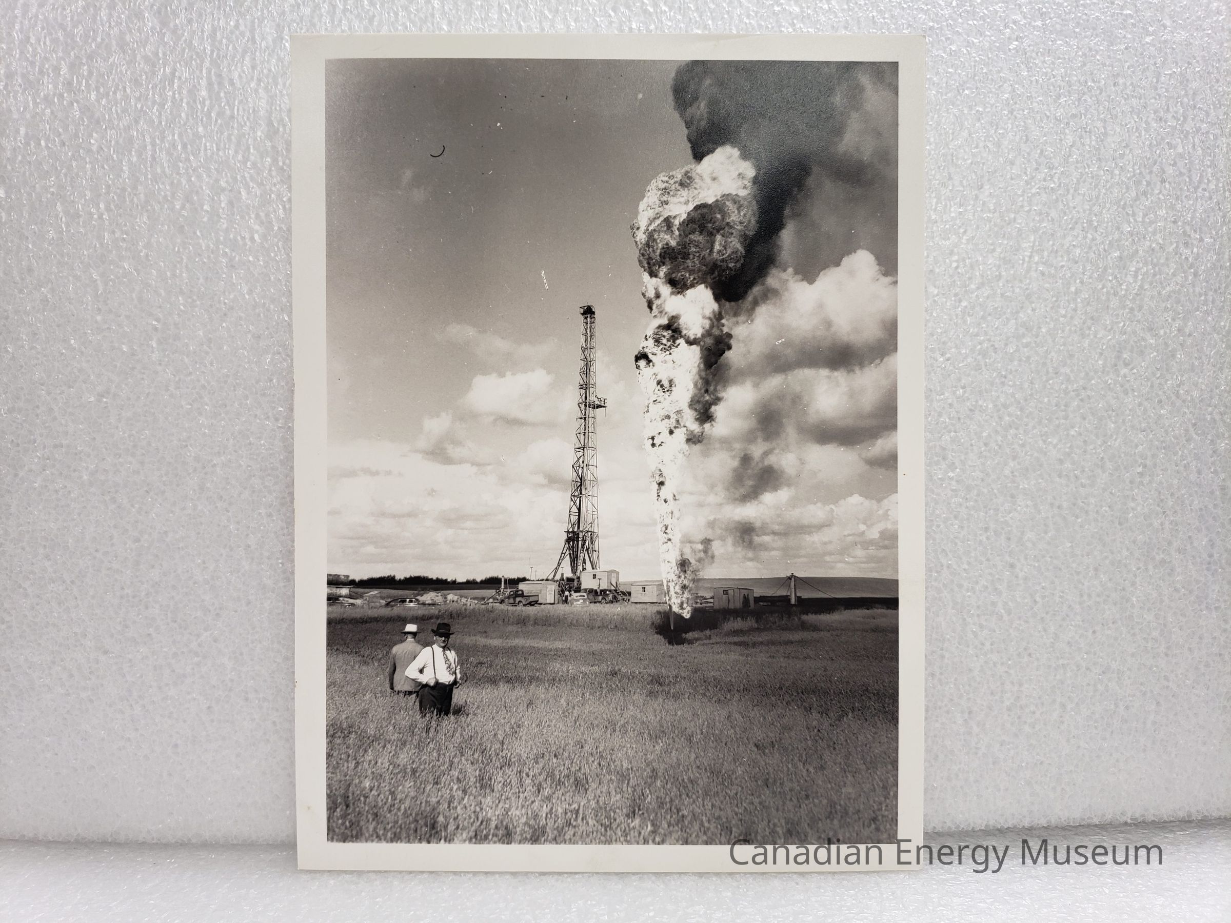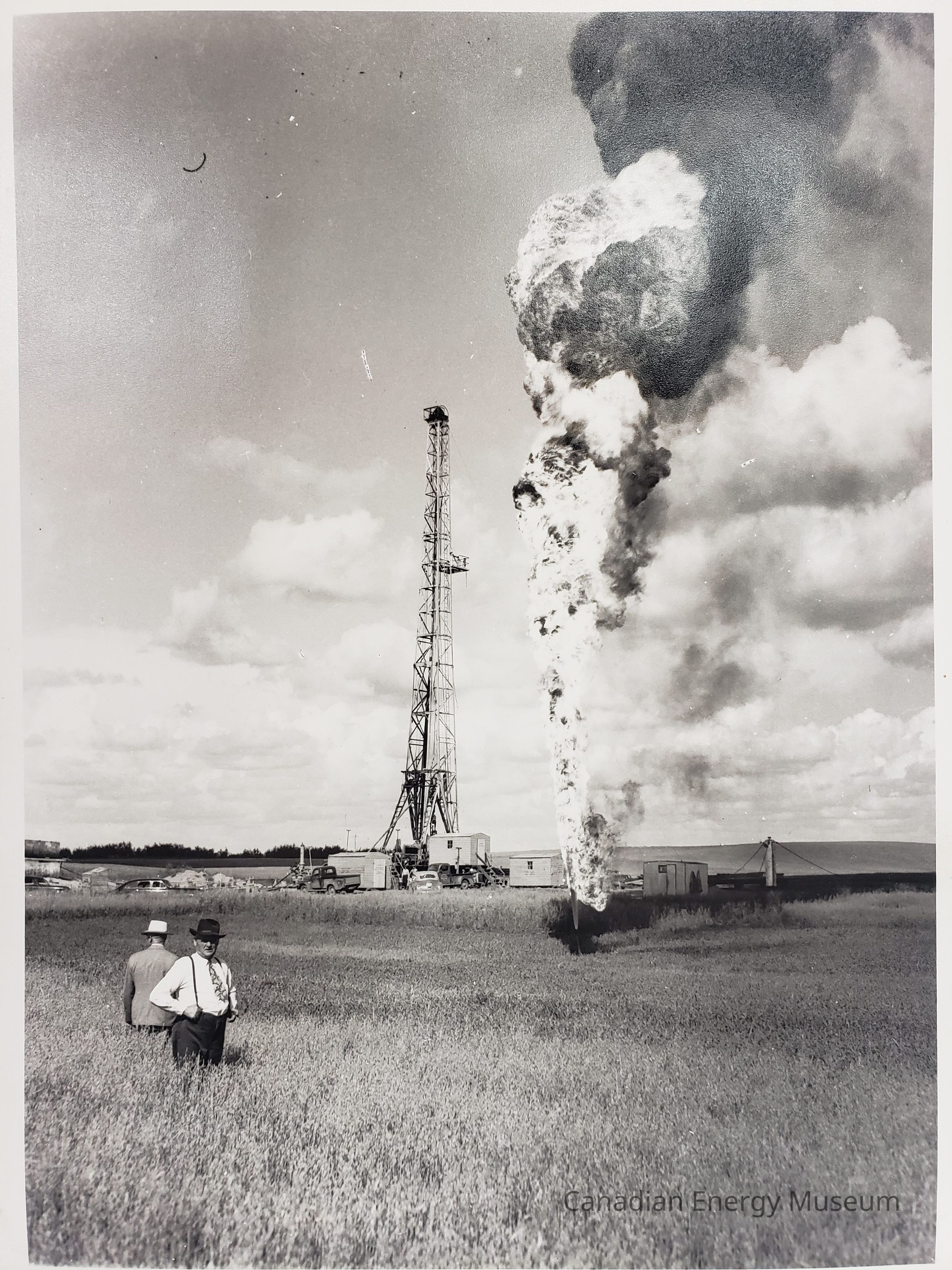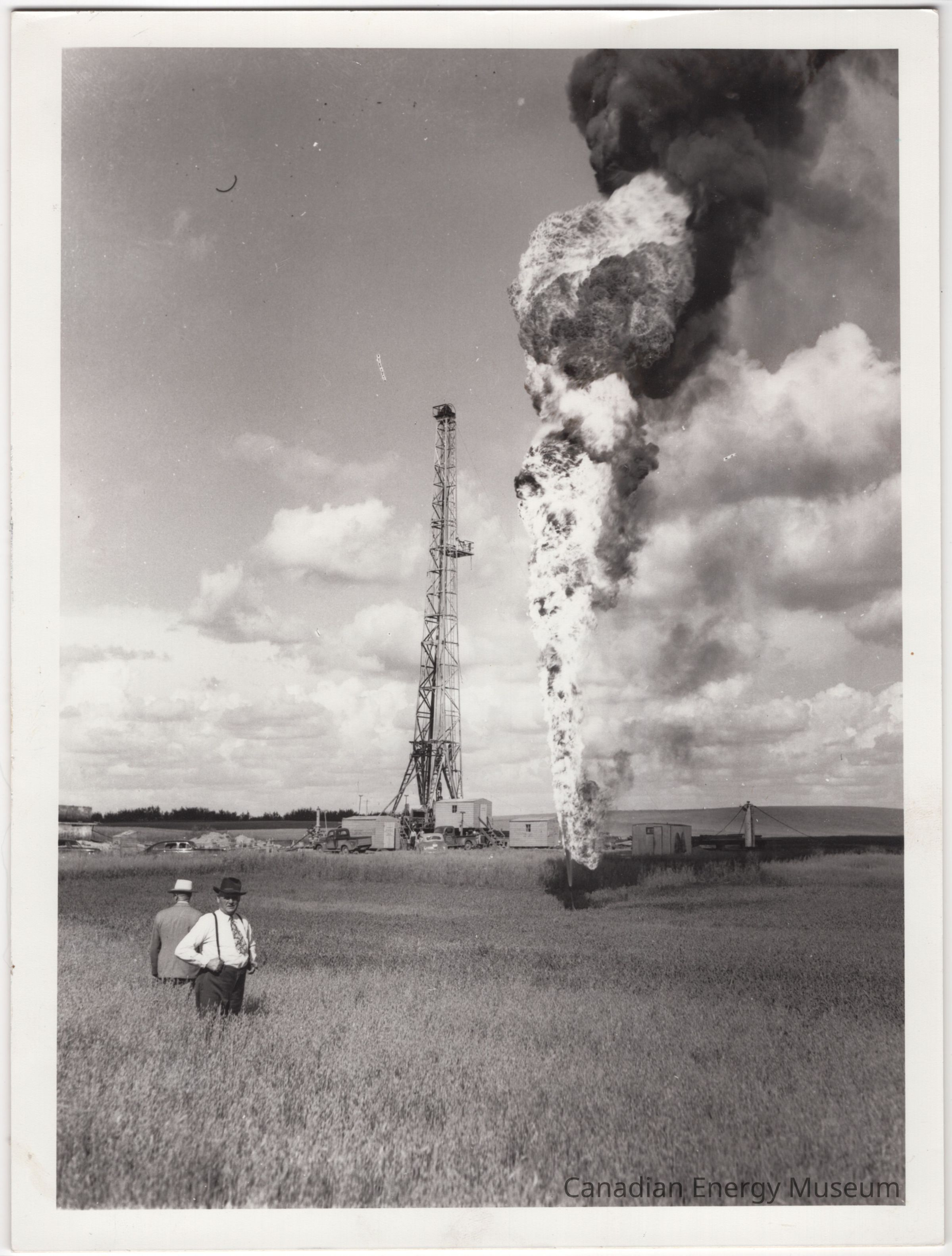A large black and white (matte) photograph of an active oil flare in a field. In the nearer-midground are TWO men, one in a white shirt, tie, suspenders, dark pants, and dark hat facing towards the camera; and the second in a light-coloured blazer/jacket and white hat, facing away from the camera. They are surrounded by a grass/wheat field. The flare is in the midground, and raised from the lower-third of the image up to the top, with a bright base and black smoke top. Behind the flare is an oil rig surrounded by relevant small buildings. Notable imperfections in the film, including a large white mark in the upper-centre, and a short black hair in the upper top-left.