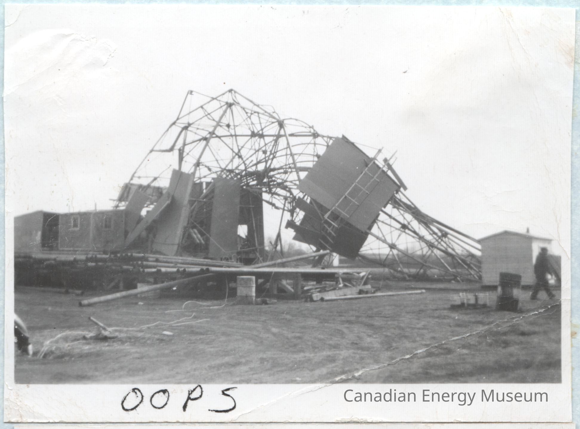 [Photo] "Oops", Collapsed Derrick, Near Calmar, Small, BW, c.1940sEntry/Object ID
