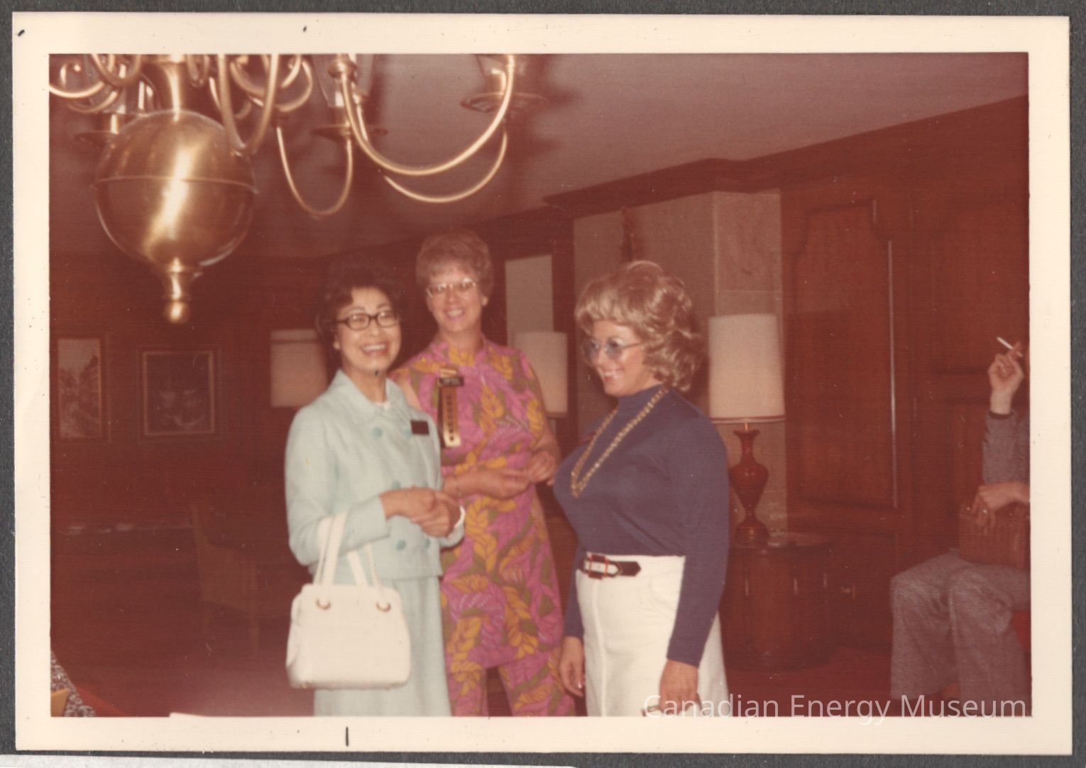 Description: In the centre-of-frame three ladies stand. From left to right: The first lady is looking at the camera and dressed in a pale-blue blazer and skirt, with a white handbag on her arm and wearing a nametag or brooch; the middle lady is looking at the camera and wearing a matching long-top and dress set with a pink/yellow/green floral pattern, with a gold and black ribbon corsage/brooch; and the right lady is facing to the left-of-frame, is dressed in a navy-blue long-sleeve top, with a white skirt, and a long necklace. The room they are in wood-panelled walls (dark-wood raised/overlay panel wainscoting style), with red carpet, three table lamps along one wall, two frames items of artwork on the left wall, an armchair, and a fourth figure seated just out of frame to the right, holding a handbag and a cigarette. In the top-left is a chandelier light fixture.