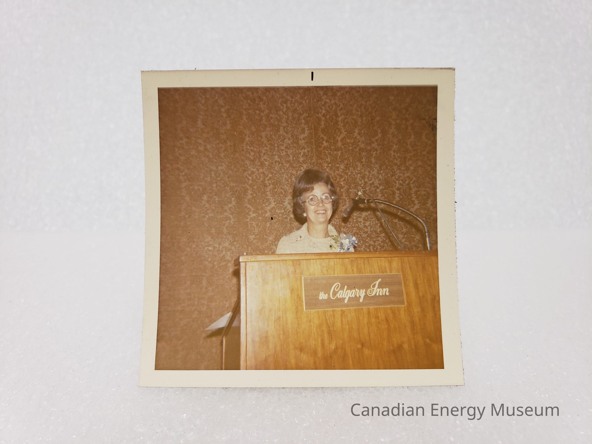 [Photo] Rae Valerio Standing at Podium, The Calgary Inn, Association of Desk and Derrick Clubs, Square, White Border, c.1972Entry/Object ID