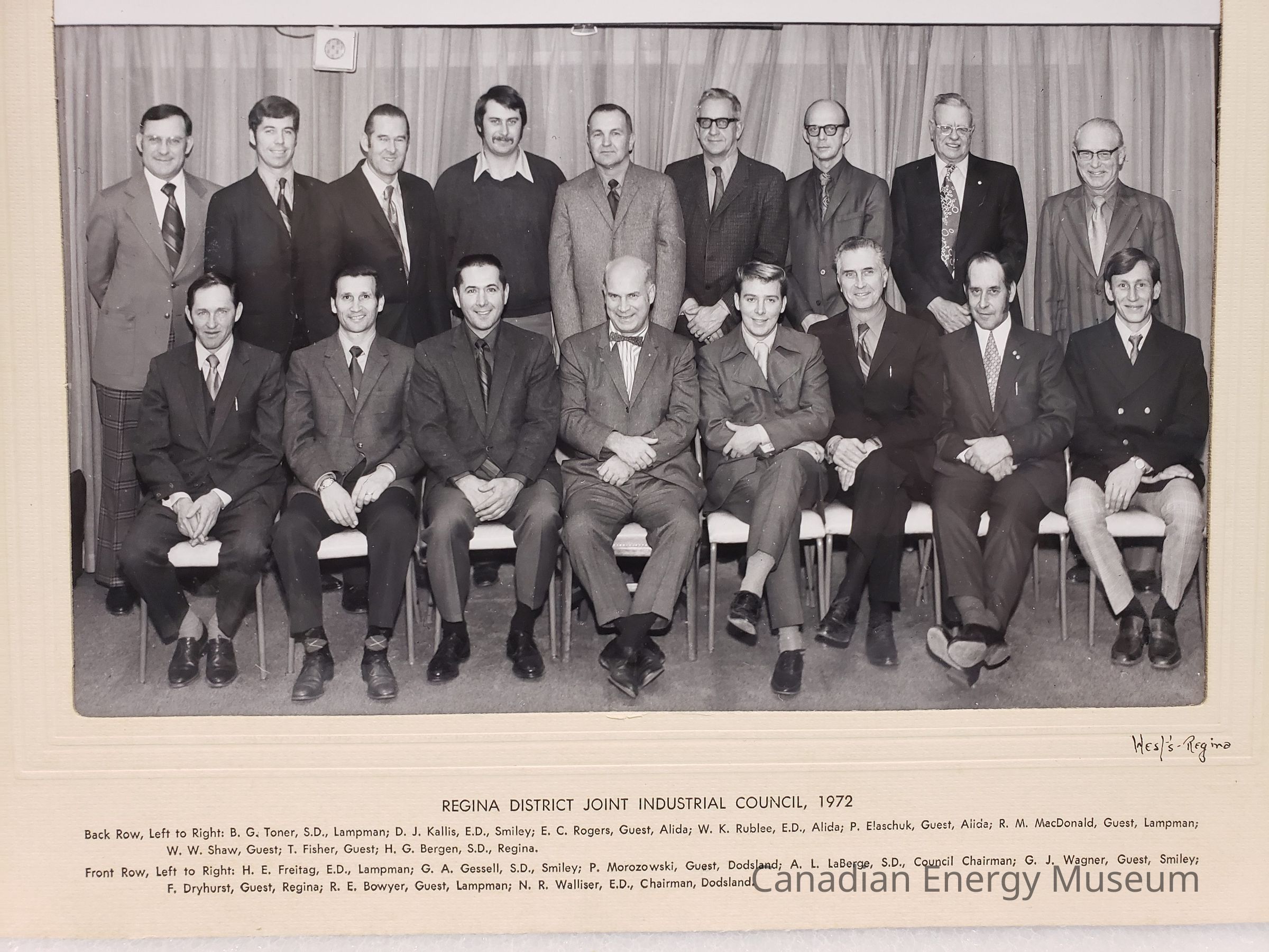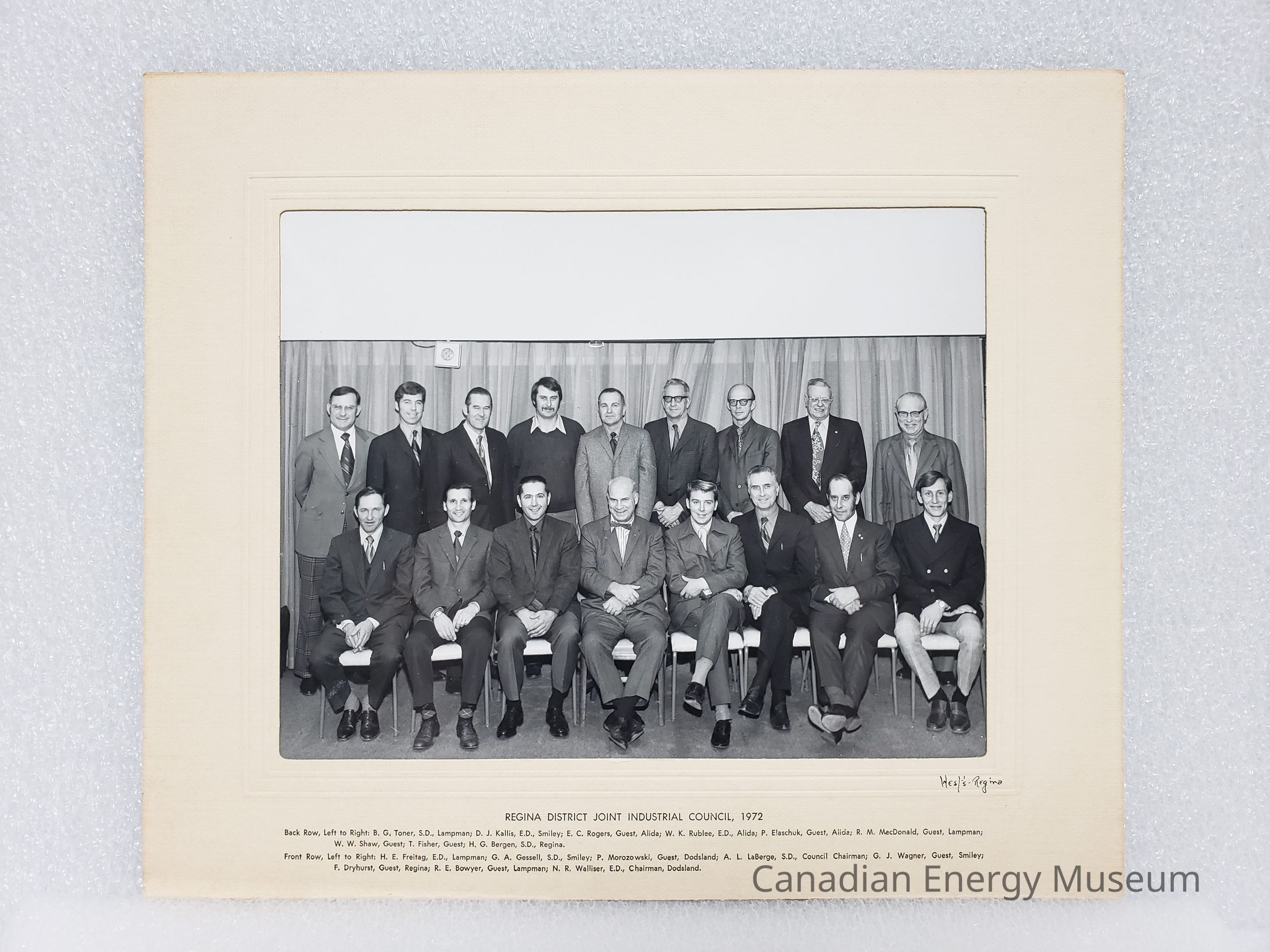 A cardboard framed, Black and white group portrait of the Regina District Joint Industrial Council, dated to 1972. On the frame below the photograph are listed the occupants.Collection