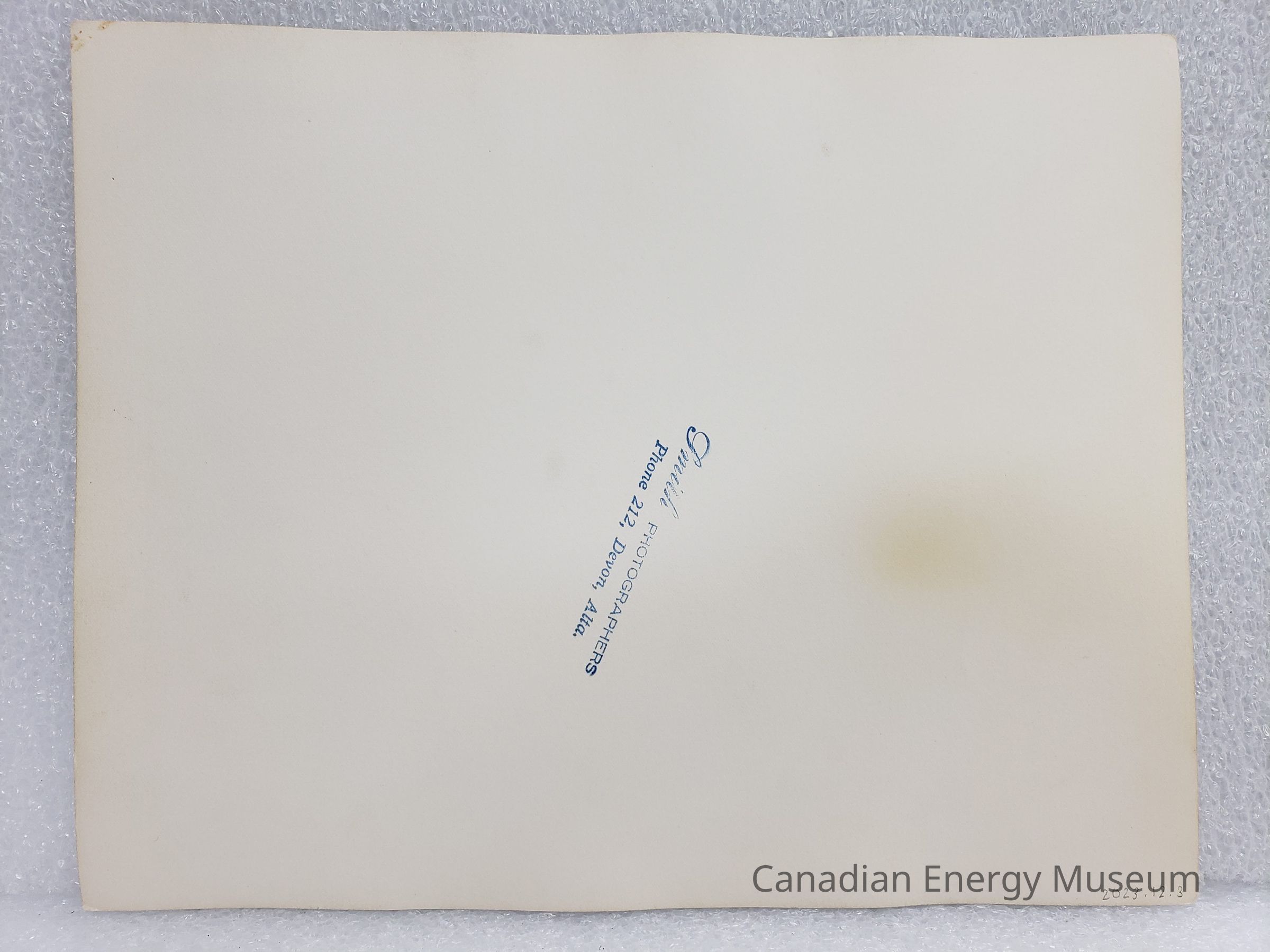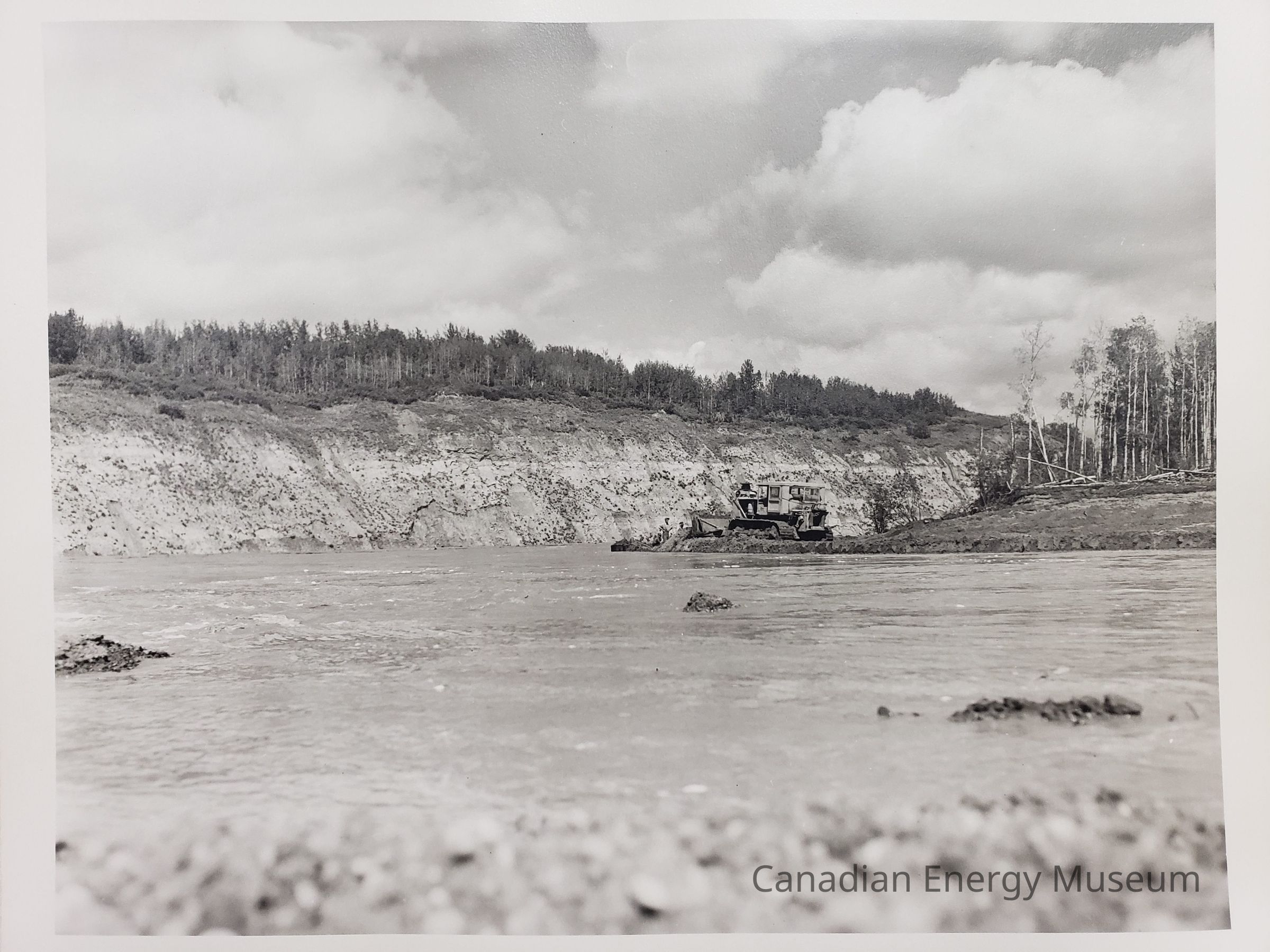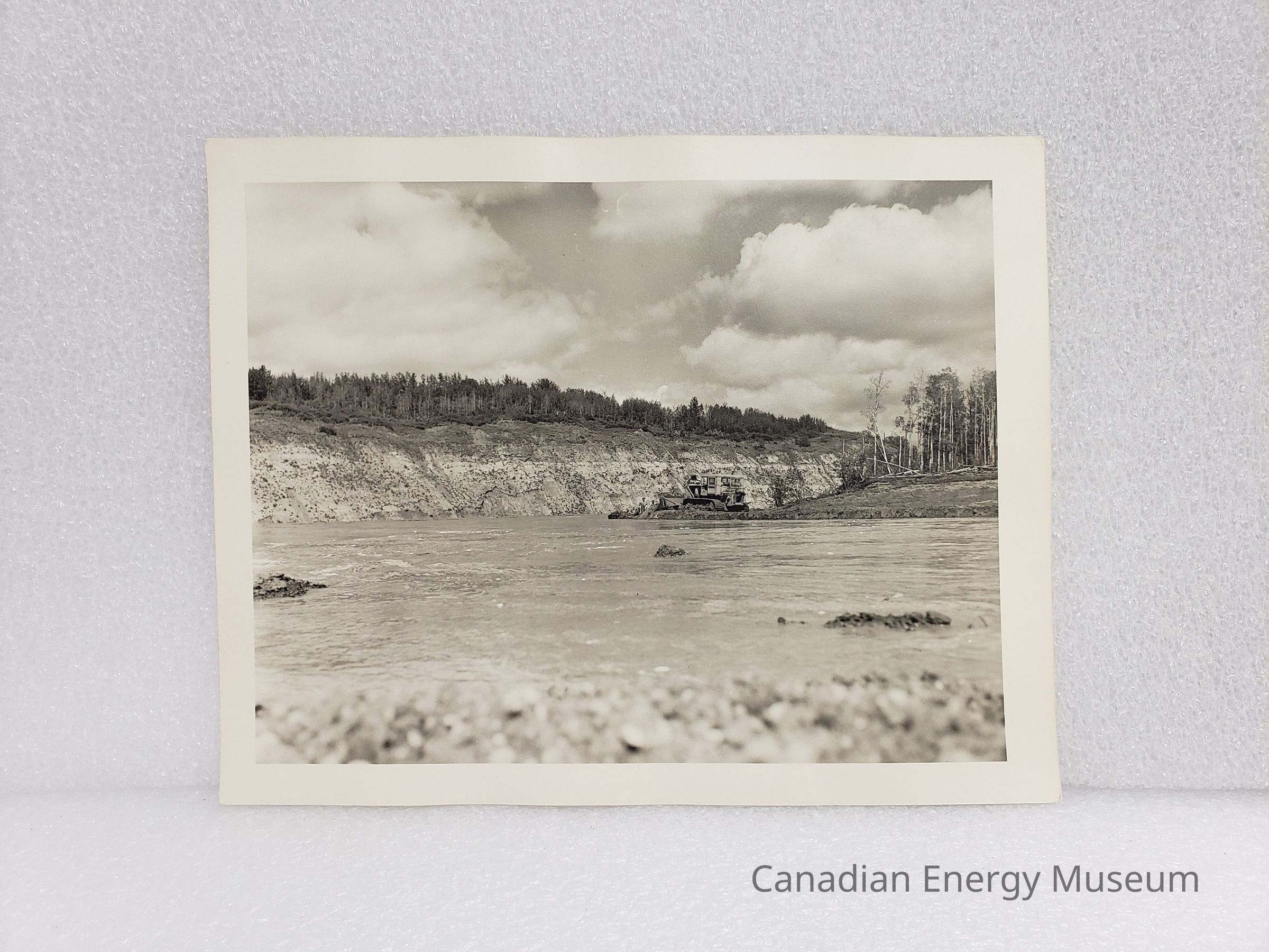 A large, black and white photographic print of the bed of a river (likely Saskatchewan River based on other images in the collection), with Gravel out of focus in the foreground, a bulldozer with three figures in behind it in the midground, and a raised bank with trees on top in the background. On the reverse is a stamp for Smith Photographers ("Phone 212, Devon, Alta.").Collection