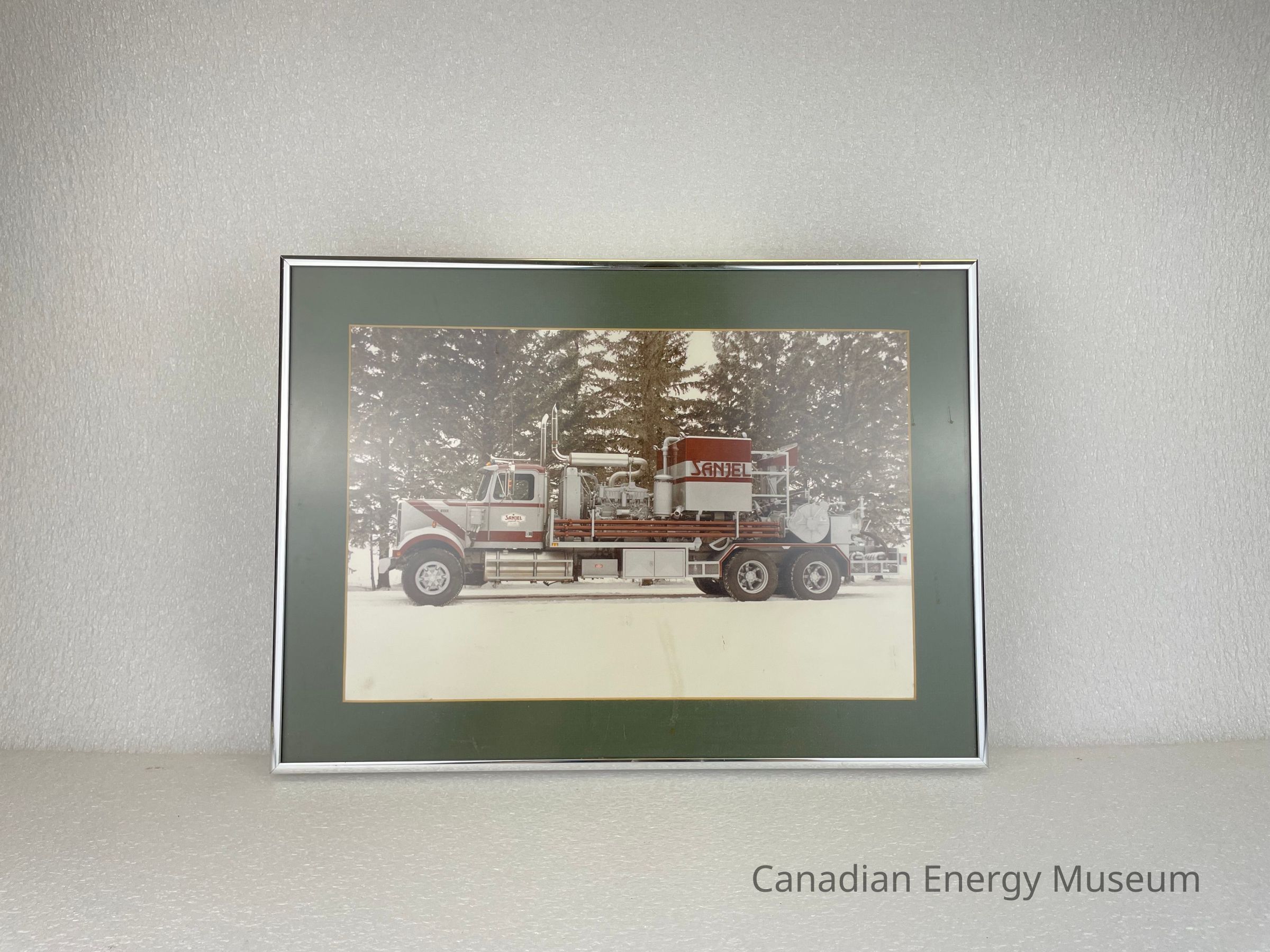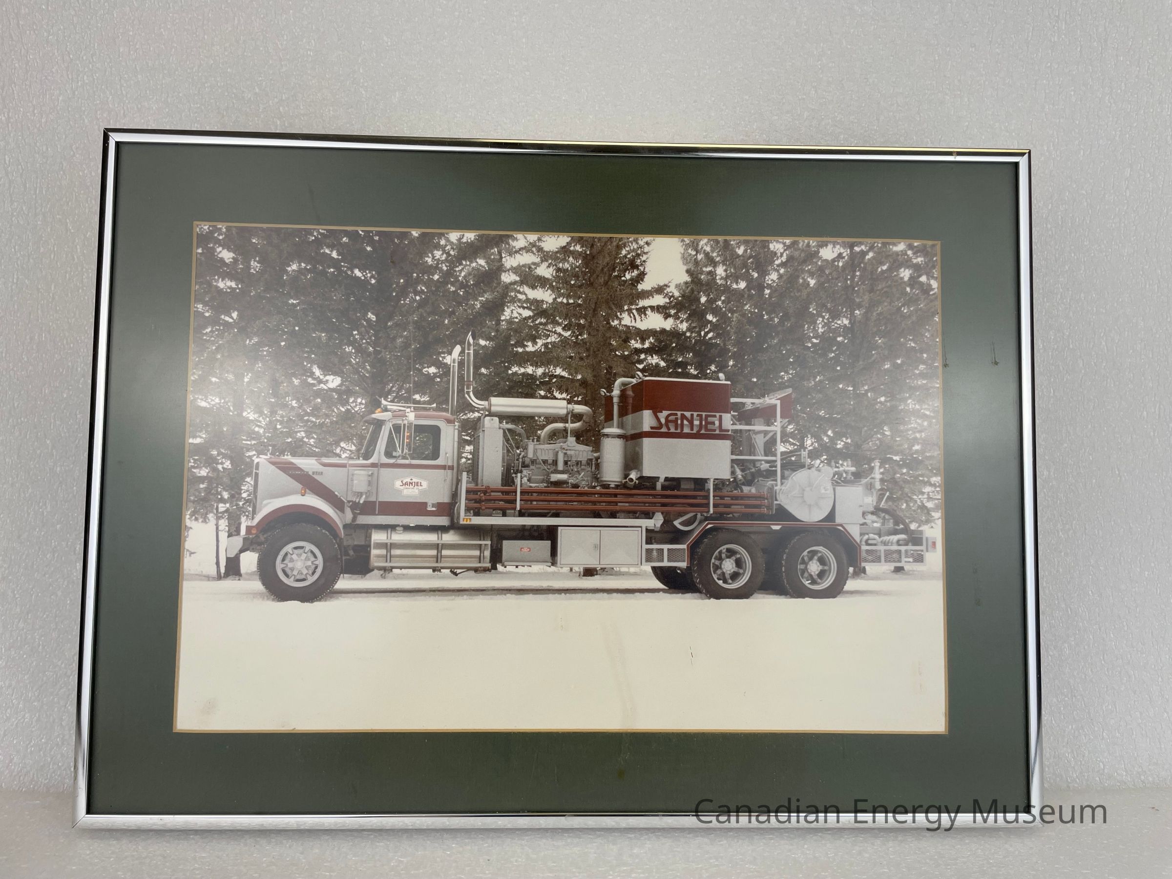 A framed photograph of a red and grey Sanjel truck in a winter scene, sitting in front of trees.