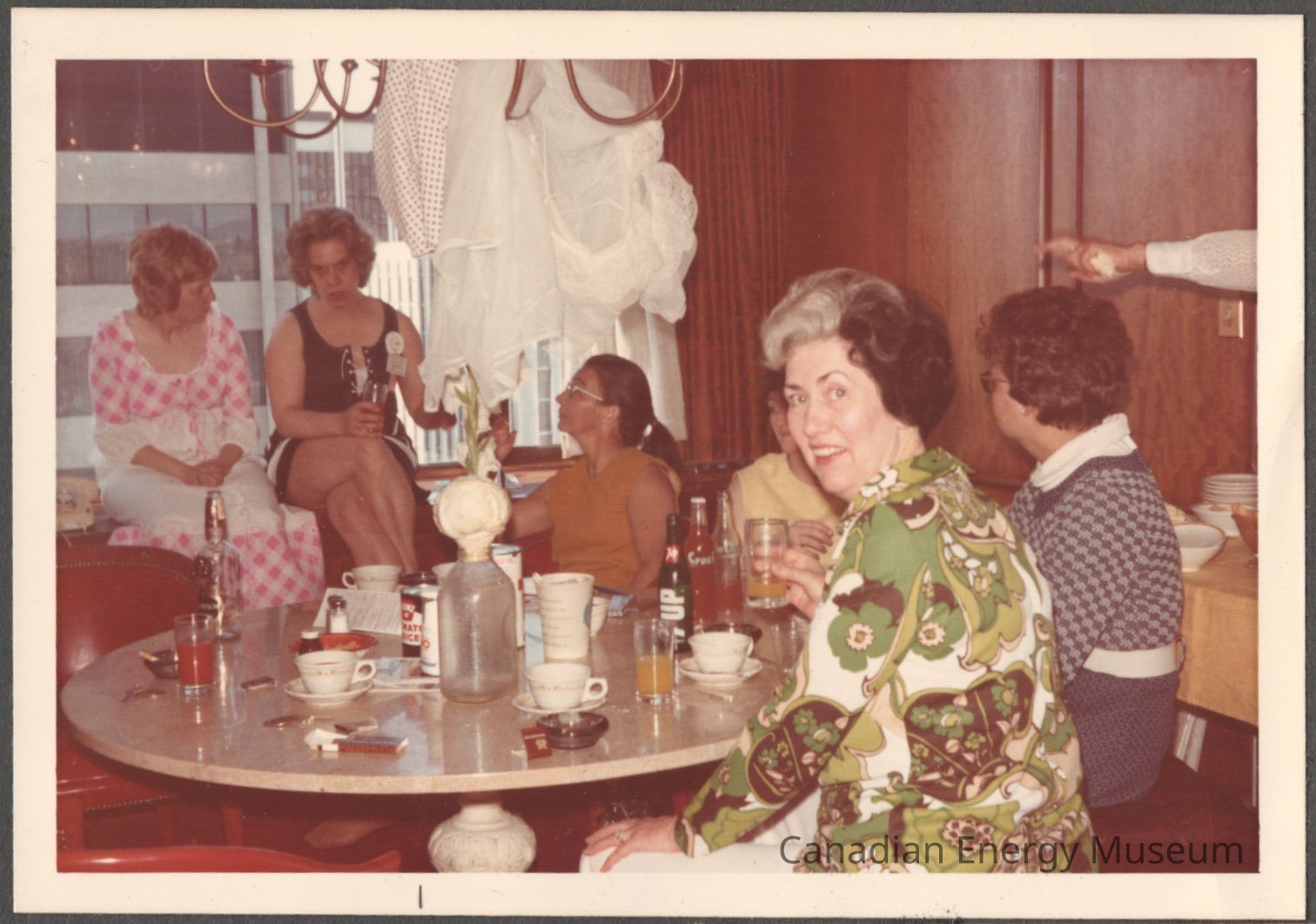 Description: The ladies from left to right: (far-left) seated by the window wearing a pink and white gingham dress; seated by the window wearing a black and white sleeveless, tie-front dress with white/red hat ribbon/corsage and holding a glass; seated lower than the previous ladies looking up ay them wearing a mustard sleeveless top and holding a cigarette; seated to previous ladies side and partially hidden wearing a pale yellow sleeveless top; in the foreground looking directly at the camera wearing a green/white/brown floral print long-sleeve shirt; seated beside previous lady looking away from the camera wearing a navy/grey checkered sweater top; and the arm of a lady out of frame pointing towards the left of frame wearing a white long-sleeved blouse/dress. The table contains various drinking vessels and decanters (including a glass 7-Up bottle, a glass orange Crush bottle, a can of tomato juice, a disposable coffee cut, tea/coffee cups and saucers, etc.), as well as a cigarette packet, matchbook, ashtray, salt and pepper shakers, and a menu/document. The ladies are seated in a variety of seats/surfaces including a maroon couch, and behind them are a large window and wood-panelled walls (dark-wood raised/overlay panel wainscoting style), with a lace dress/curtain gathered up in the middle background.