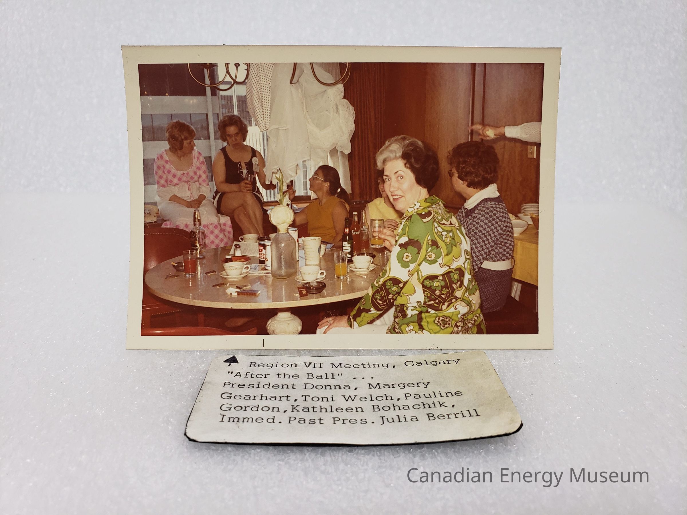 [Photo] Six Ladies Seated with Drinks, 'After the Ball', Region VII Meeting Calgary, Association of Desk and Derrick Clubs, Landscape, White Border, c.1972Entry/Object ID