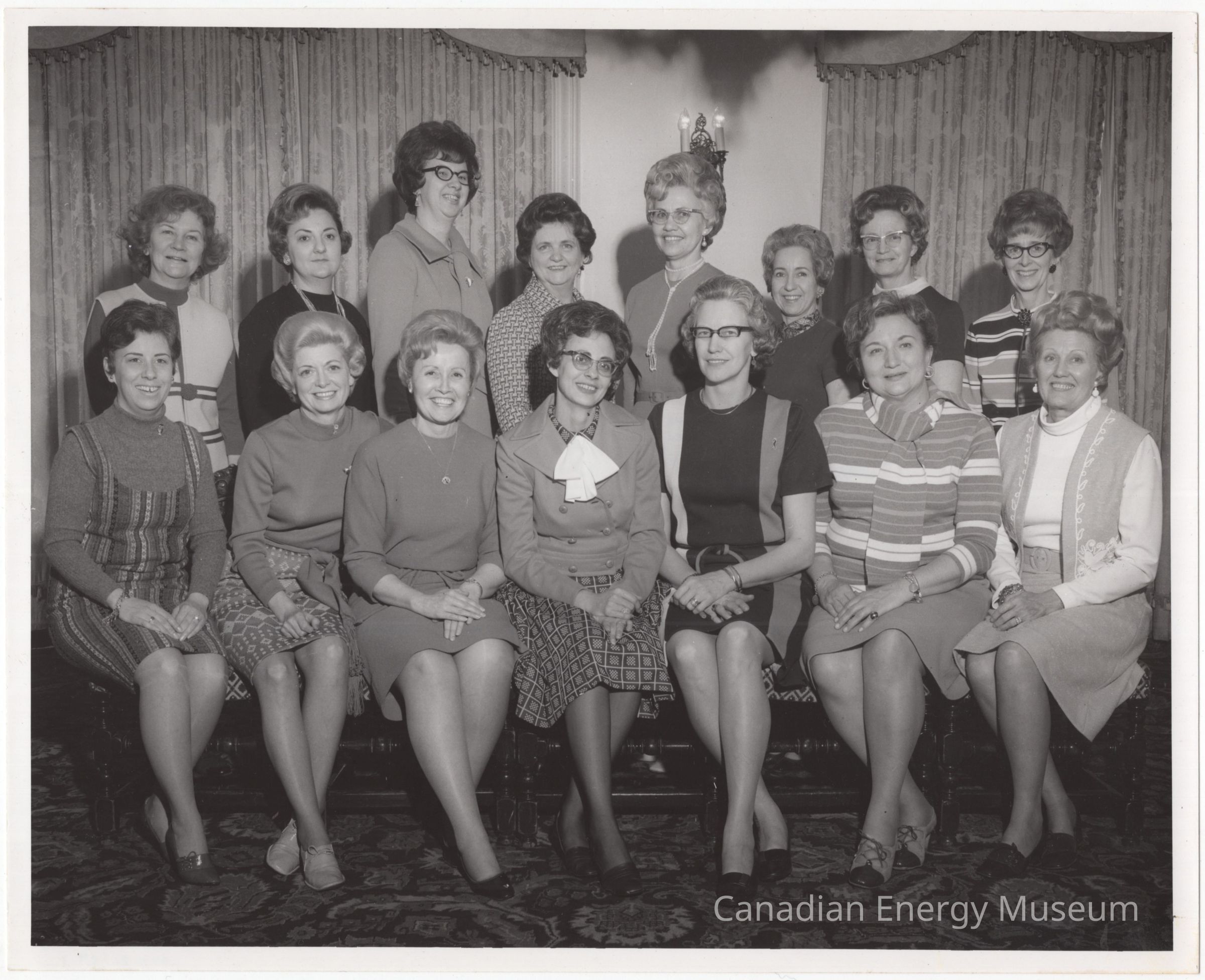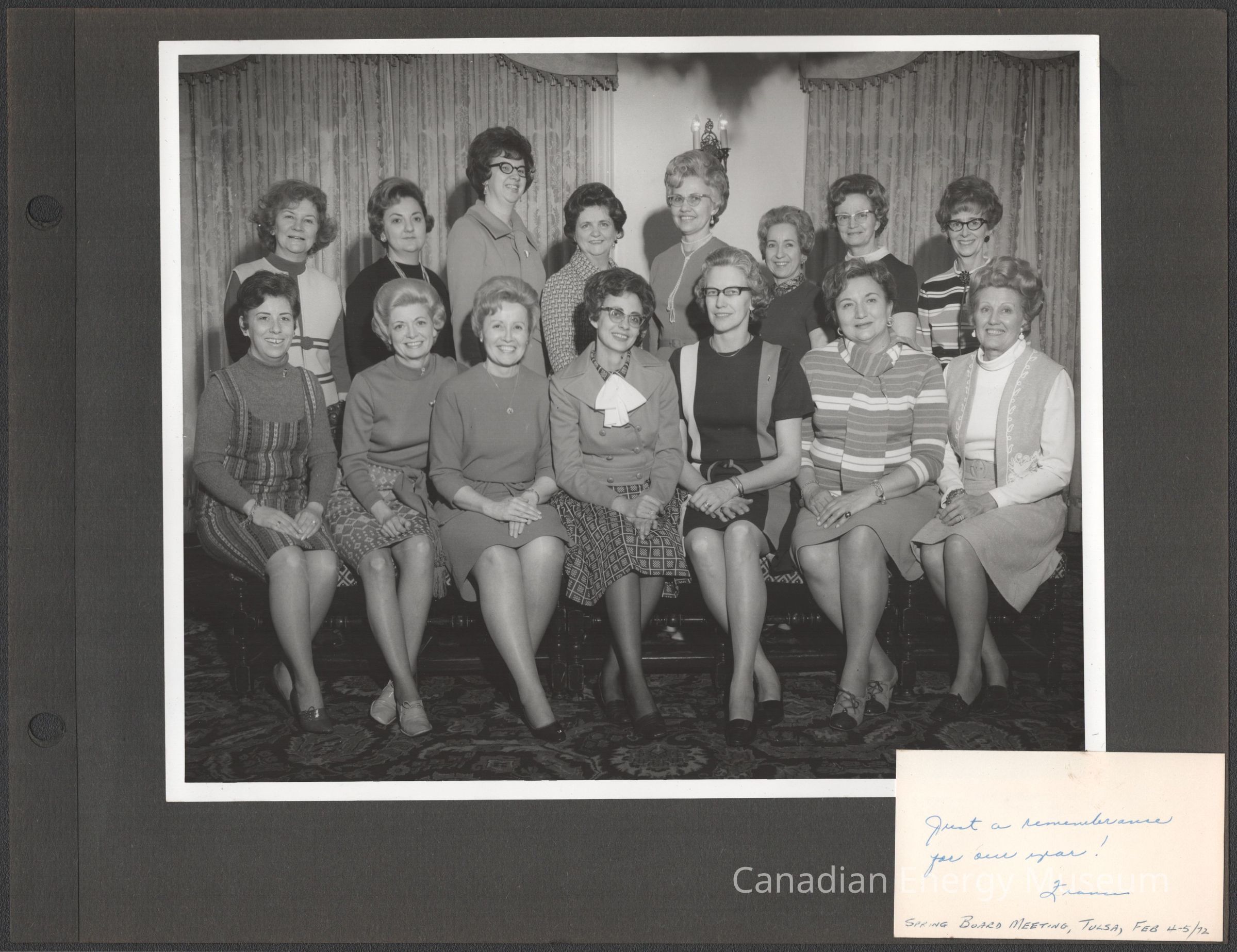 Description: A large professional portrait of FIFTEEN women, both seated and standing. The ladies are attendees at the Spring Board Meeting of the Association of Desk and derrick Clubs, held 4-5 February 1972, in Tulsa, Oklahoma. Seated in the front-row are SEVEN women, while EIGHT are standing in the back row. The photos occupants are not named. Behind the women is a small section of wall with a wall sconce with two 'candles', and to either side of the section of wall are closed curtains, with a light floral pattern and a border of tassels along the top. The chairs the ladies in the front row are seated on have a padded fabric seat with a diamond pattern, and dark-wood chair legs. The floor is covered in a dark patterned carpet.