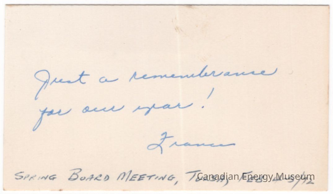 Accompanying the photograph in the scrapbook was a small note card with the handwritten blue ballpoint message "Great a remembrance [you our far??]", and the handwritten blue ballpoint note "SPRING BOARD MEETING, TULSA, FEB 4-5/72".
