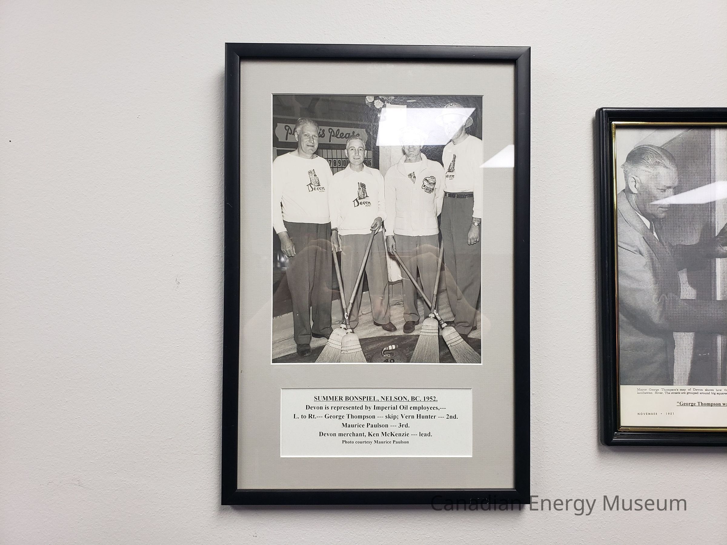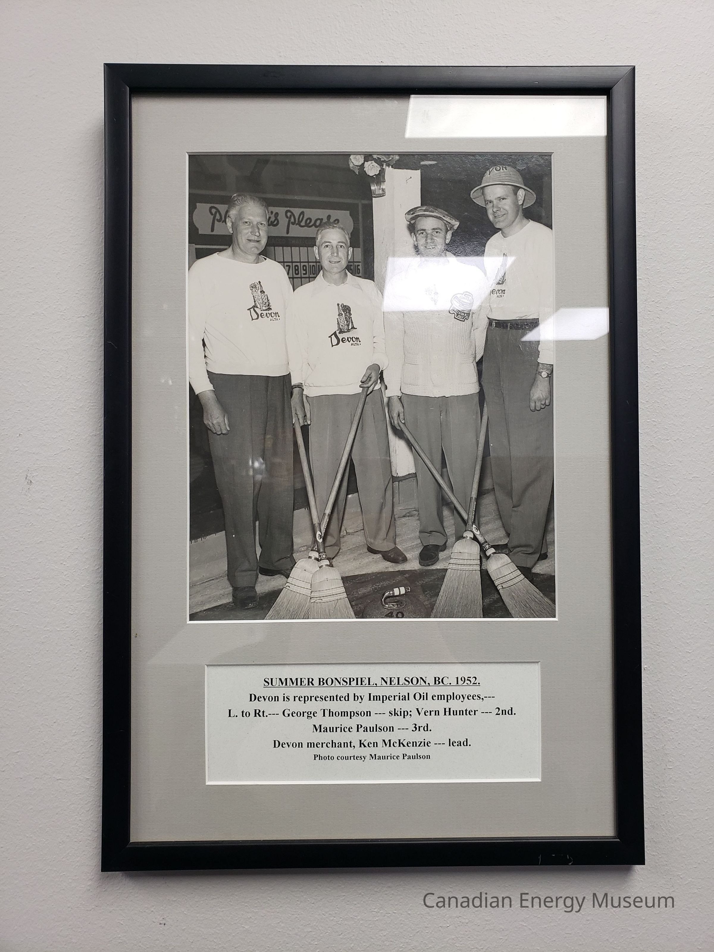 Frames with Accompanying print label reading: "SUMMER BONSPIEL, NELSON, BC, 1952; Devon is represented by Imperial Oil employees,---; L. to Rt.--- George Thompson --- skip; Vern Hunter --- 2nd. Maurice Paulson --- 3rd.; Devon merchant, Ken McKenzie --- lead.; Photo courtesy Maurice Paulson".Collection