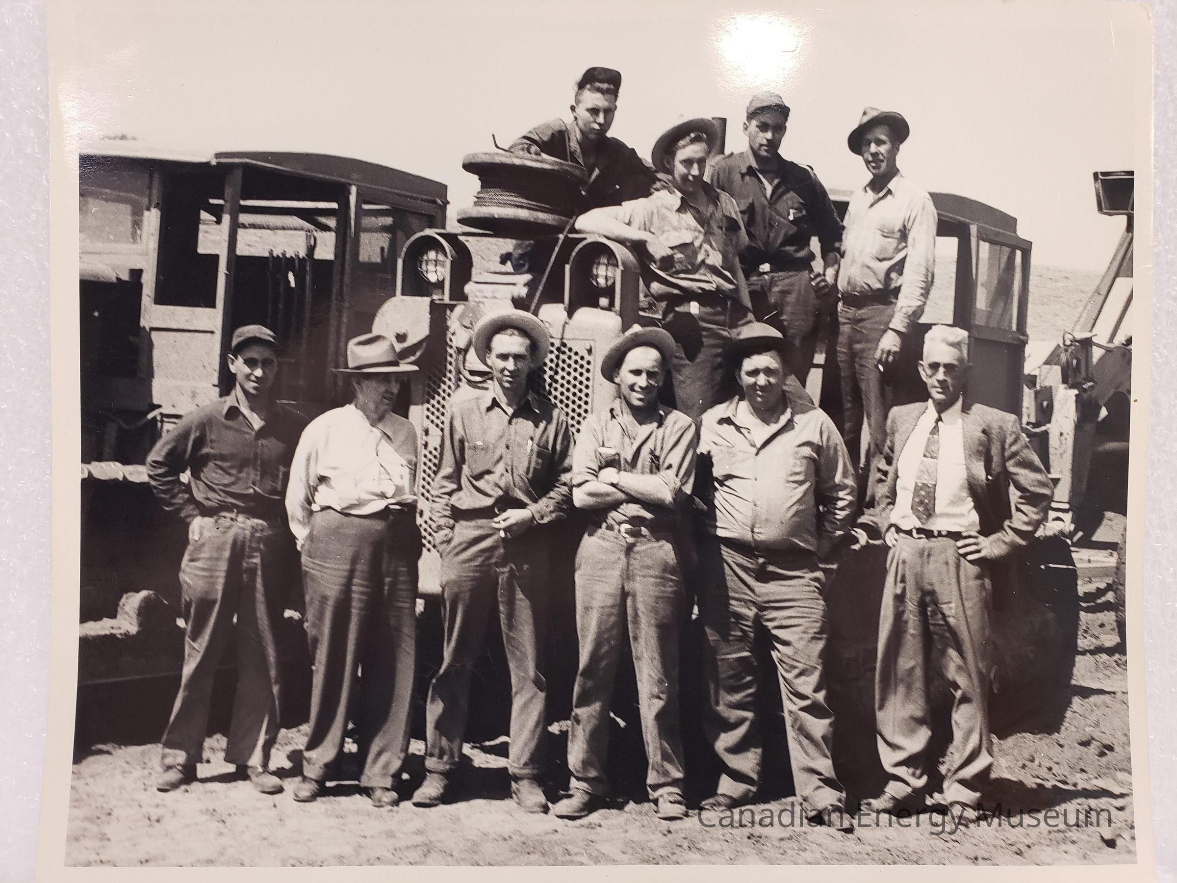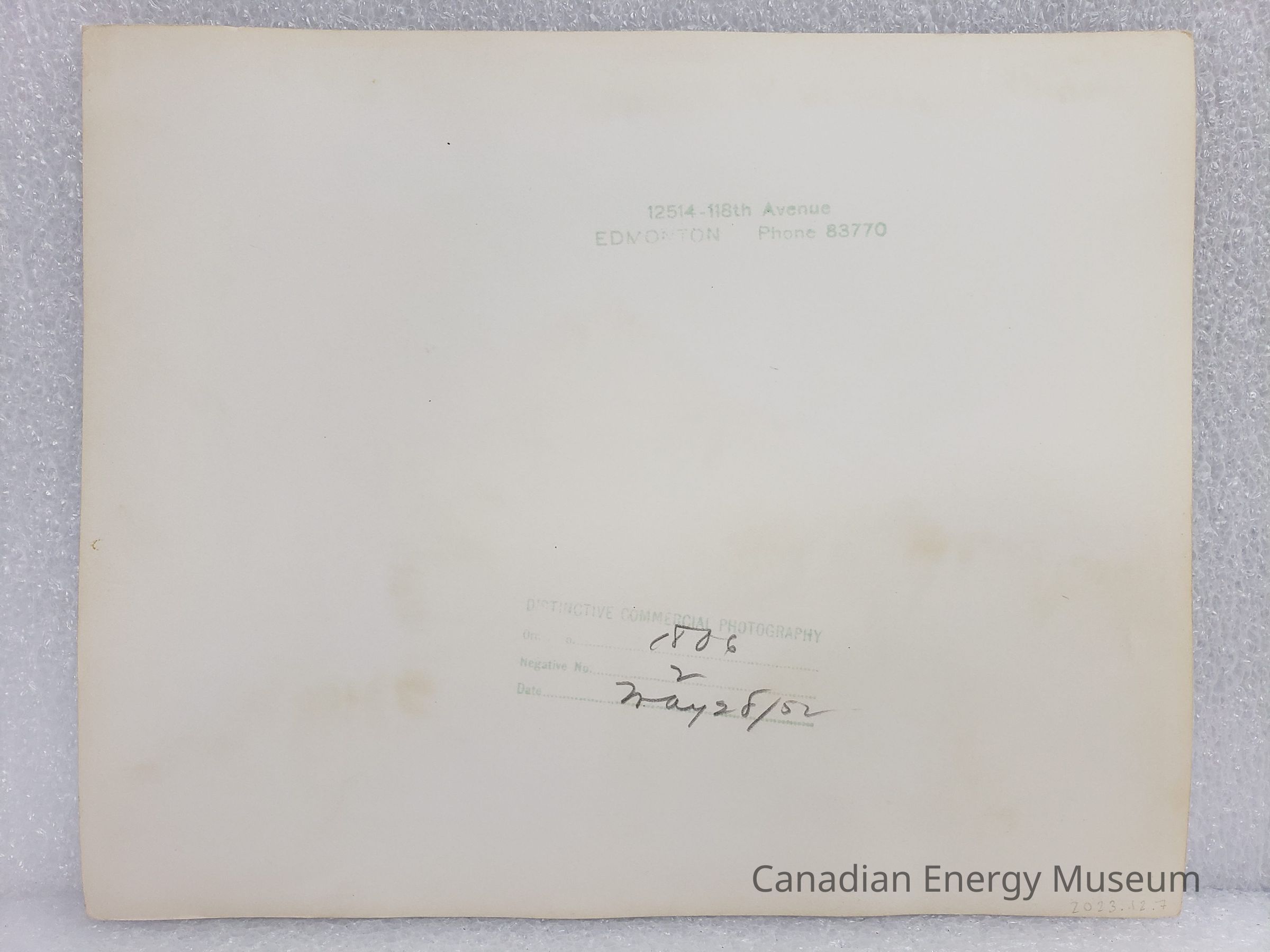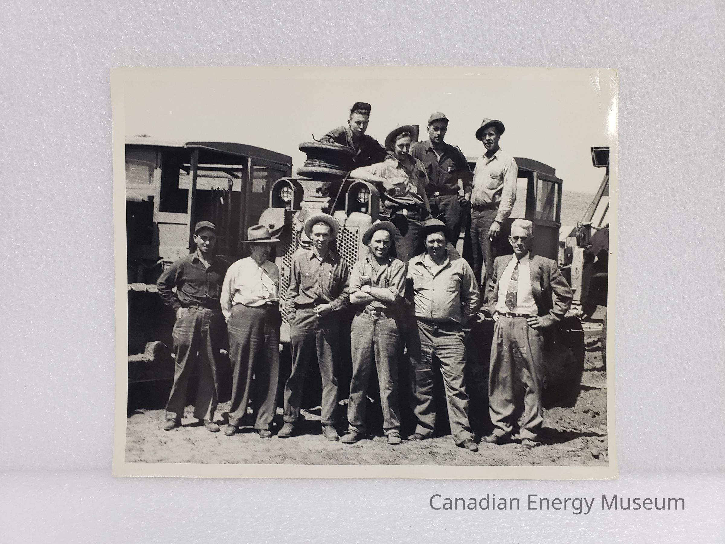 A large, black and white photographic print of TEN men posed on and in front of a heavy vehicle/truck, with two other vehicles behind and to the side. There are SIX men standing in the foreground, in front of the vehicle; and FOUR men standing on the vehicle in the midground. The men are dressed in a variety of dark pants, button-up shirts, and all but one wear hats. The single man not wearing a hat stands to the far right of the front row, and also is the only man wearing a tie. On the reverse is a green-ink stamp reading "12514-118th Avenue; EDMONTON Phone 83770"; and a second green-ink stamp reading "DISTINCTIVE COMMERCIAL PHOTOGRAPHY; Order No....; Negative No....; Date....". In the spaces of the second stamp are handwritten in pencil "[Order No.] 1806; [Negative No.] v; [Date] May 28/52".Collection