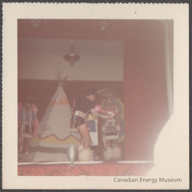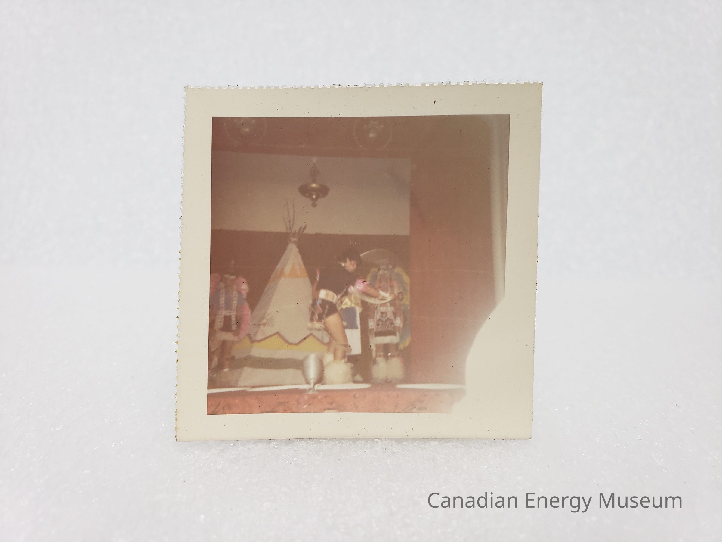 [Photo] Three Ladies on Stage in 'Indian' Costumes with Teepee, Association of Desk and Derrick Clubs, Small, Square, White Border, c.1972Entry/Object ID