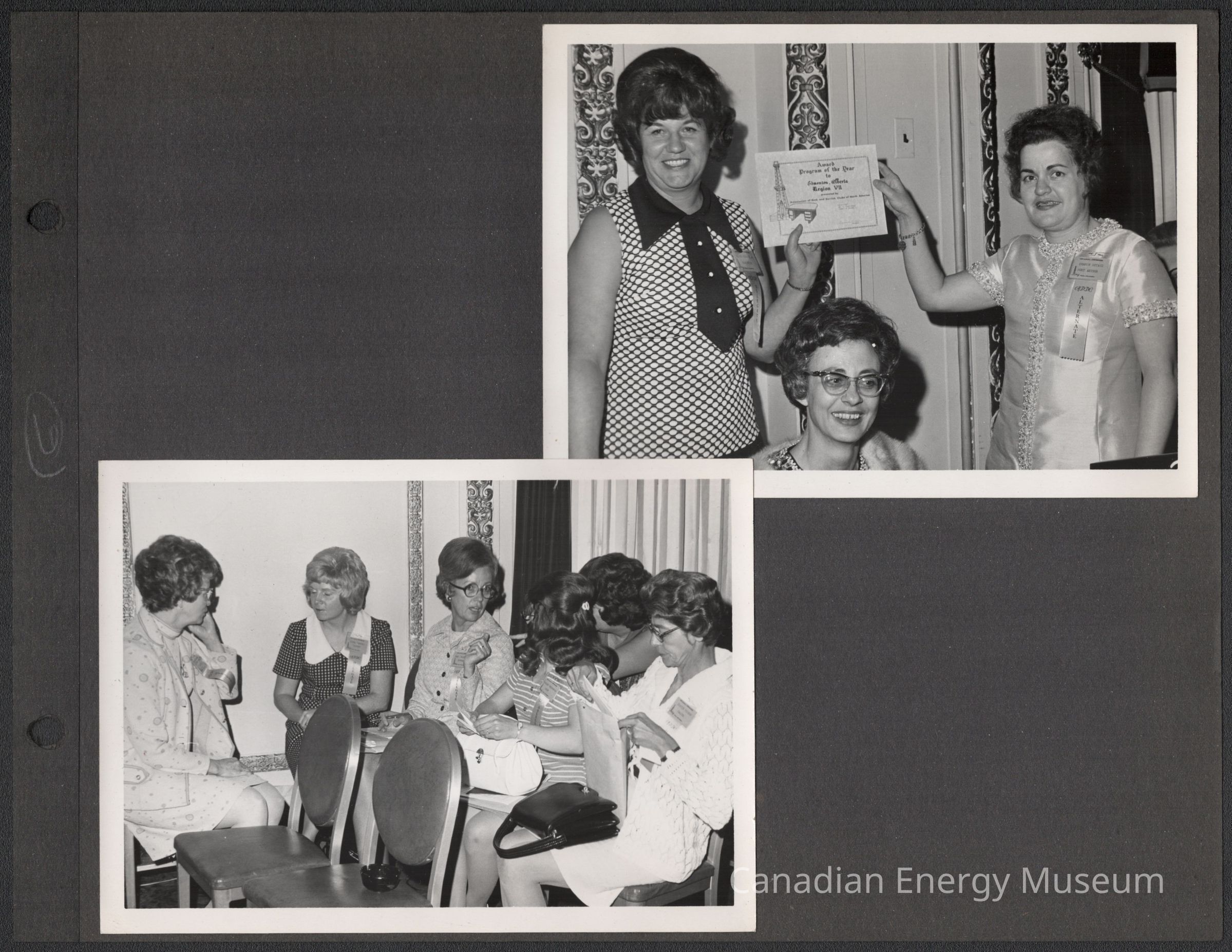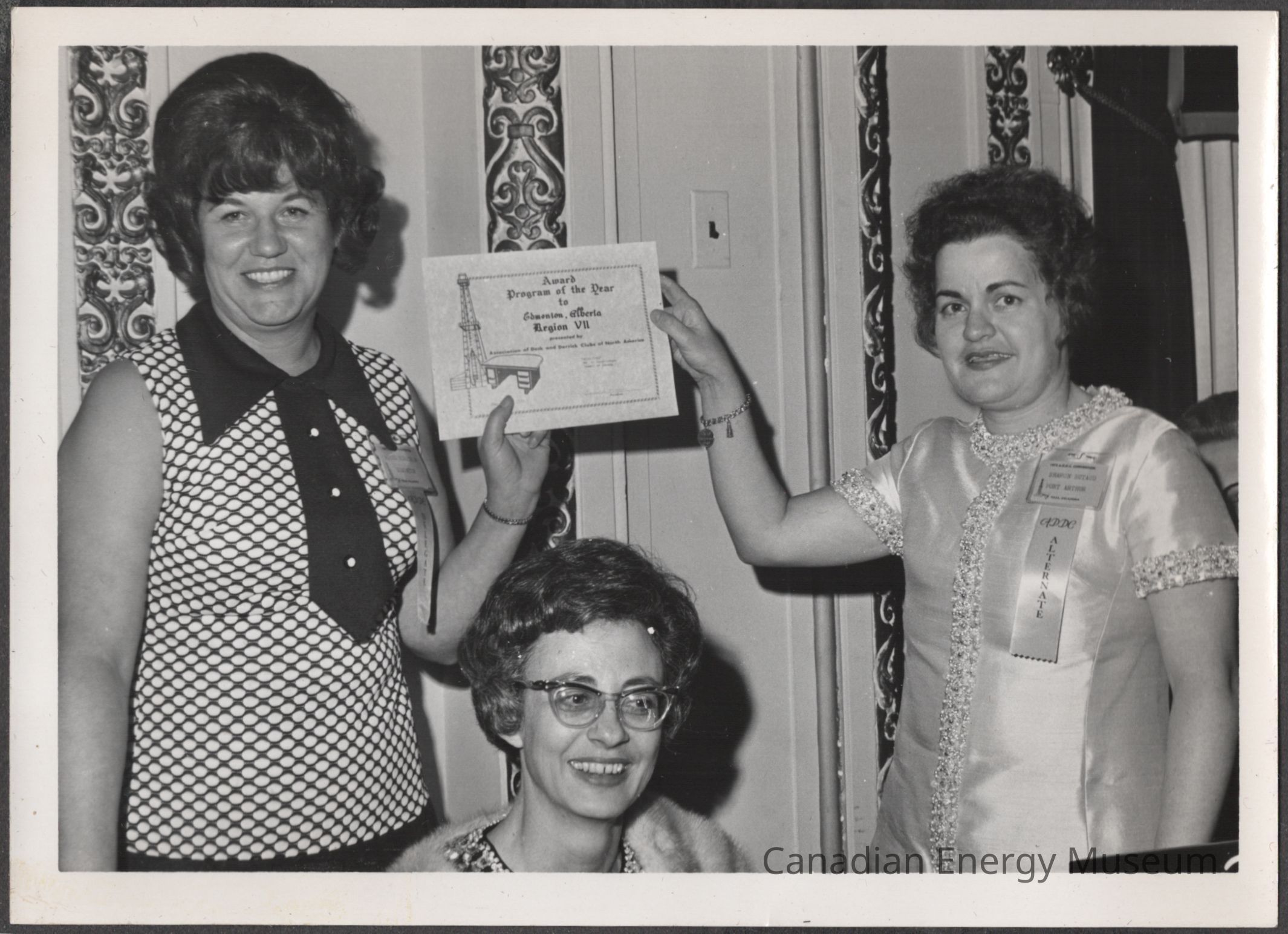 [Photo] Three Ladies with 'Program of the Year' Award, Association of Desk and Derrick Clubs, Large, BW, Landscape, White Border, c.1972Entry/Object ID