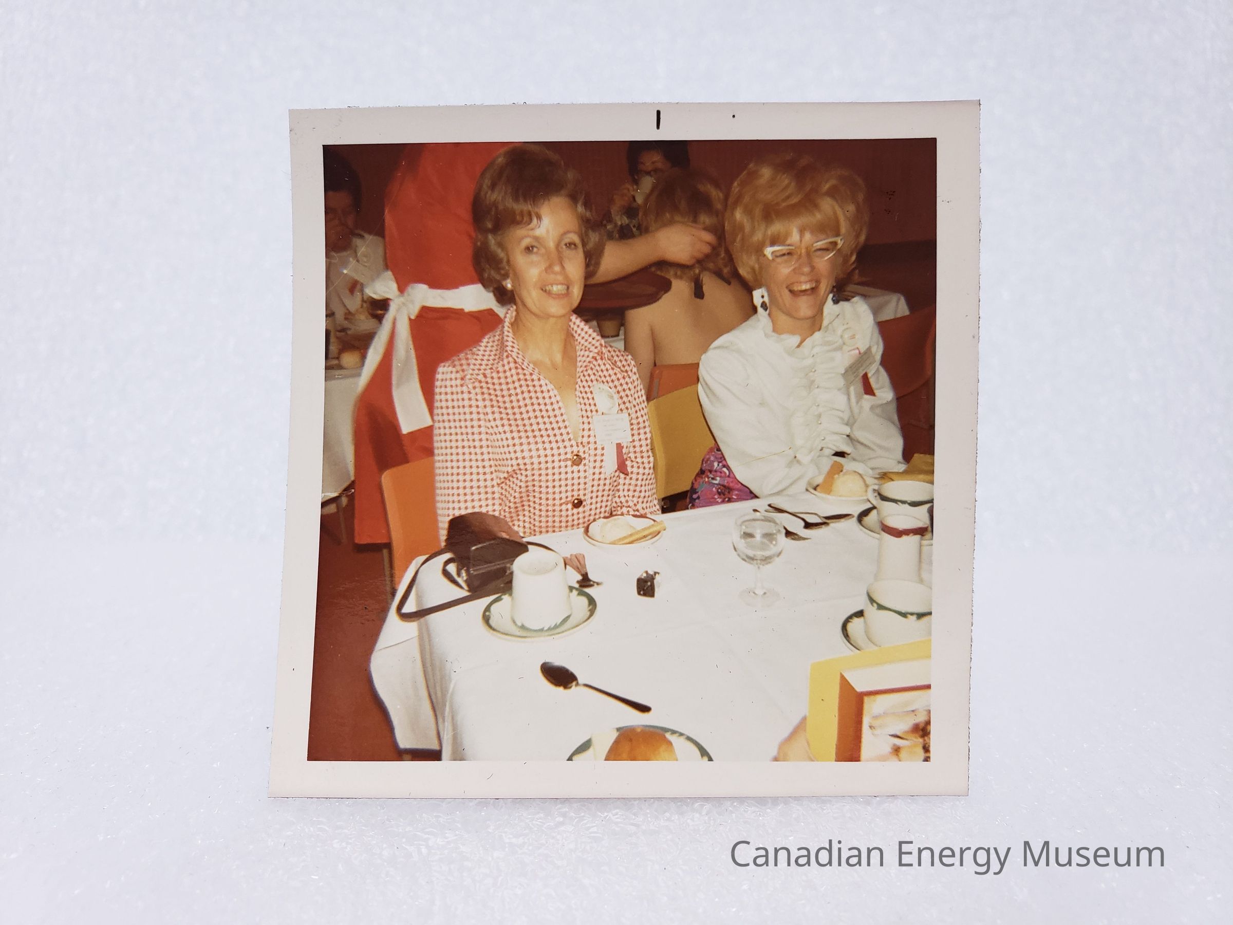 [Photo] Two Ladies Seated at a Dining Hall Table, Association of Desk and Derrick Clubs, Square, White Border, c.1972Entry/Object ID