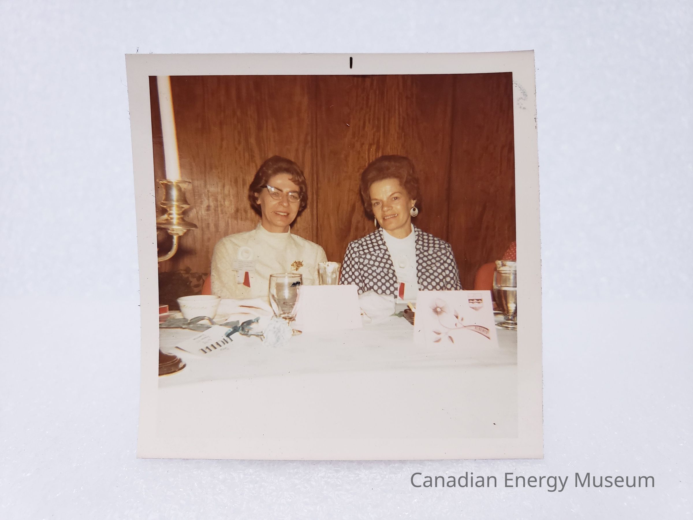 Description: Two ladies, seated behind a table, looking at the camera. On the left is Eunice Tucker (ADDC Casper President, dressed in a real long-sleeve top, with a white-red hat corsage/brooch (similar to 2004.2.206) and gold brooch, and Audrey Wingert (ADDC Regina President, dressed in a black and white large polka dot blazer over a white top, with a white-red hat corsage/brooch (similar to 2004.2.206). In front of them is a table with a white tablecloth, covered in various items including wild rose place cards, glasses, a pale blue flower/corsage, a bowl, and just-in-frame is a metal candelabra. Behind them is a wood panel wall.