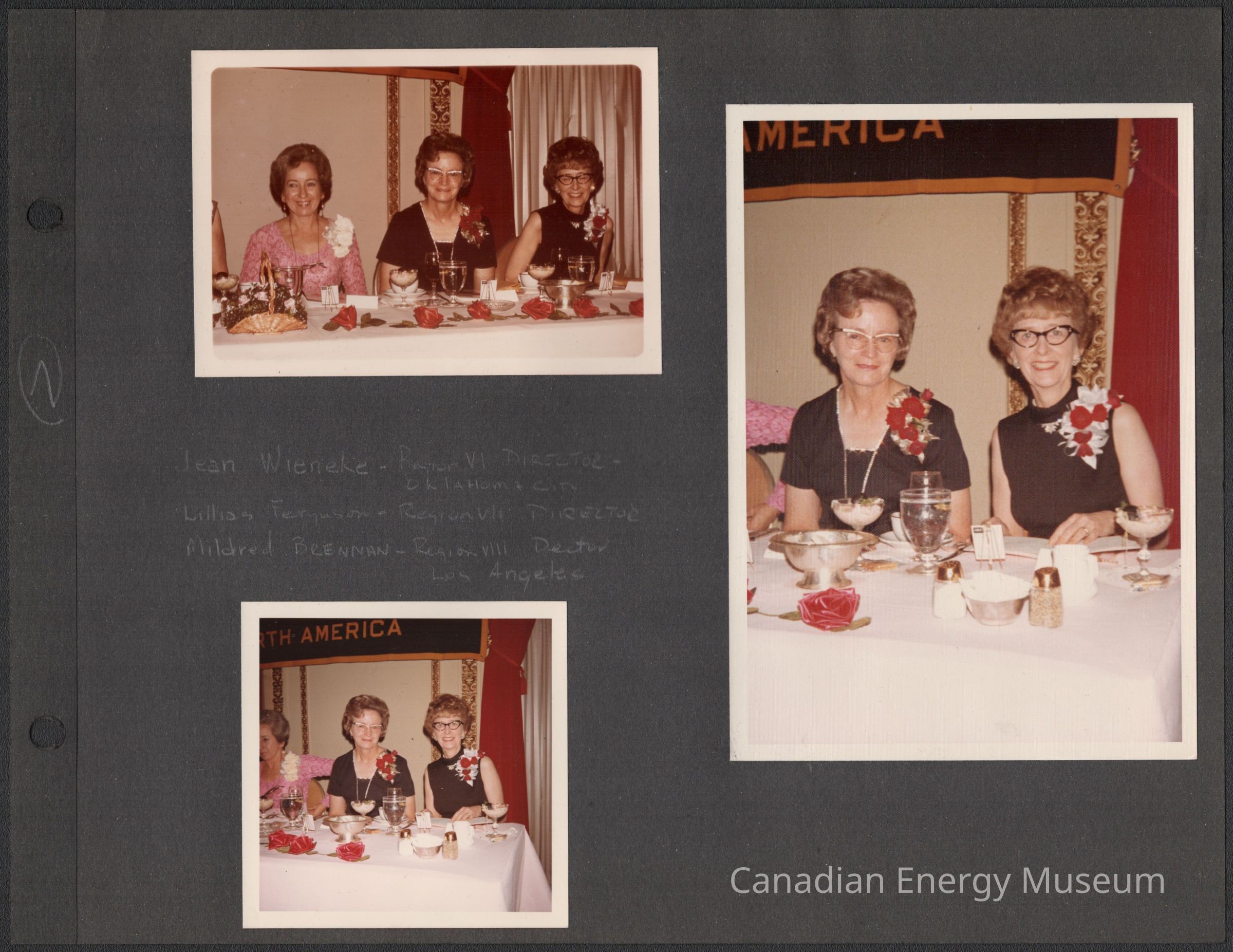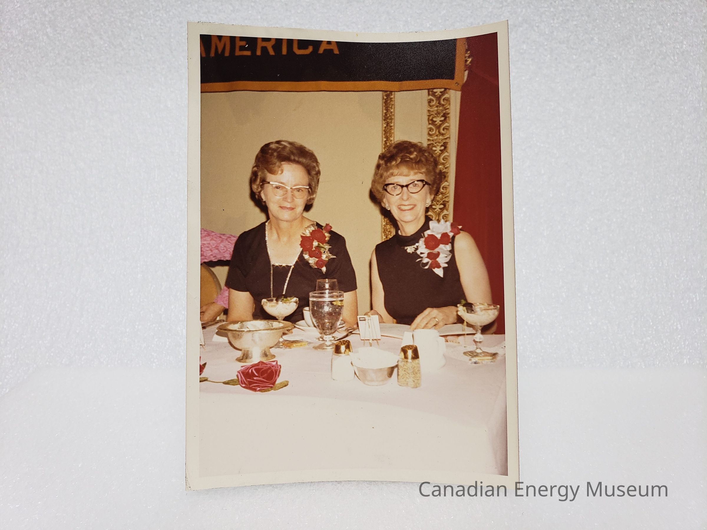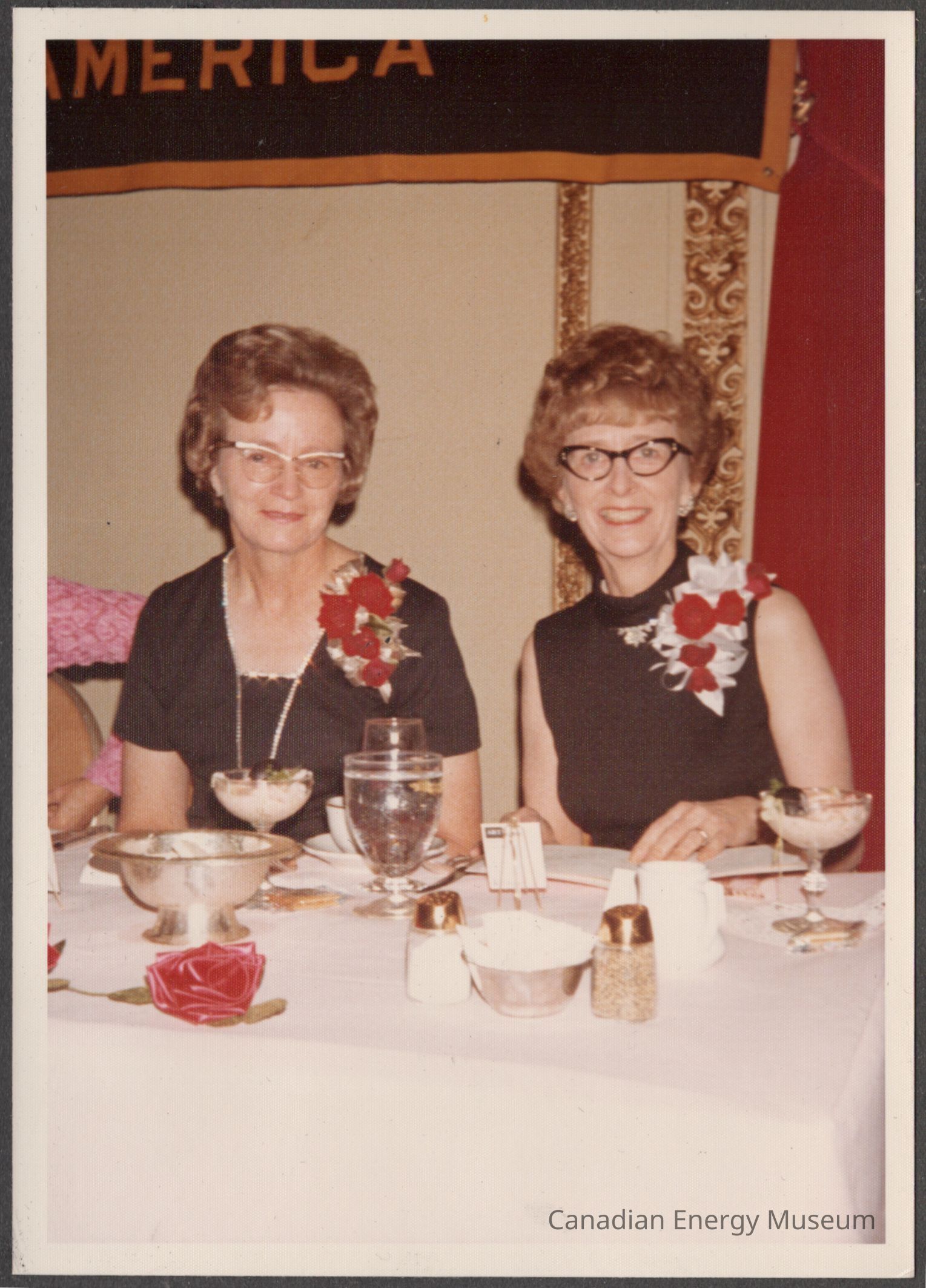 Description: The two women are shown seated behind a banquet table, face the camera. From left-to-right: Lillias Ferguson (ADDC Region VII Director, Edmonton) dressed in a black short-sleeved top/dress, with a silver/diamanté lined front and a gold and red floral corsage; and Mildred Brennan (ADDC Region VIII Director, Los Angeles) dressed in a black sleeveless top/dress with a red and white flower corsage. Also visible is the arm of Jean Wieneke (ADDC Region VI Director, Oklahoma City) who is just out of frame. The table in front of them has a white tablecloth, one which are a red fabric rose, a tea/coffee cup and sauce, goblet-style water glass, silver dishes, and condiments. Behind is a wall with gold-coloured plaster decorative bands, red drapes, and the bottom of a black and yellow banner.