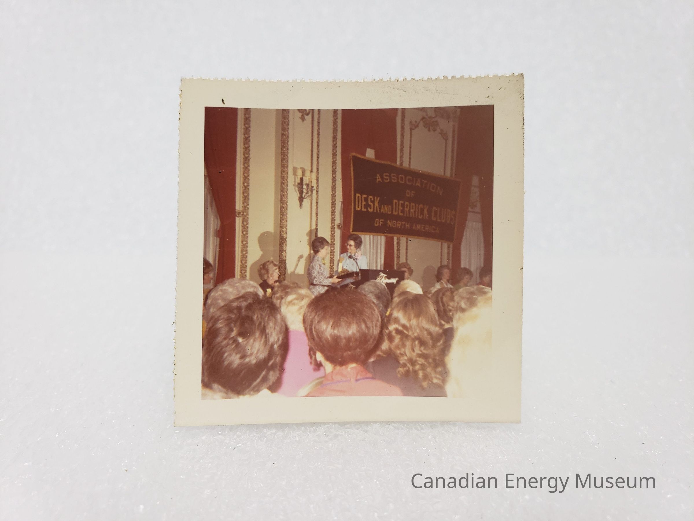 [Photo] Two Ladies Standing at Podium with Backs of Heads, Association of Desk and Derrick Clubs, Small, Square, White Border, c.1972Entry/Object ID