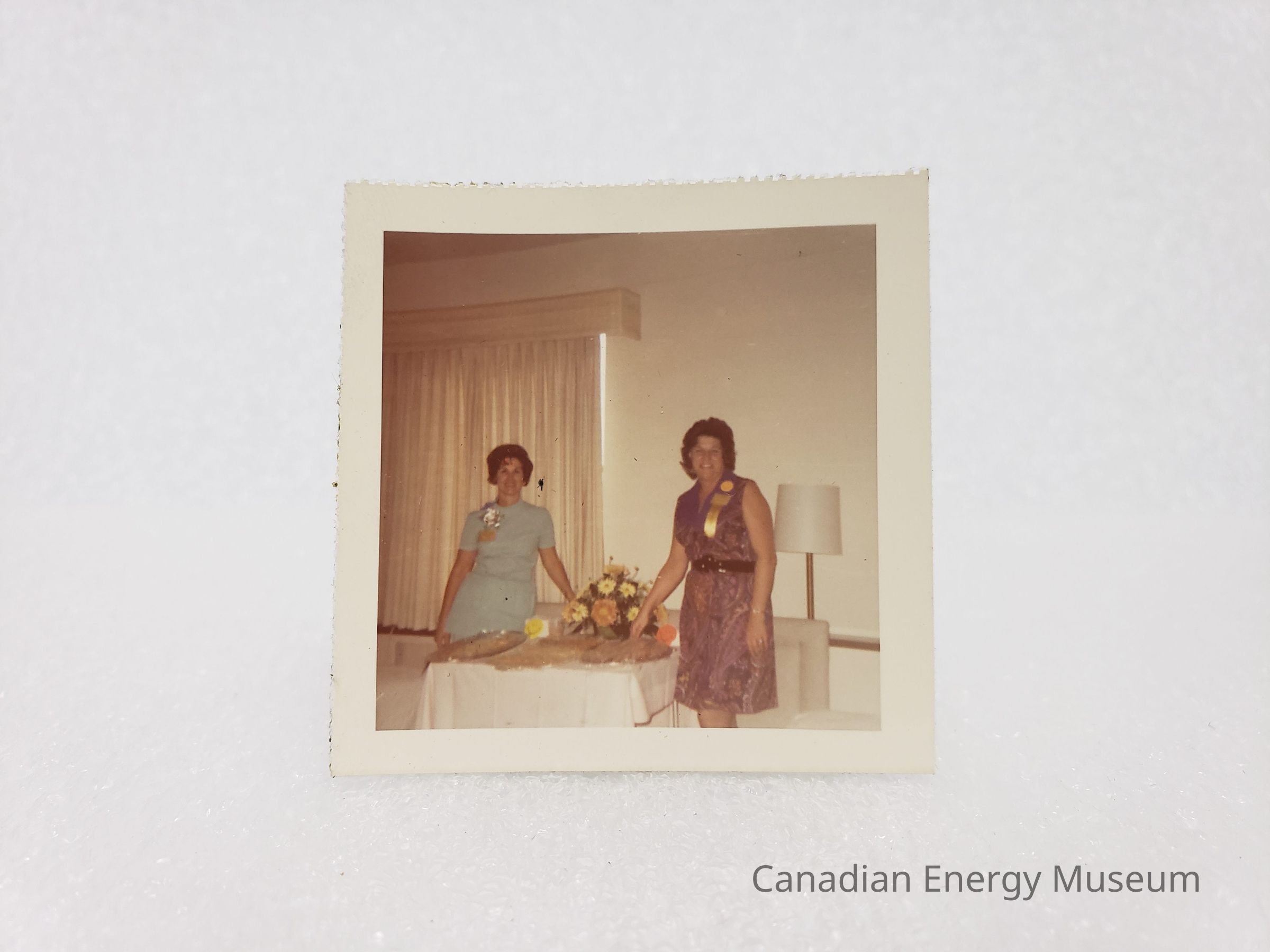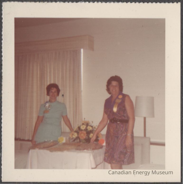 [Photo] Two Ladies Standing Beside a Table With Dishes and Bouquet, Association of Desk and Derrick Clubs, Small, Square, White Border, c.1972Entry/Object ID