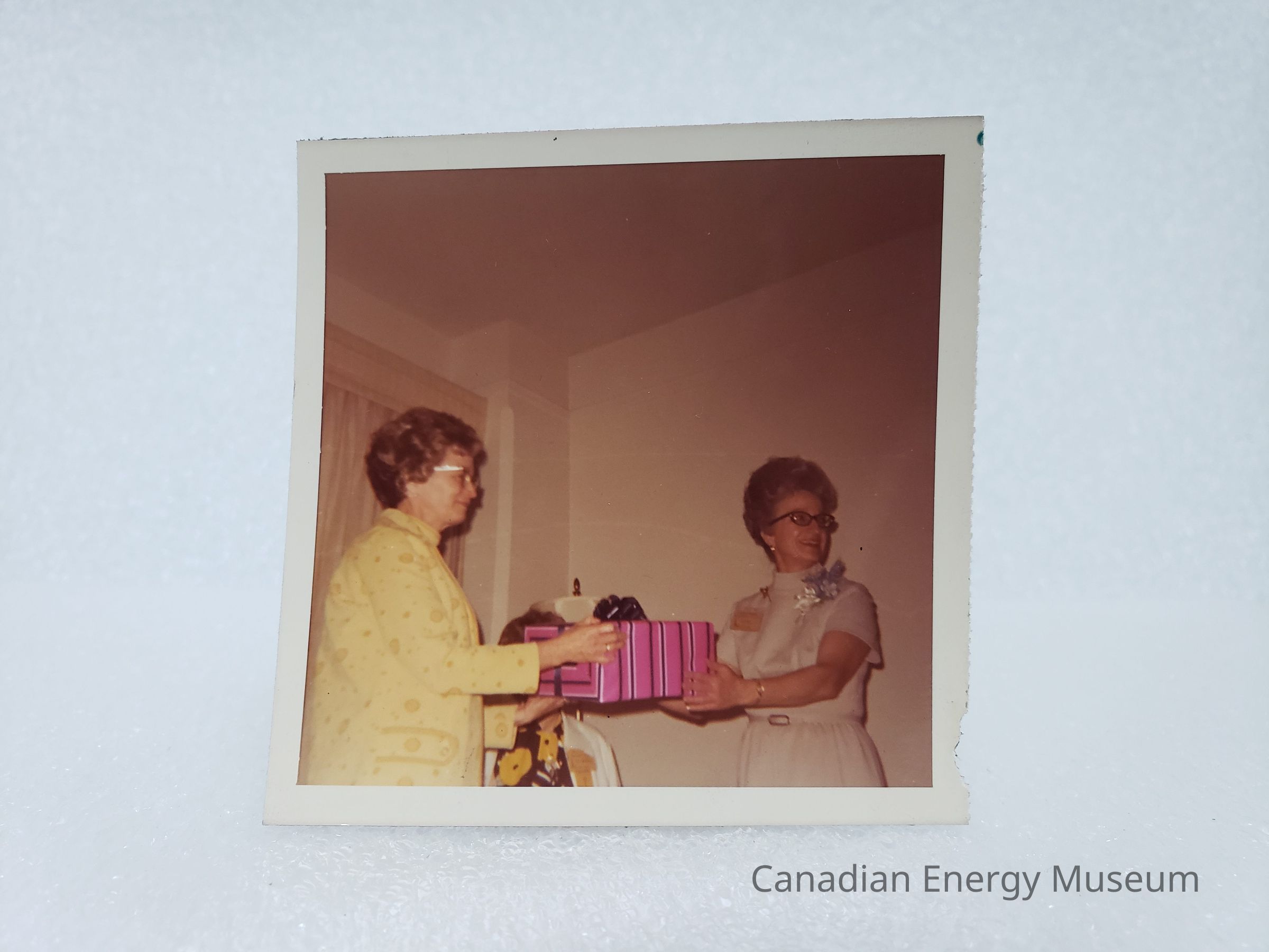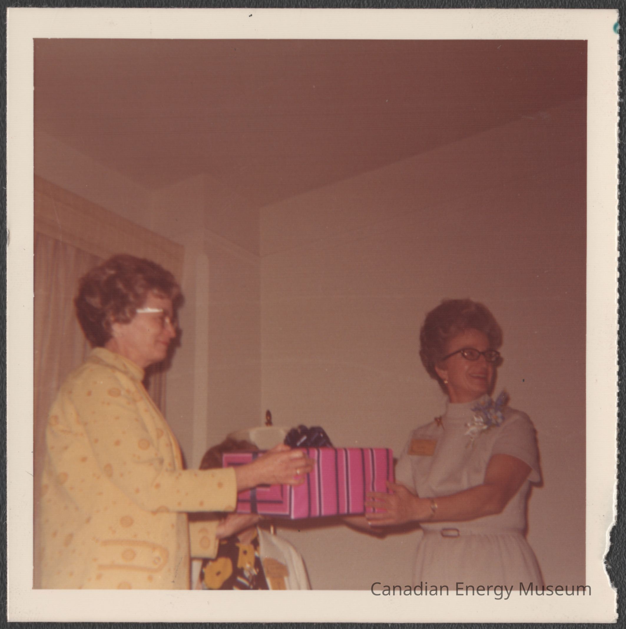 Description: A scene of Lillias Ferguson (ADDC Region VII Director, Edmonton; dressed in a matching pale-yellow circle-design patterned dress and jacket combination) and Elizabeth Pickard (ADDC 1973 Region VII Director, Denver; dressed in a short-sleeved white dress, with blue and white floral corsage, and name tag) exchanging a large wrapped gift (pink and blue stripped) with a blue ribbon on top. Mildred Brennan (ADDC Region VIII Director; dressed in a yellow flower and blue striped dress with a white cardigan over top) can also be partially seen, mostly hidden by Lillias' arm and the gift. Behind them is a white wall with tan-peach curtains.