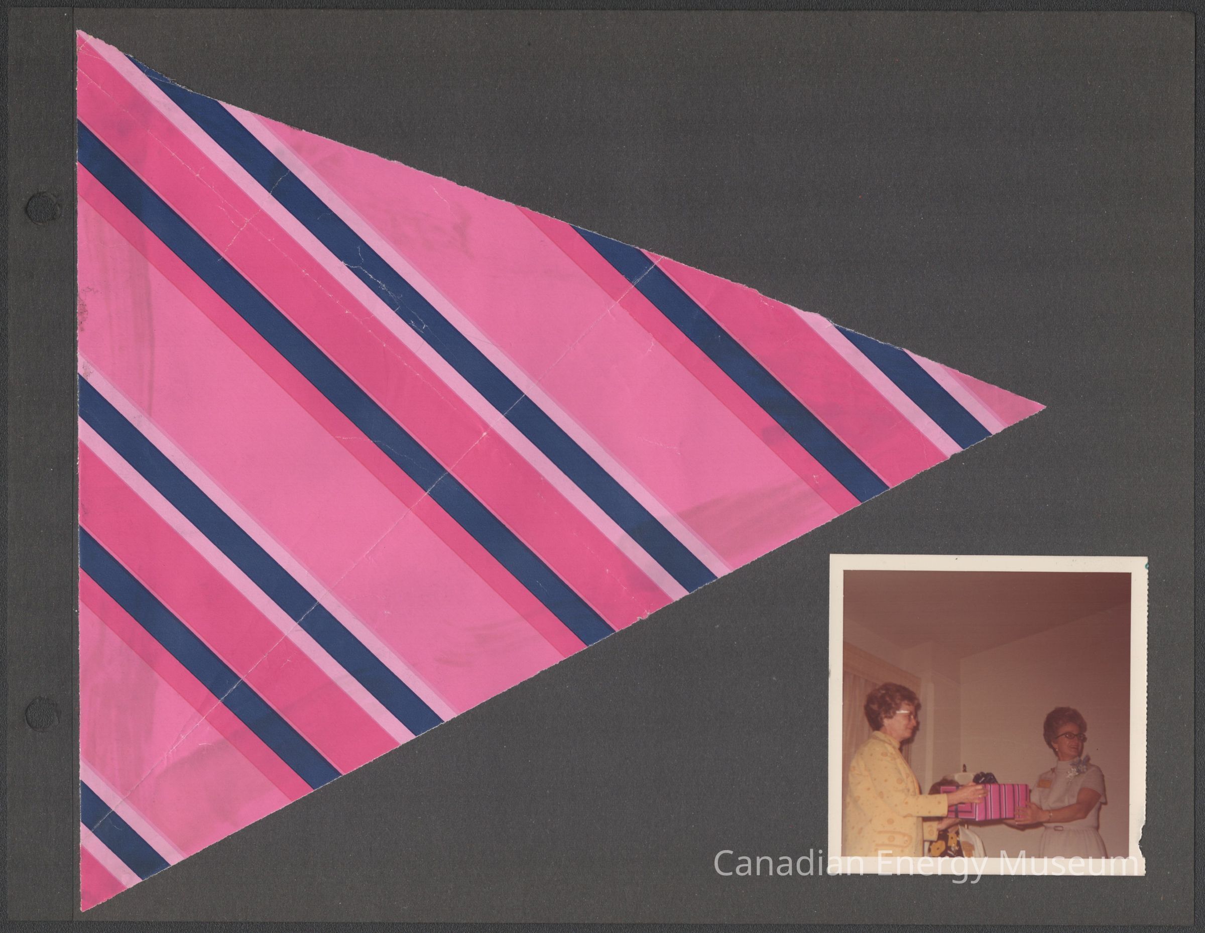 [Photo] Two Ladies with a Pink an Blue Wrapped Gift, Association of Desk and Derrick Clubs, Square, White Border, c.1972Entry/Object ID