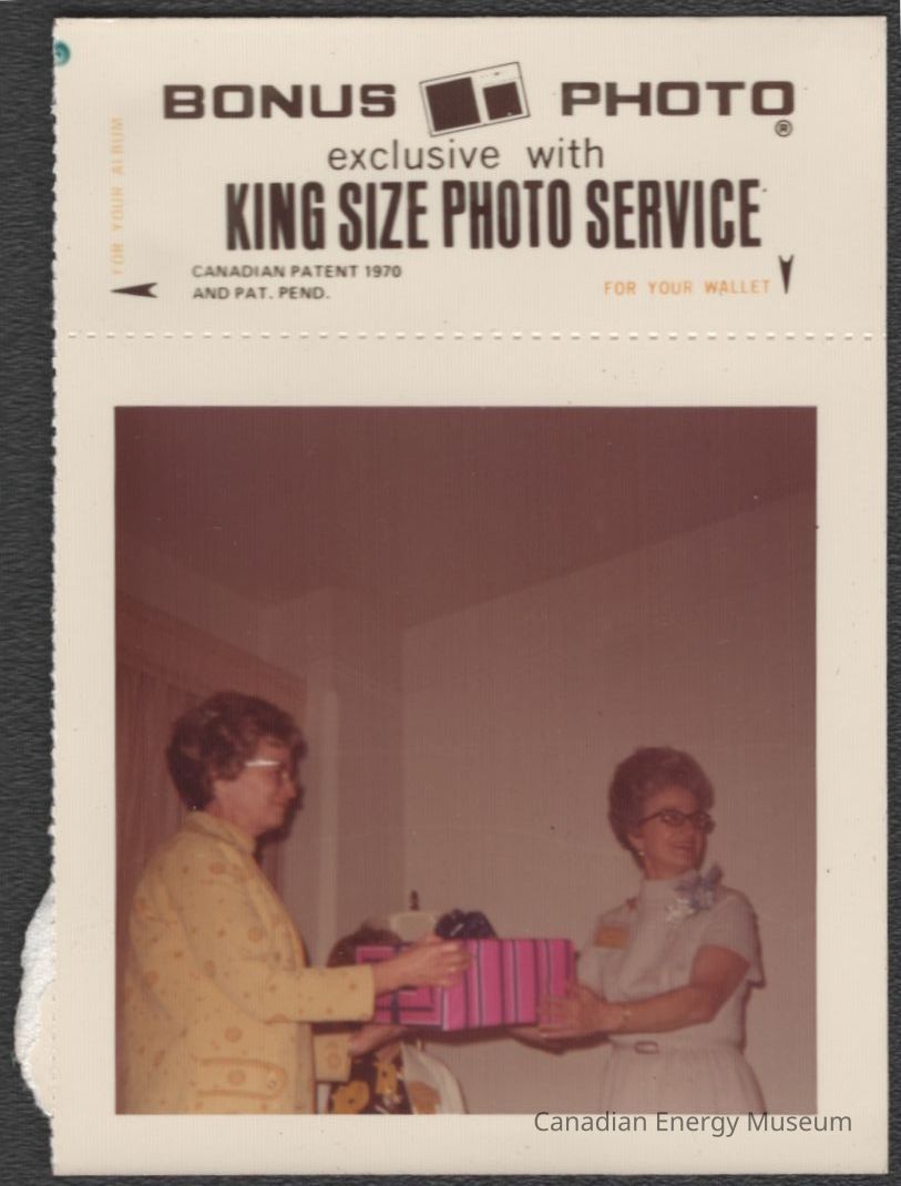 [Photo]Two Ladies with a Pink an Blue Wrapped Gift, "Bonus Photo" Print, Association of Desk and Derrick Clubs, Square, White Border, c.1972Entry/Object ID