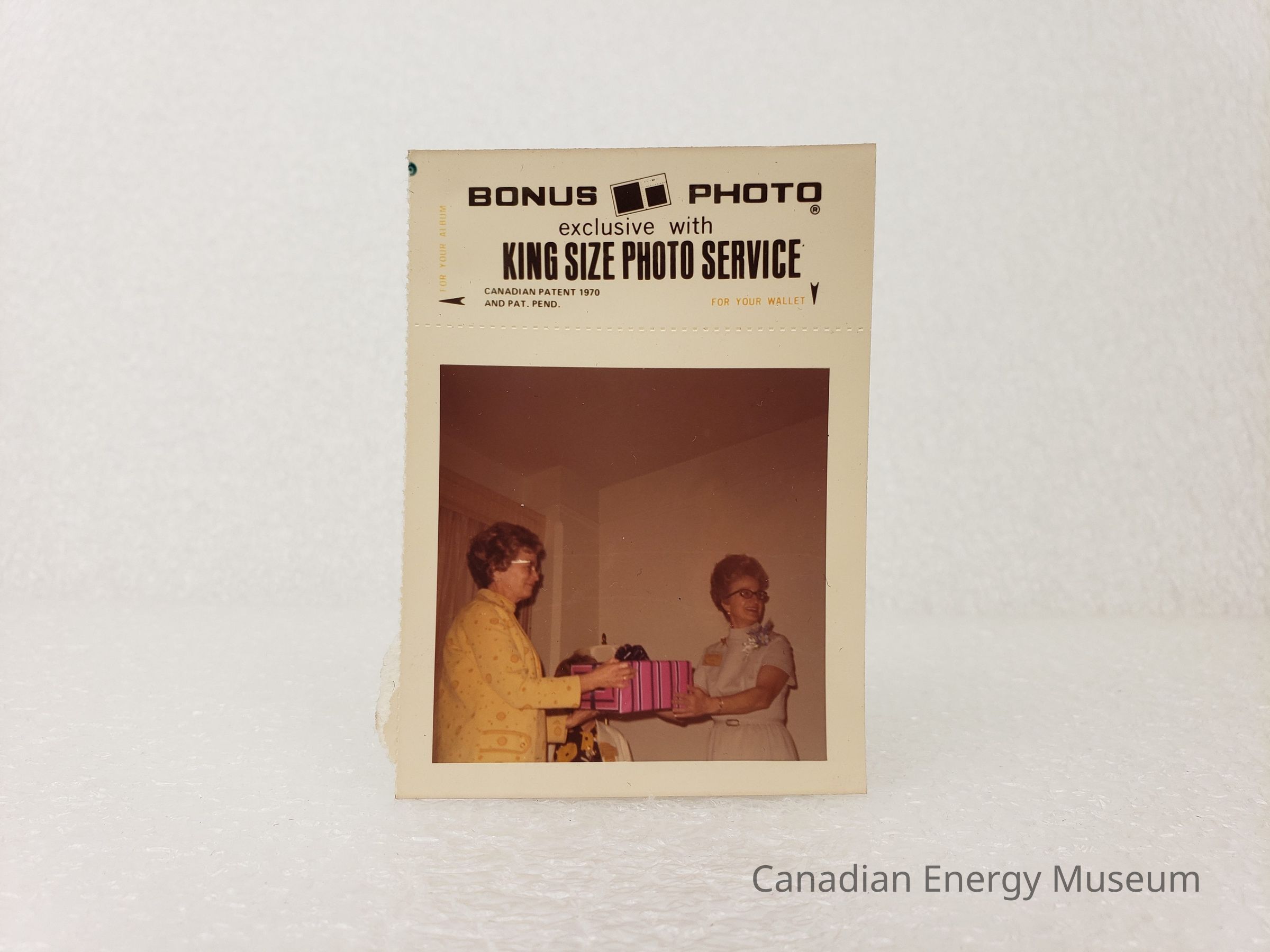 Attached with a tear-away perforation is a section of white photo-paper reading "BONUS PHOTO; exclusive with KING SIZED PHOTO SERVICE; CANADIAN PATENT 1970 AND PAT. PEND.; FOR YOUR WALLET".
