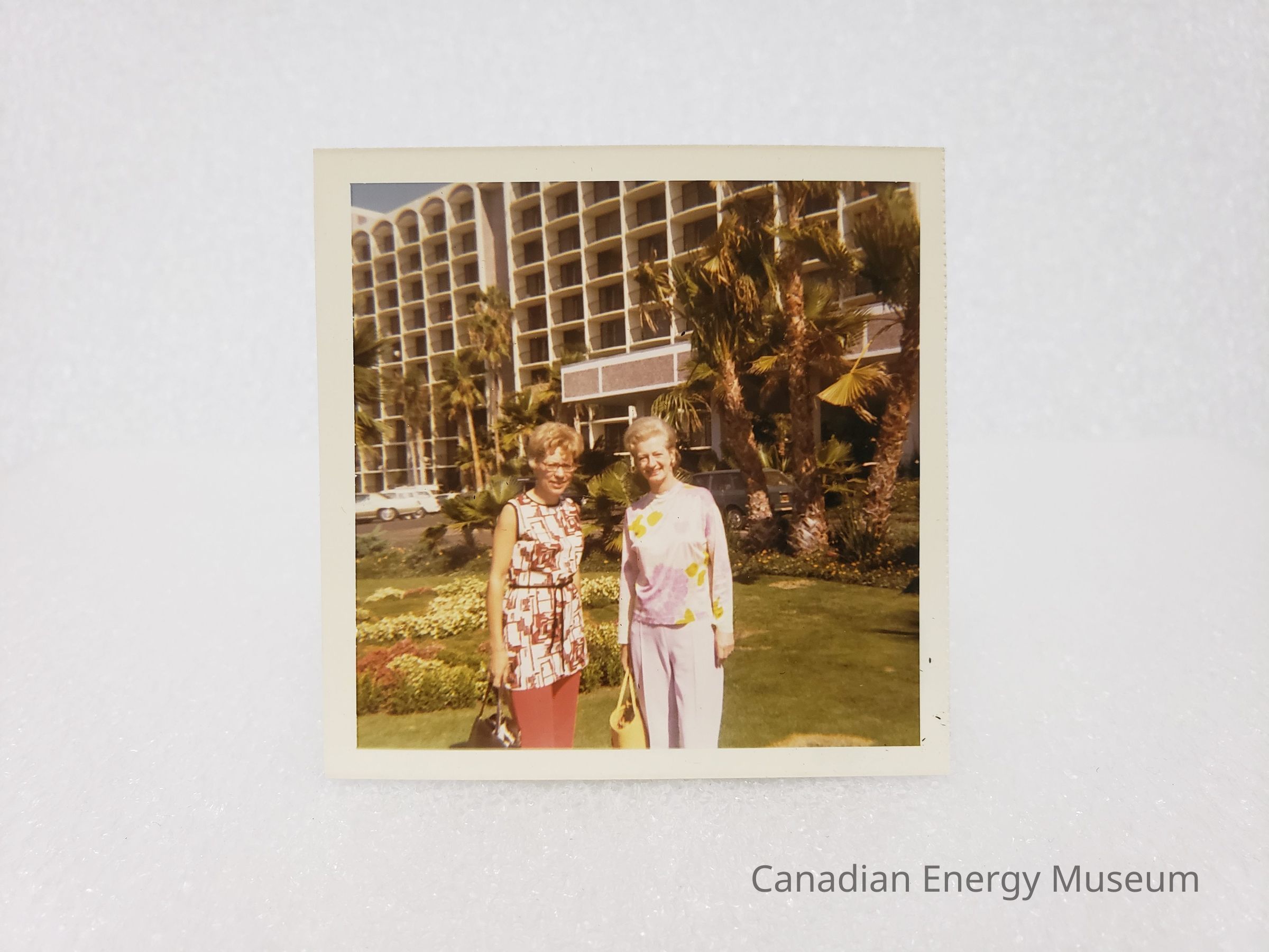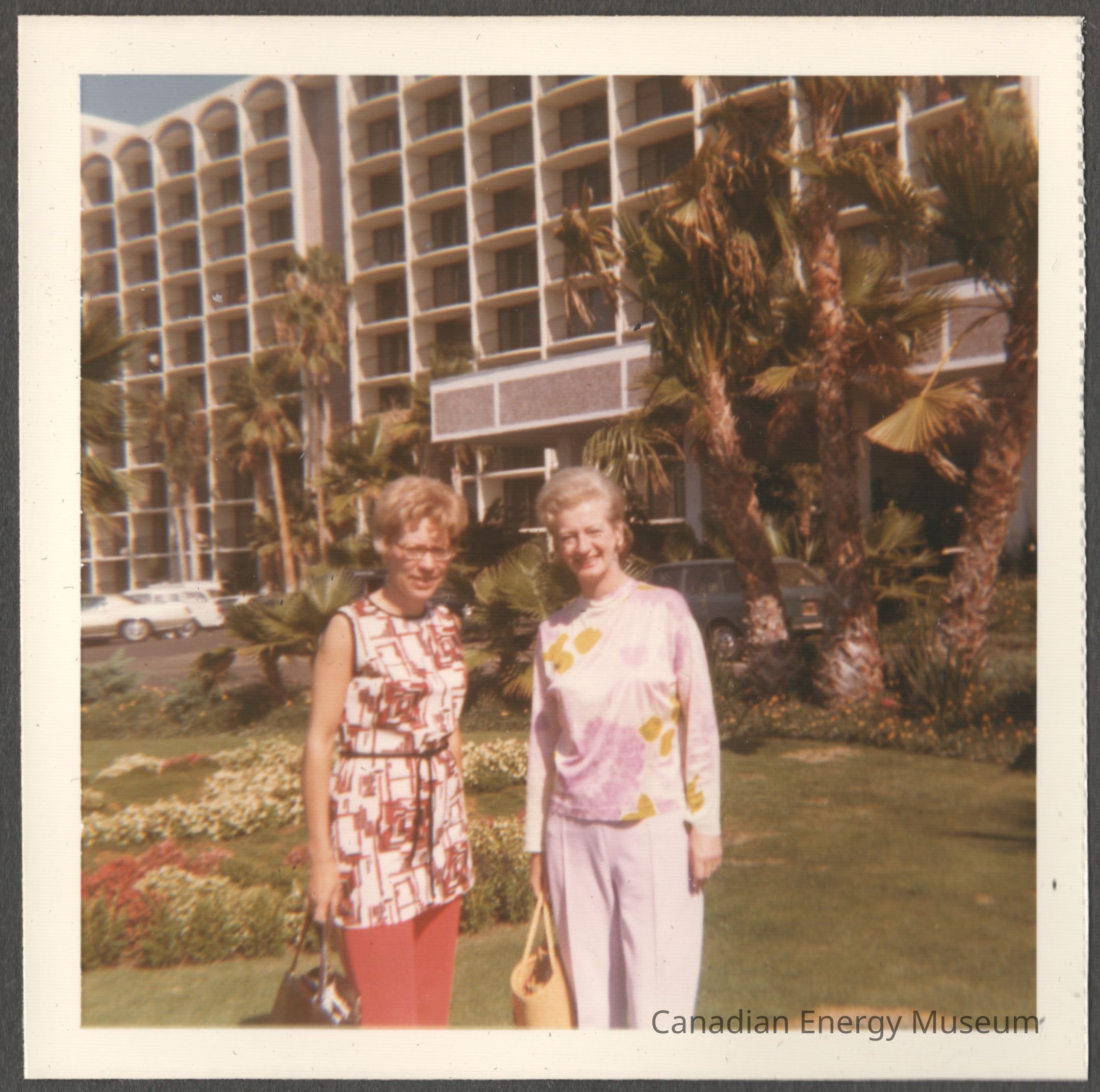 Description: The lady to the right is dressed in pale-pink pants and a pale-pink and yellow flower long-sleeved top, and is holding a tan purse. The lady to the left is dressed in red pants and a long sleeveless red and white geometric-square top with a cord belt, and holding a dark purse. Taken during the Association of Desk and Derrick Clubs of North America's 20th Annual Convention in San Diego.