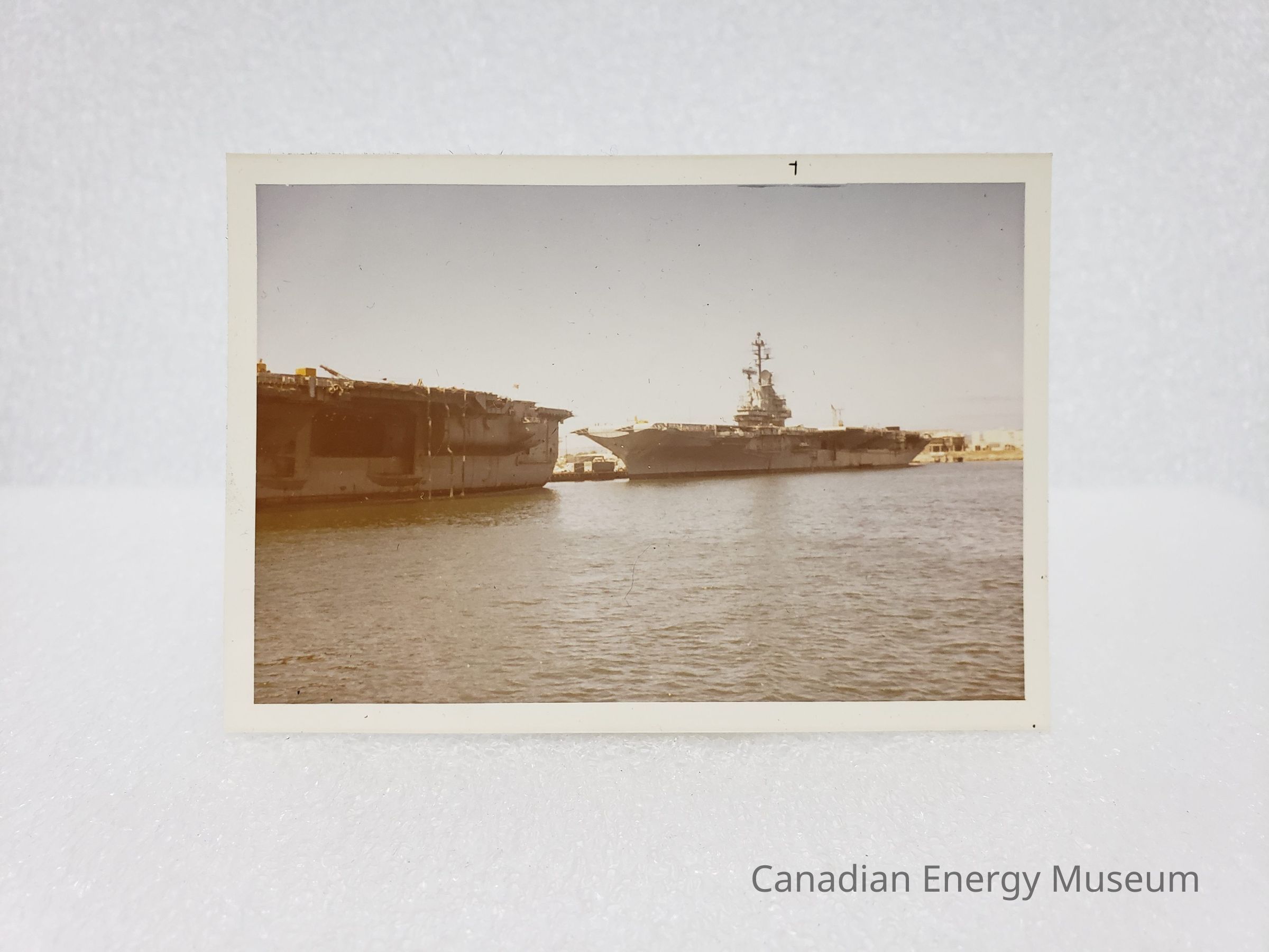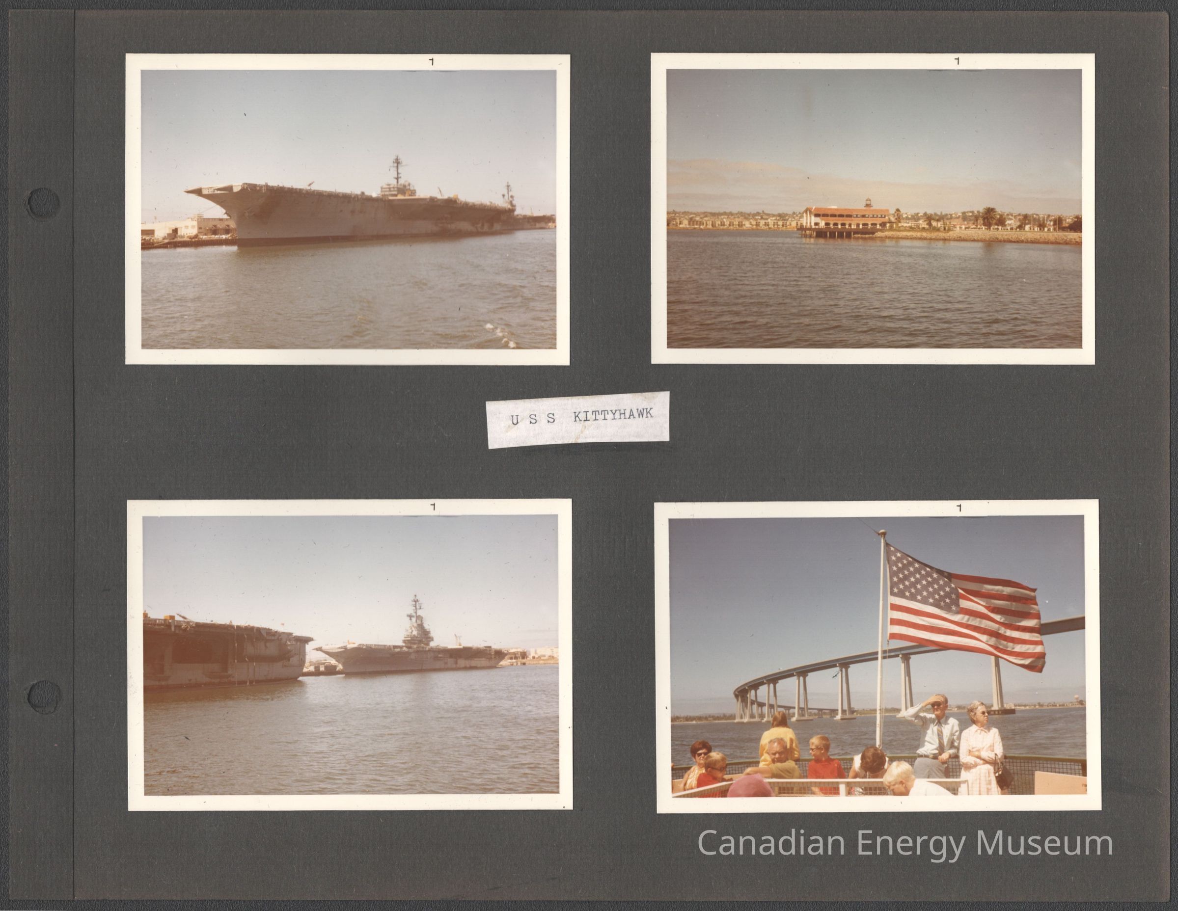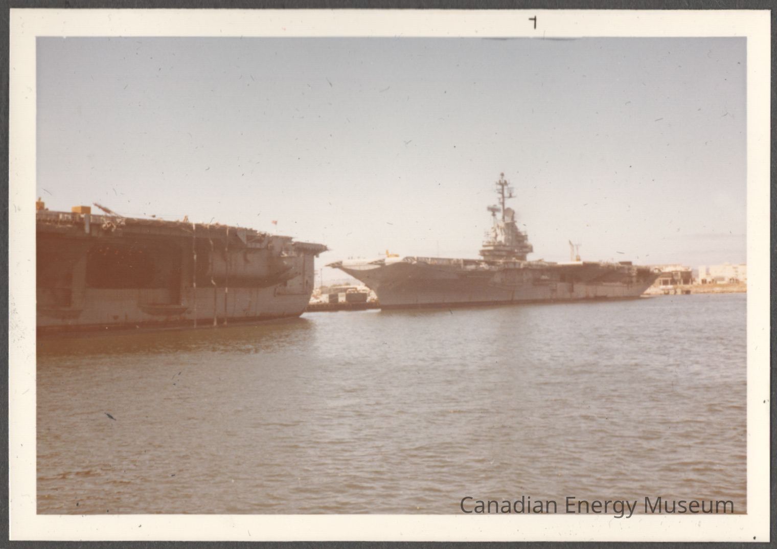 Description: The USS Ticonderoga is docked at what appears to be San Diego, based on accompanying items and historical records (in San Diego prior to its decommissioning in 1973). To the left of the image is the rear end of the USS Kitty Hawk, also in dock. Taken during the 1971 Association of Desk and Derrick Clubs of North America's 20th Annual Convention in San Diego.