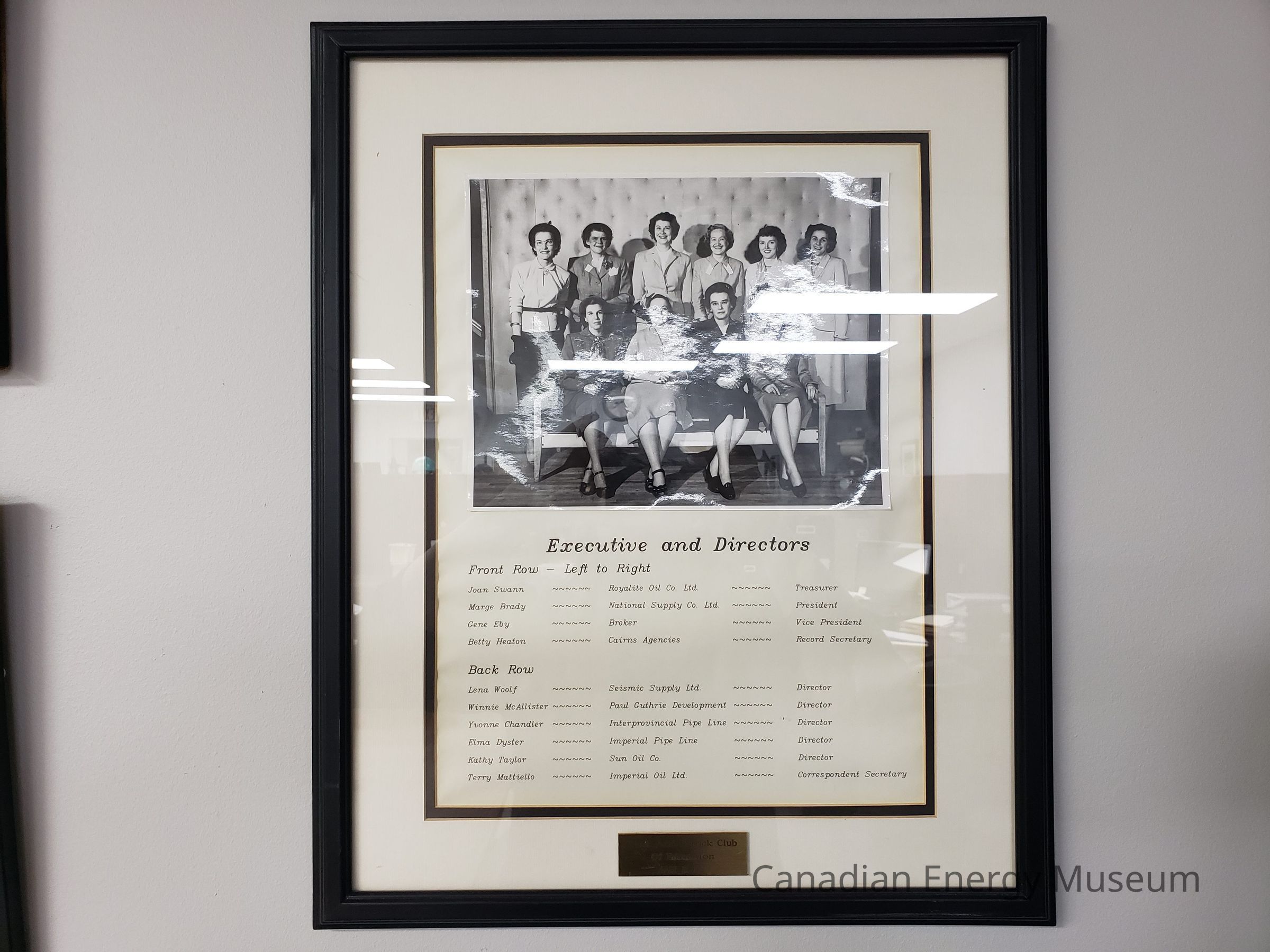 A black and white photograph of the Executive and Directors of the Desk and Derrick Club of Edmonton, taken April 18, 1951. Framed with names of those present.Collection