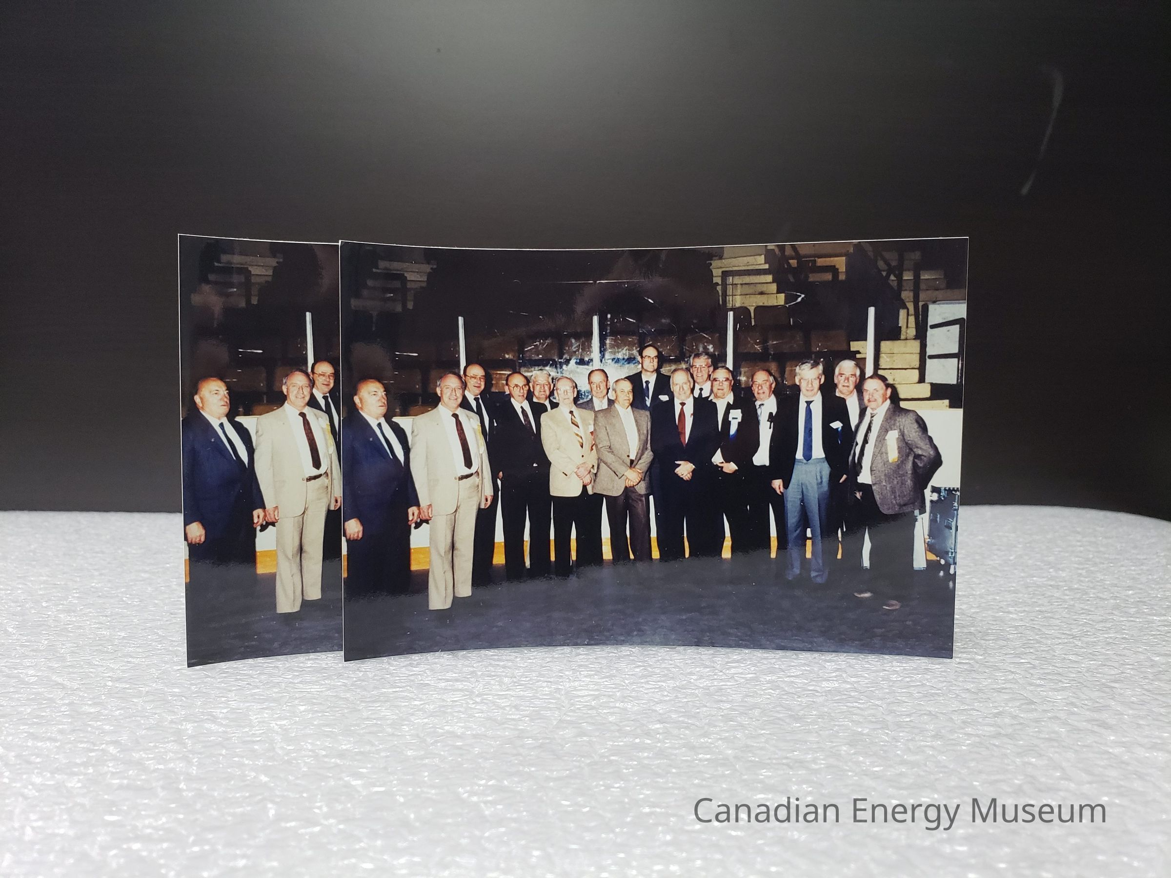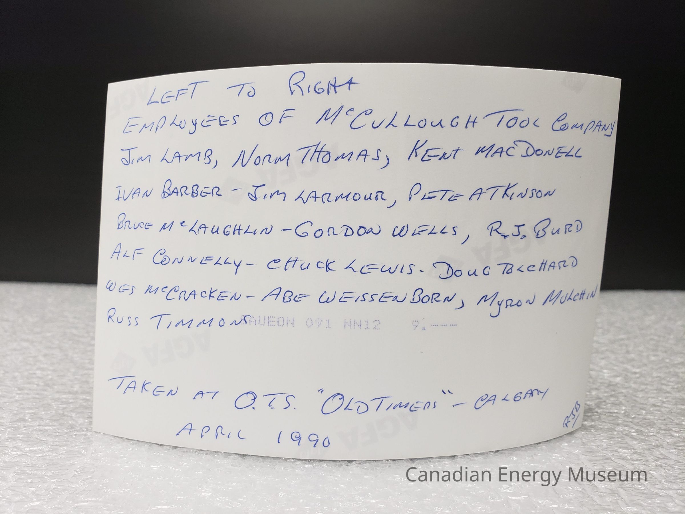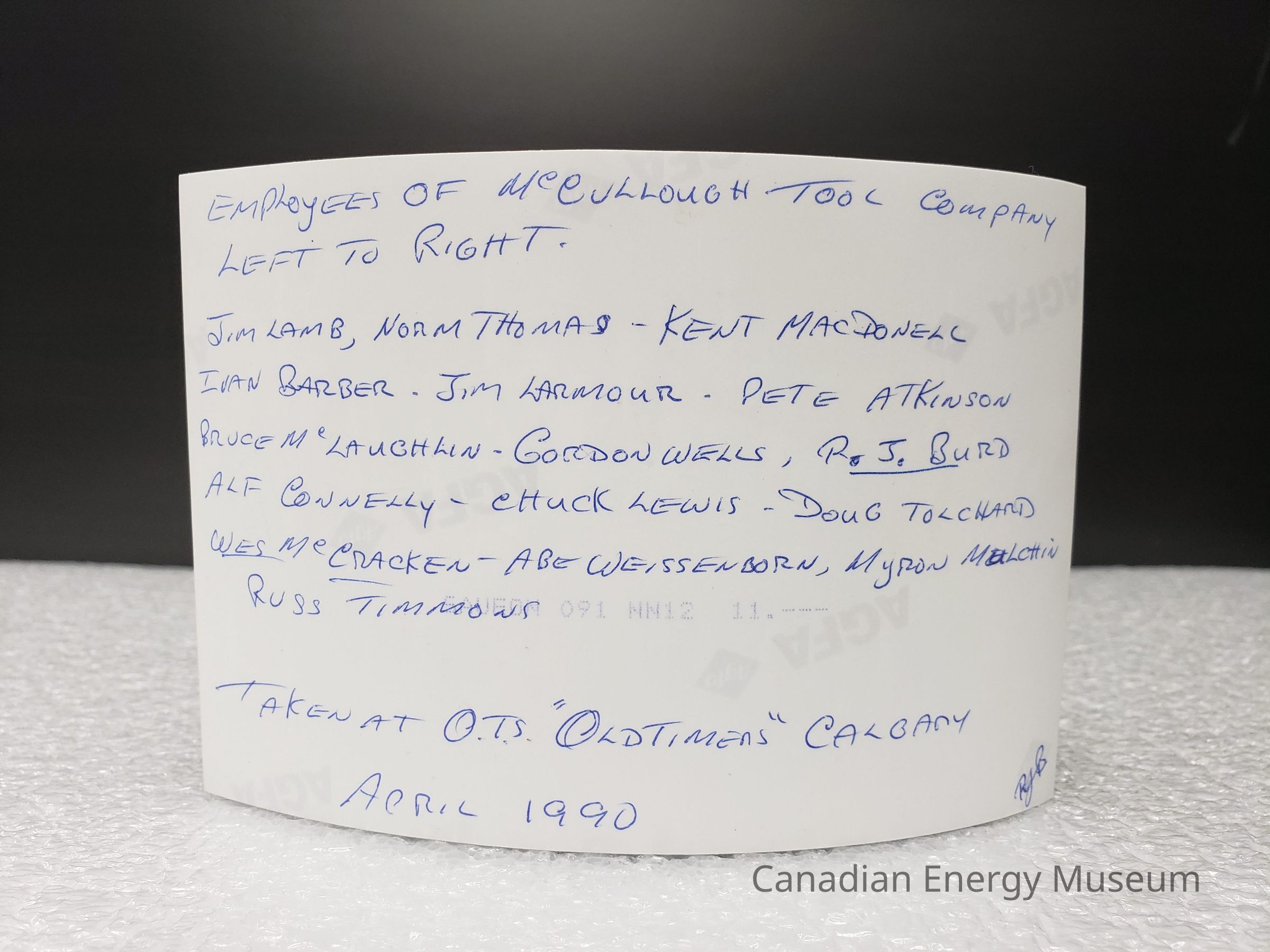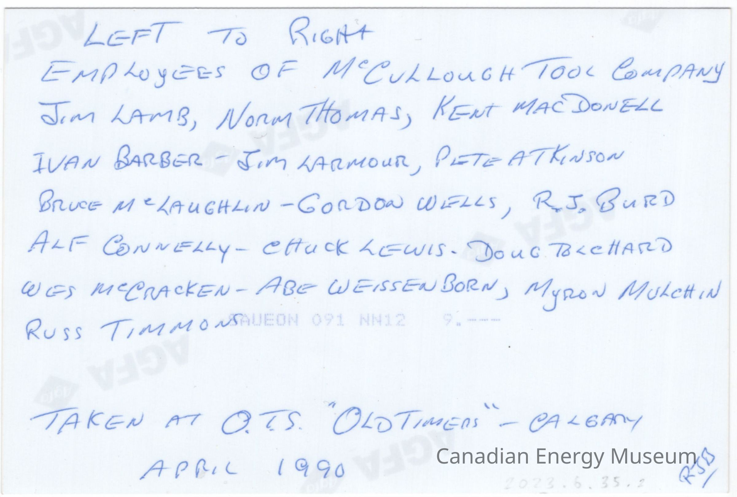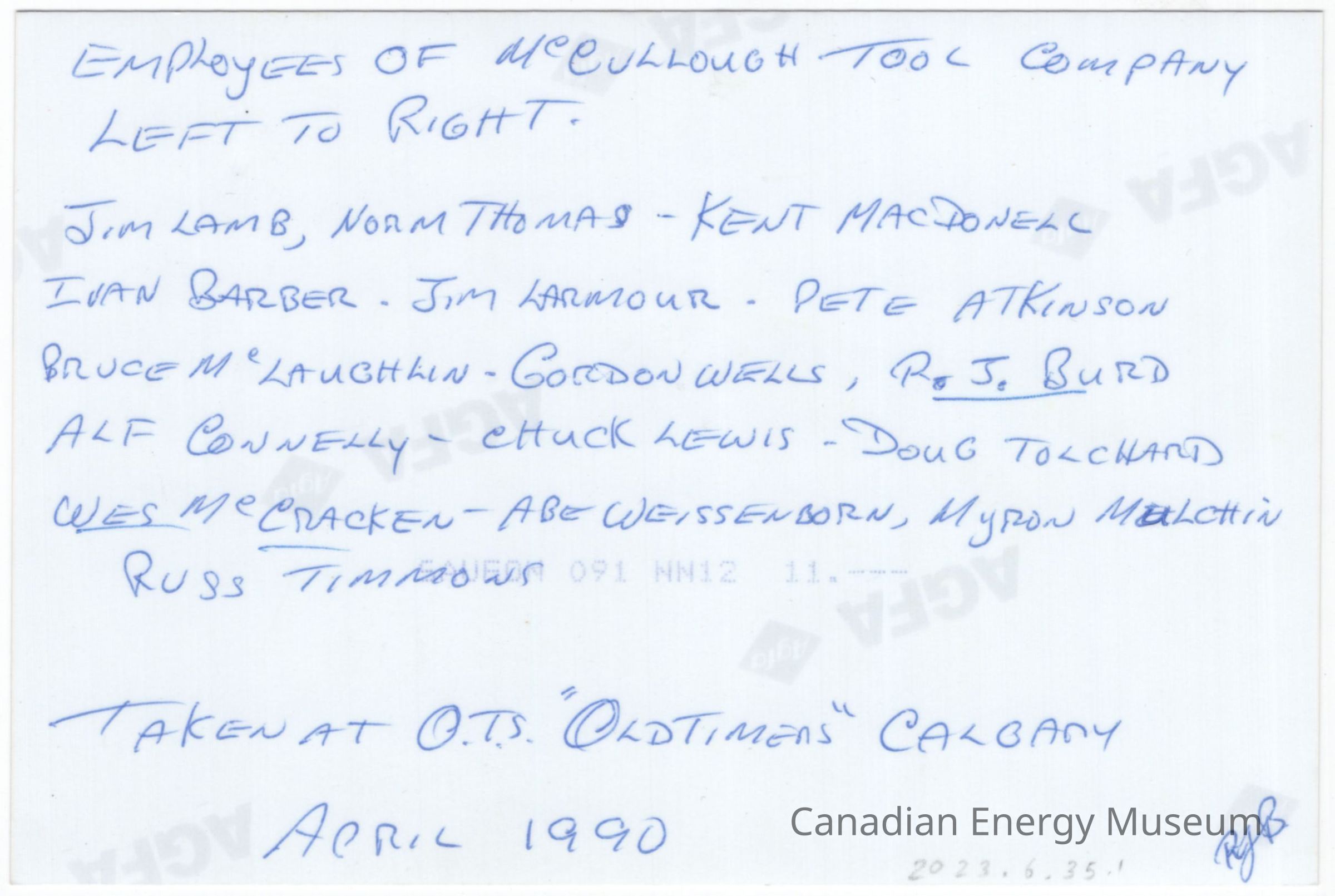 Reverse Copy #1: "EMPLOYEES OF MCCULLOUGH TOOL COMPANY; LEFT TO RIGHT; JIM LAMB, NOAM THOMAS, KENT MACDONELL, IVAN BARBER, JIM LARMOUR, PETE ATKINSON, BRUCE MCLAUGHKIN, GORDON WELLS, R.J. BURD, ALF CONNELLY, CHUCK LEWIS, DOUG TOLCHARD, WES MCCRACKEN, ABE WEISSENBORN, MYRON MULCHIN, RUSS TIMMONS; TAKEN AT O.T.S "OLDTIMERS"—CALGARY; APRIL 1990; RJB".