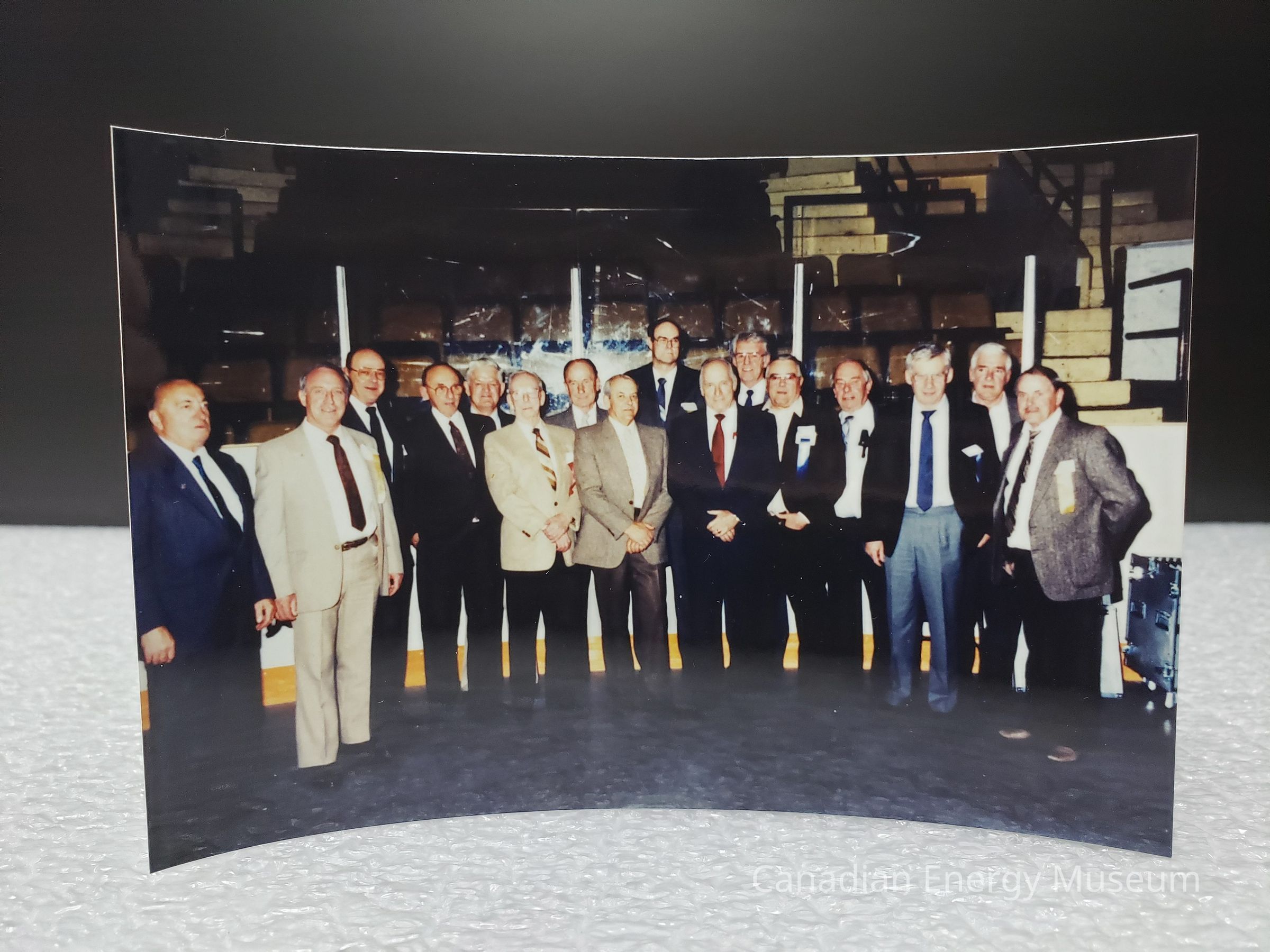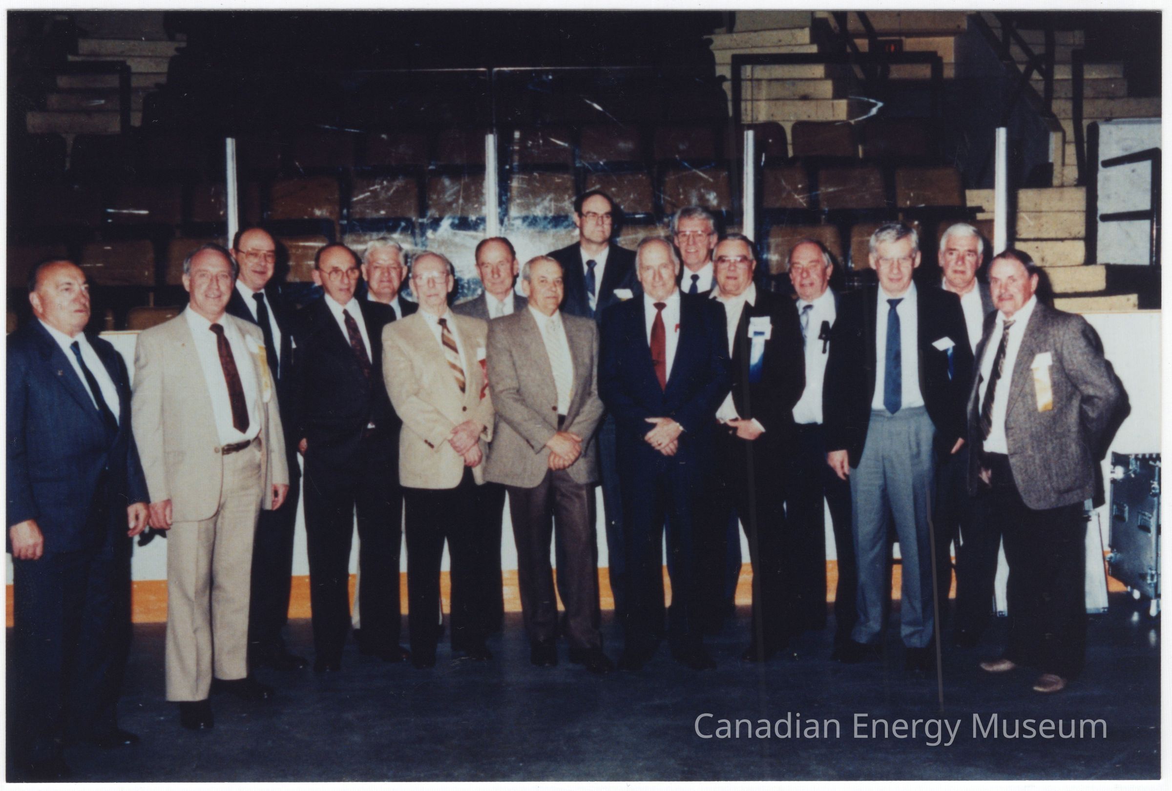 Image Description: Group of 16 men standing together for a portrait. Men are all dressed in blazers and ties (black, blue, grey, and tan blazers). Group are standing on the floor of a hockey rink, with the barriers and stands visible in the background.