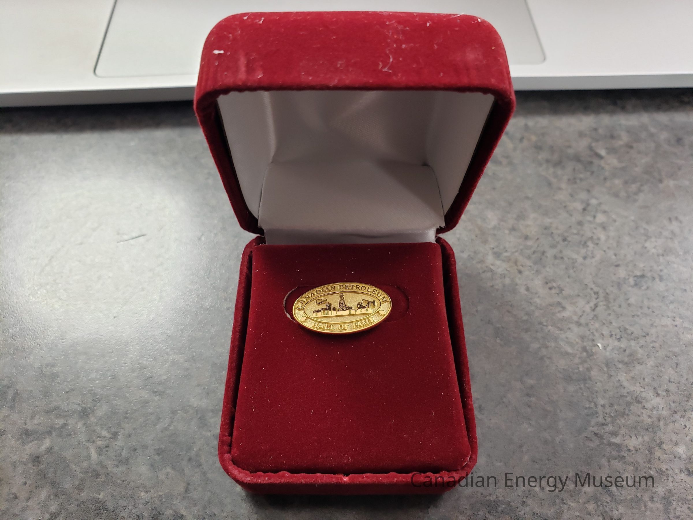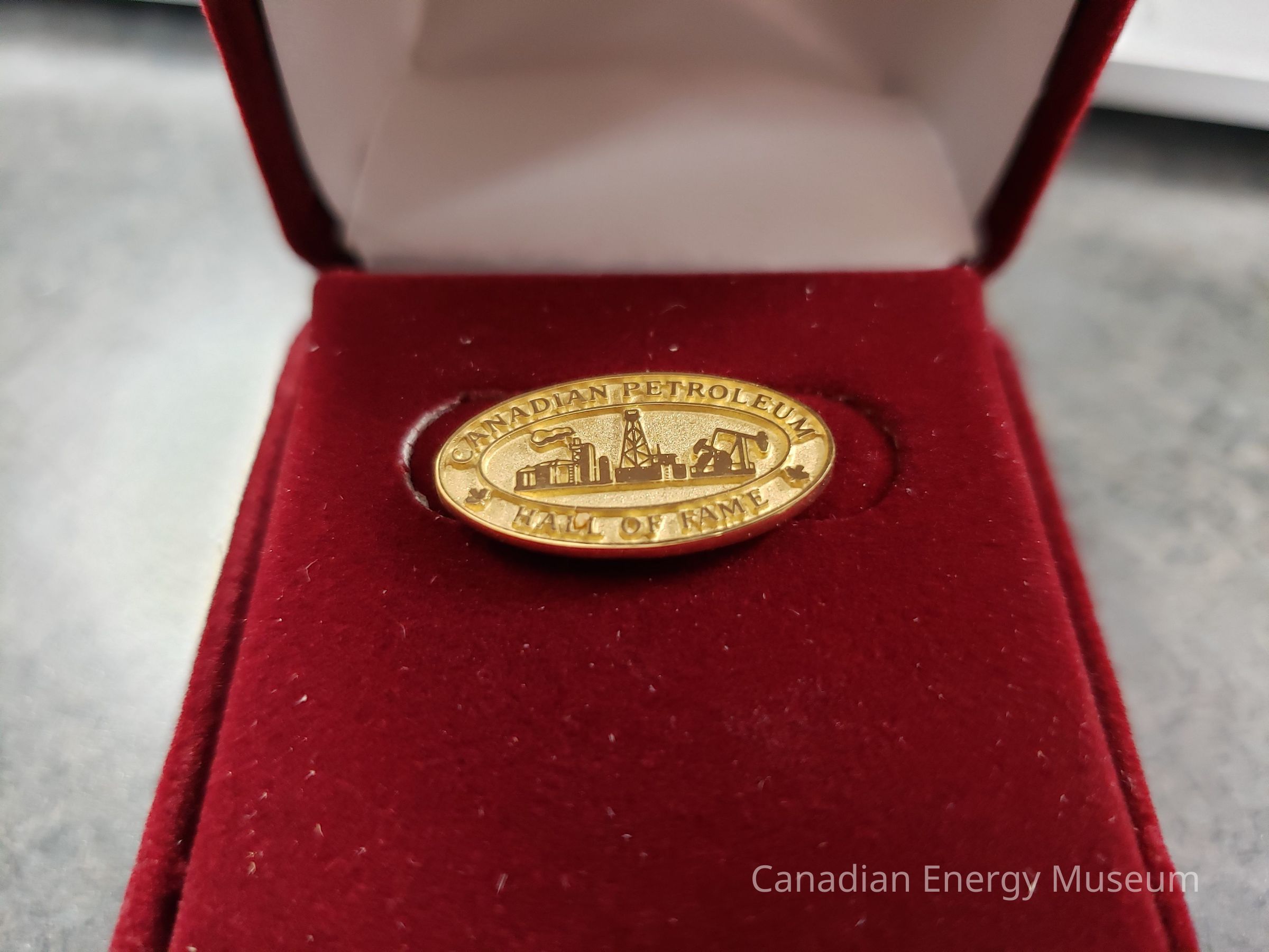 A gold lapel pin, branded to the Canadian Petroleum Hall of Fame. Oval, with text around the exterior and oil drilling imagery in the centre. Inside a red velvet ring box.Collection